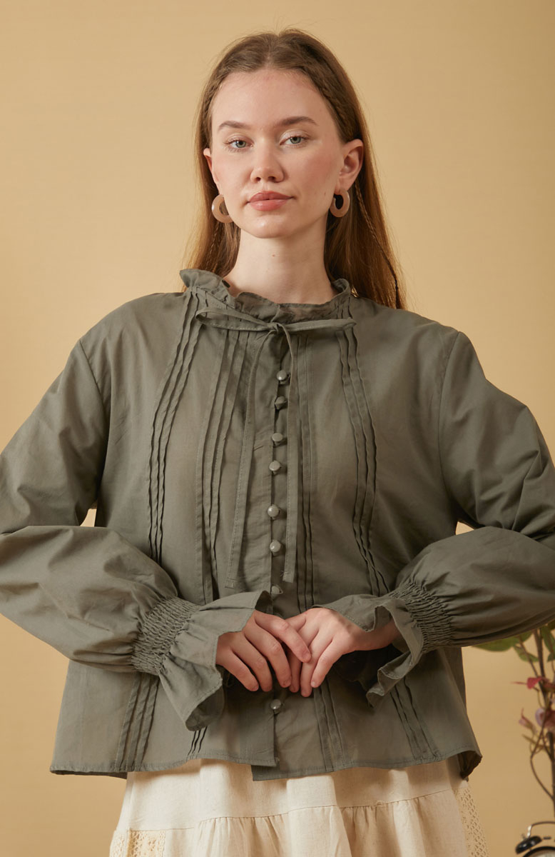 Yakası Bağcıklı Nervürlü Gömlek Haki, vual kumaştan üretilen bu gömlek, nefes alabilen yapısıyla konfor sunar. Yaka kısmındaki fırfır ve bağlama detayları, önündeki nervür detayı ve biye düğmelerle şık bir görünüm oluşturur. Rahat kesimiyle hem günlük hem de özel anlar için idealdir..