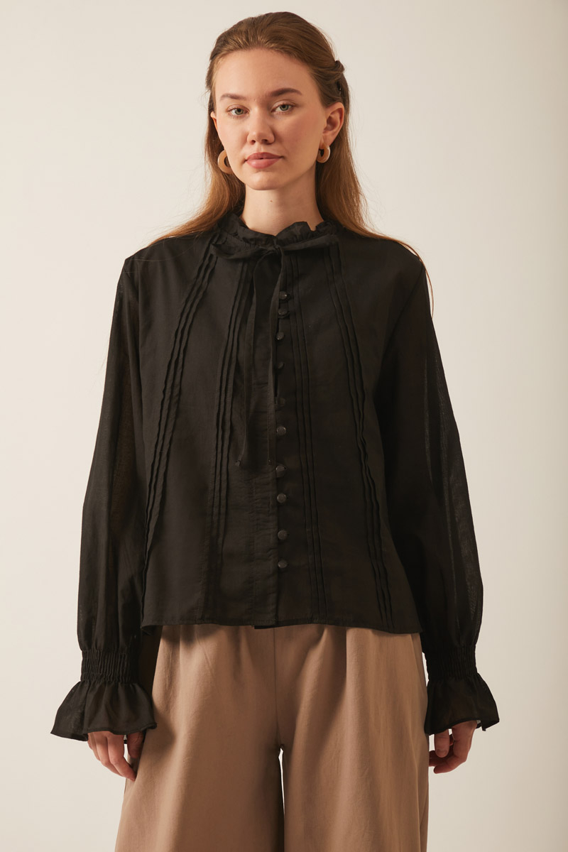 Yakası Bağcıklı Nervürlü Gömlek Siyah, vual kumaştan üretilen bu gömlek, nefes alabilen yapısıyla konfor sunar. Yaka kısmındaki fırfır ve bağlama detayları, önündeki nervür detayı ve biye düğmelerle şık bir görünüm oluşturur. Rahat kesimiyle hem günlük hem de özel anlar için idealdir..