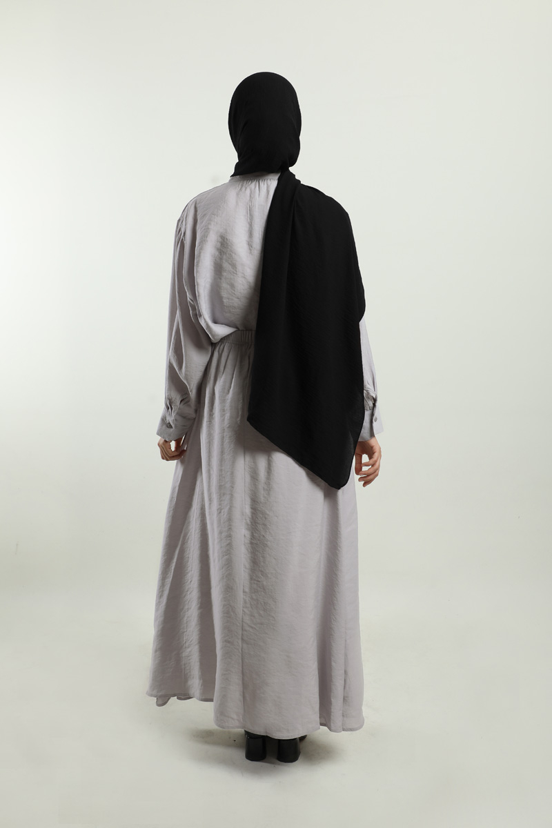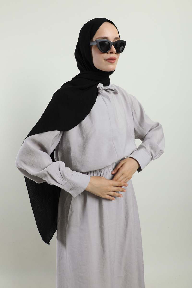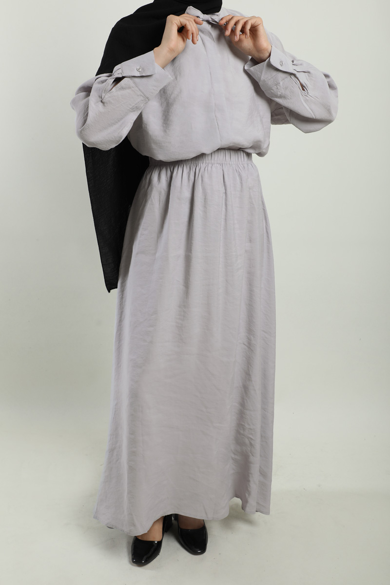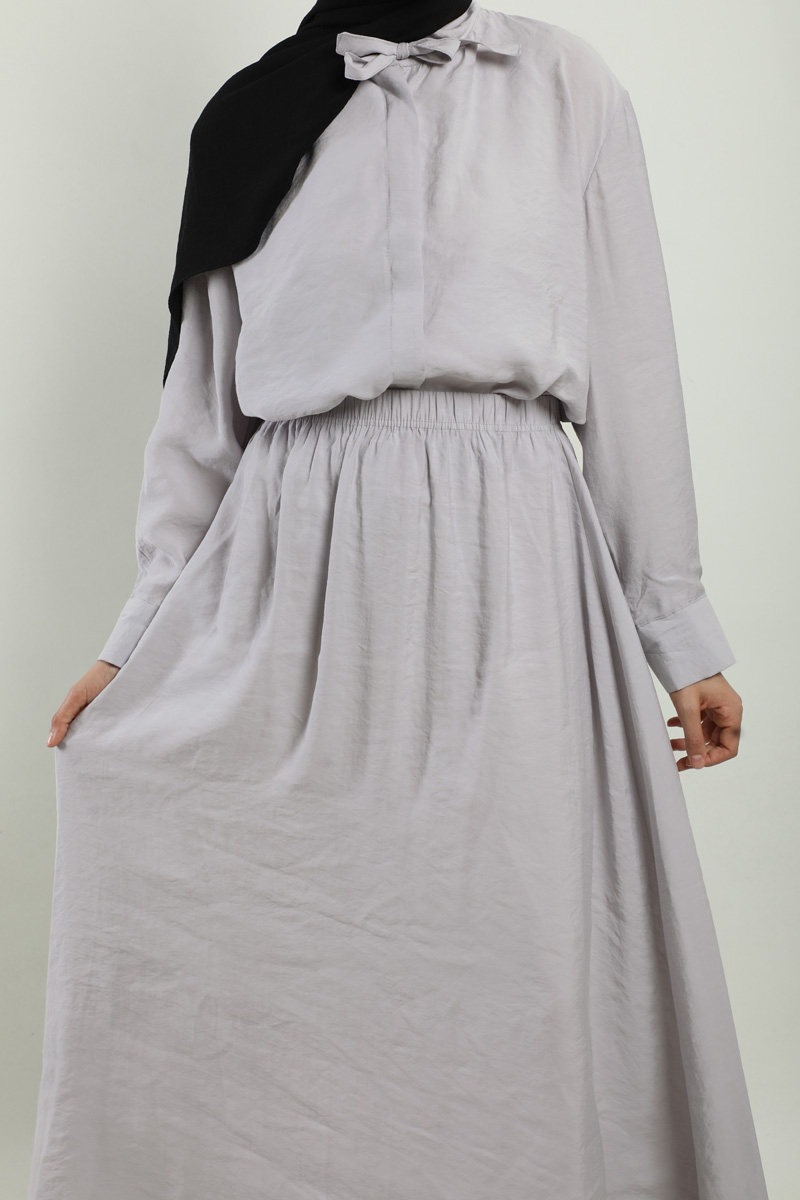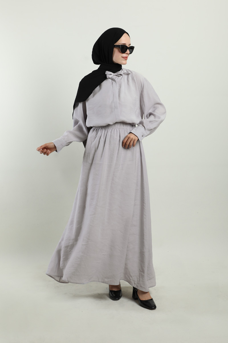 Yakası Bağlamalı Etek Takım Açık Gri. Gömlek hakim yakalıdır, yaka kısmından bağlamalıdır, gizli düğmelidir. Etek beli lastiklidir, astarsızdır, cepsizdir, yaz mevsimi için uygundur.