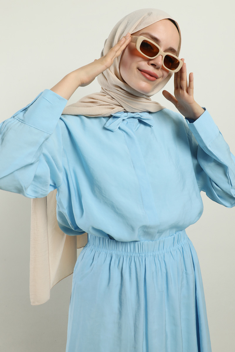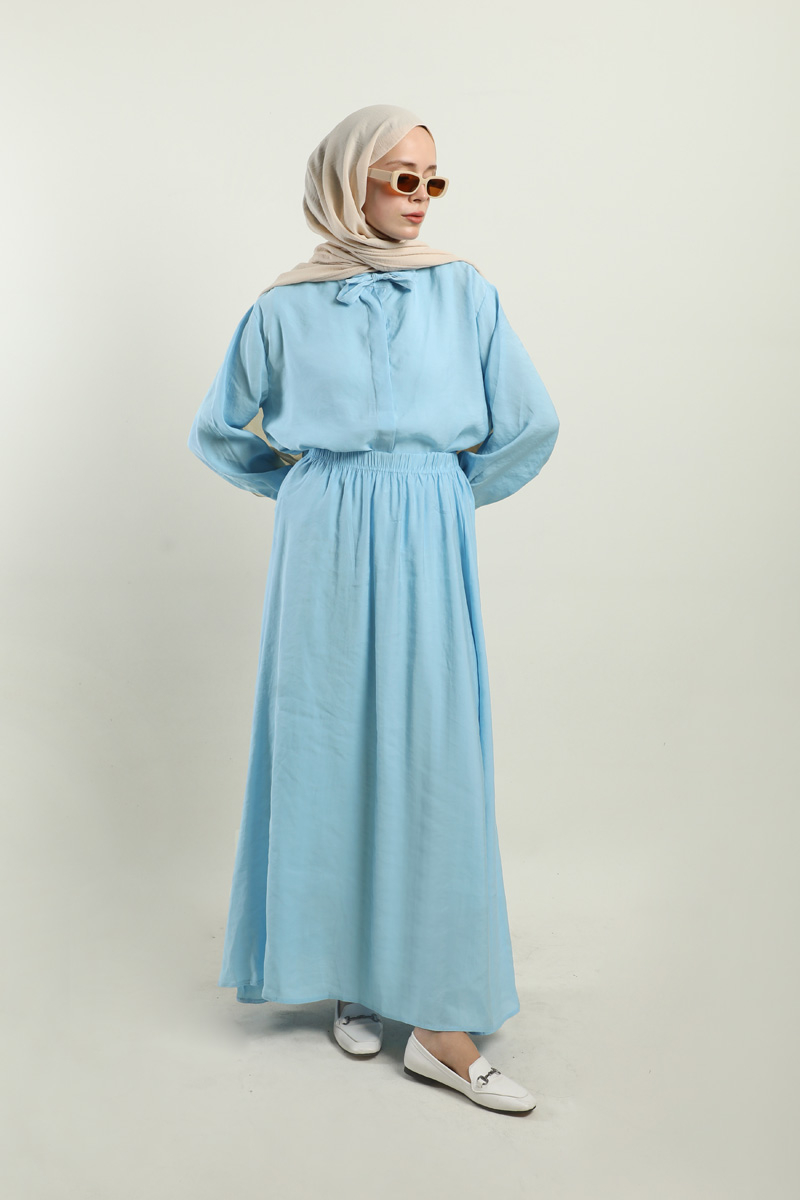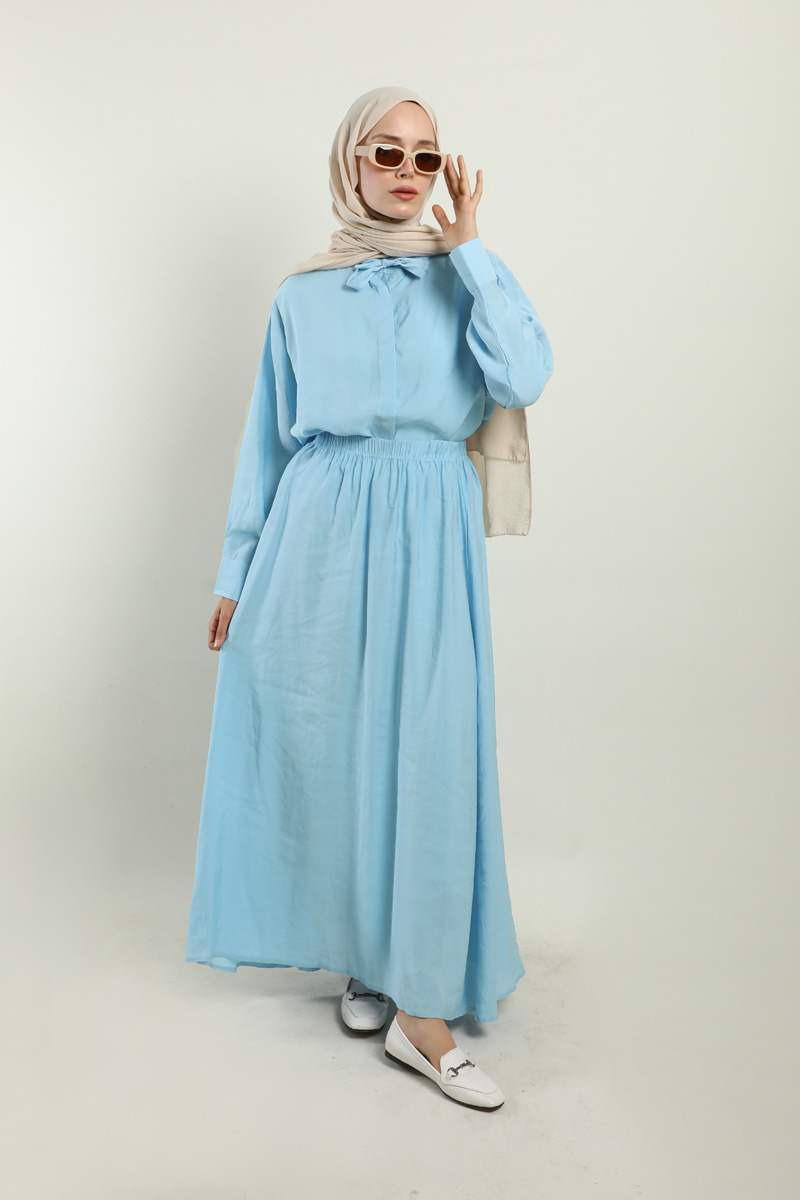 Yakası Bağlamalı Etek Takım Bebe Mavisi. Gömlek hakim yakalıdır, yaka kısmından bağlamalıdır, gizli düğmelidir. Etek beli lastiklidir, astarsızdır, cepsizdir, yaz mevsimi için uygundur.