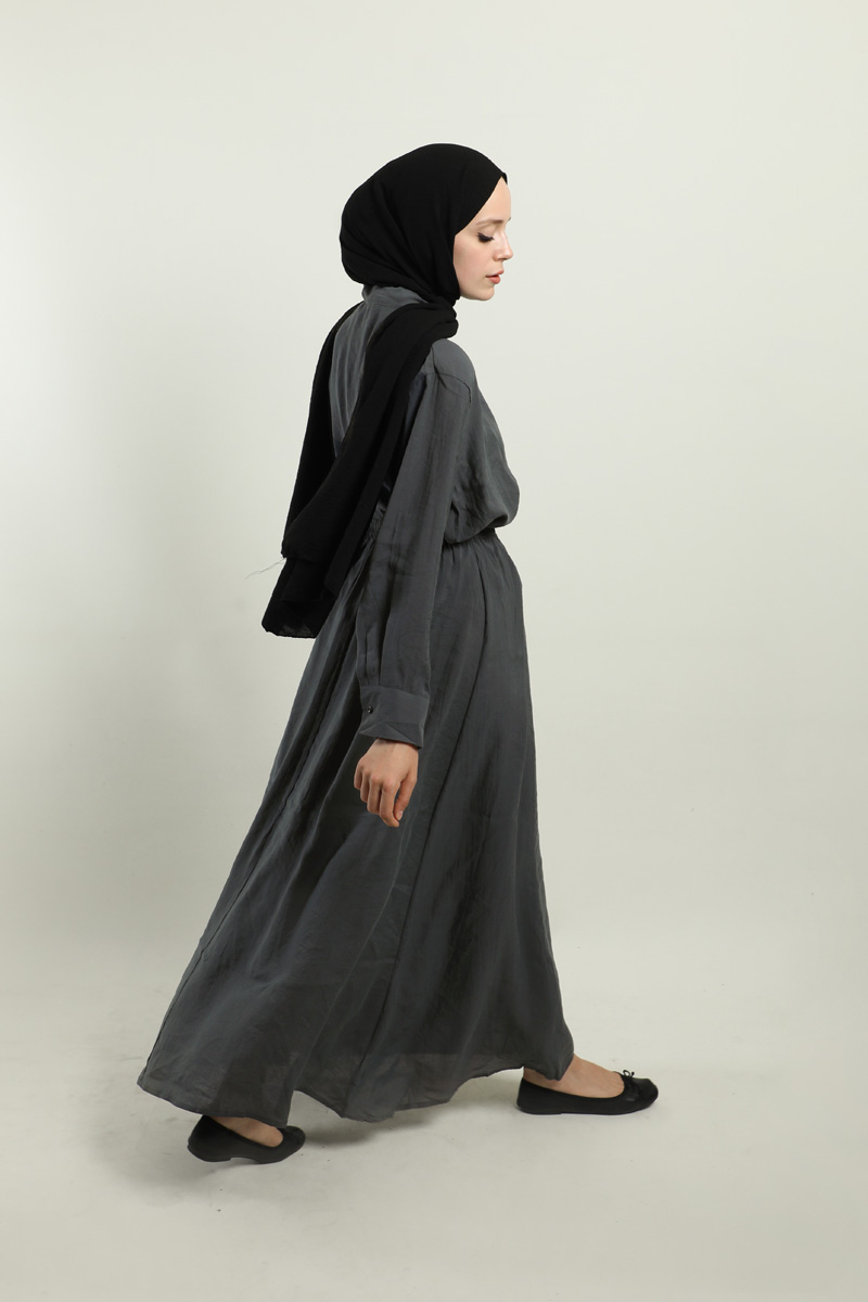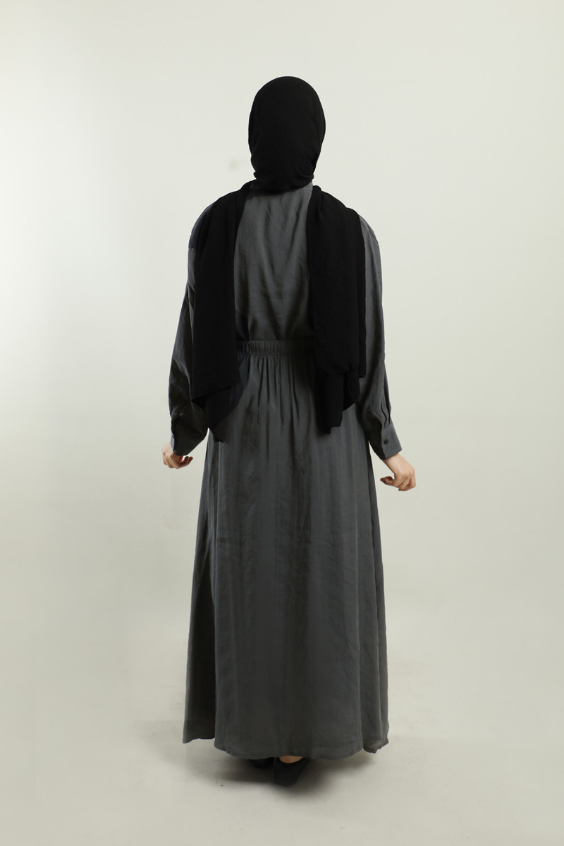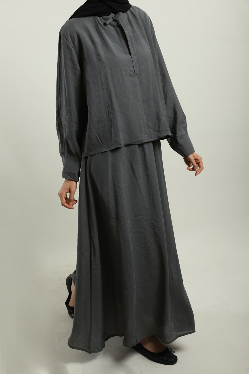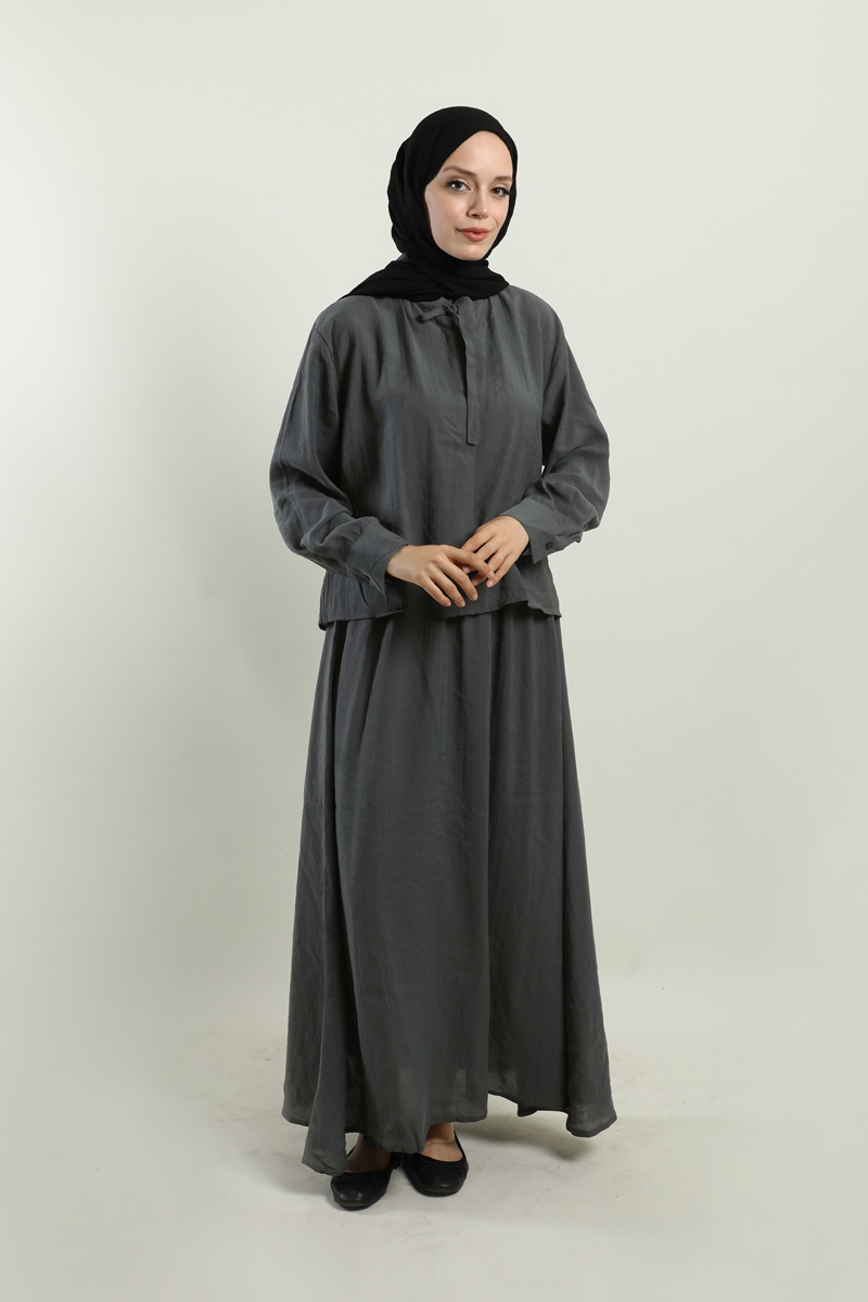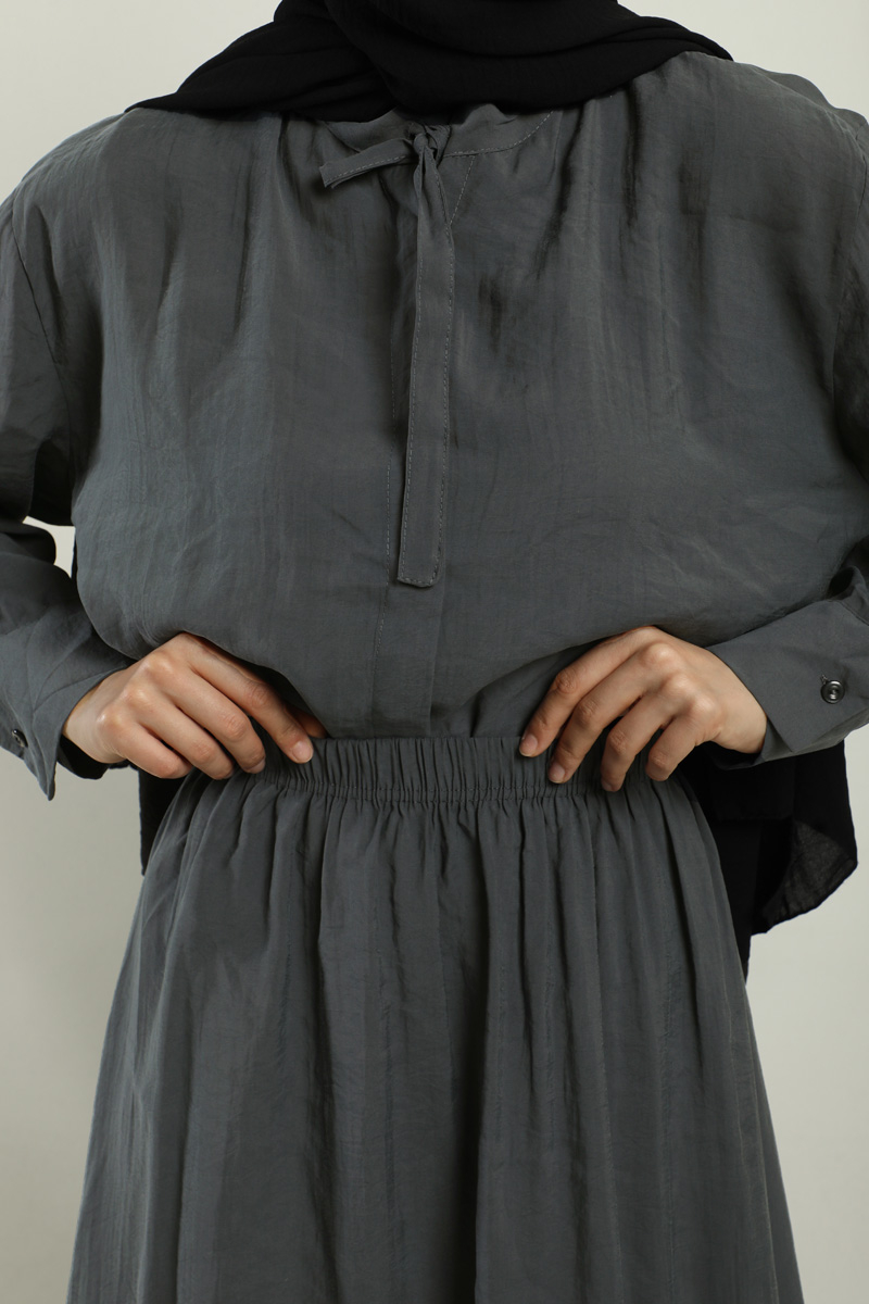 Yakası Bağlamalı Etek Takım Füme. Gömlek hakim yakalıdır, yaka kısmından bağlamalıdır, gizli düğmelidir. Etek beli lastiklidir, astarsızdır, cepsizdir, yaz mevsimi için uygundur.