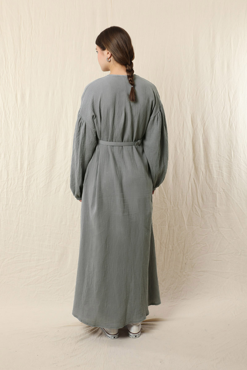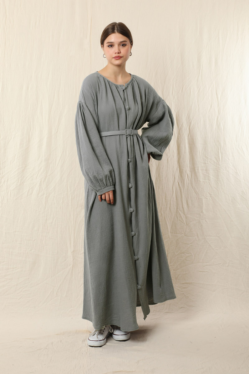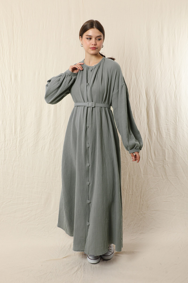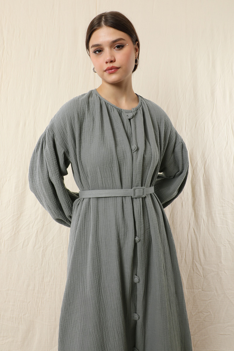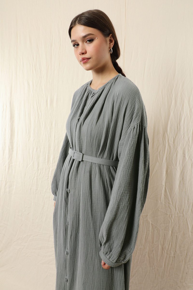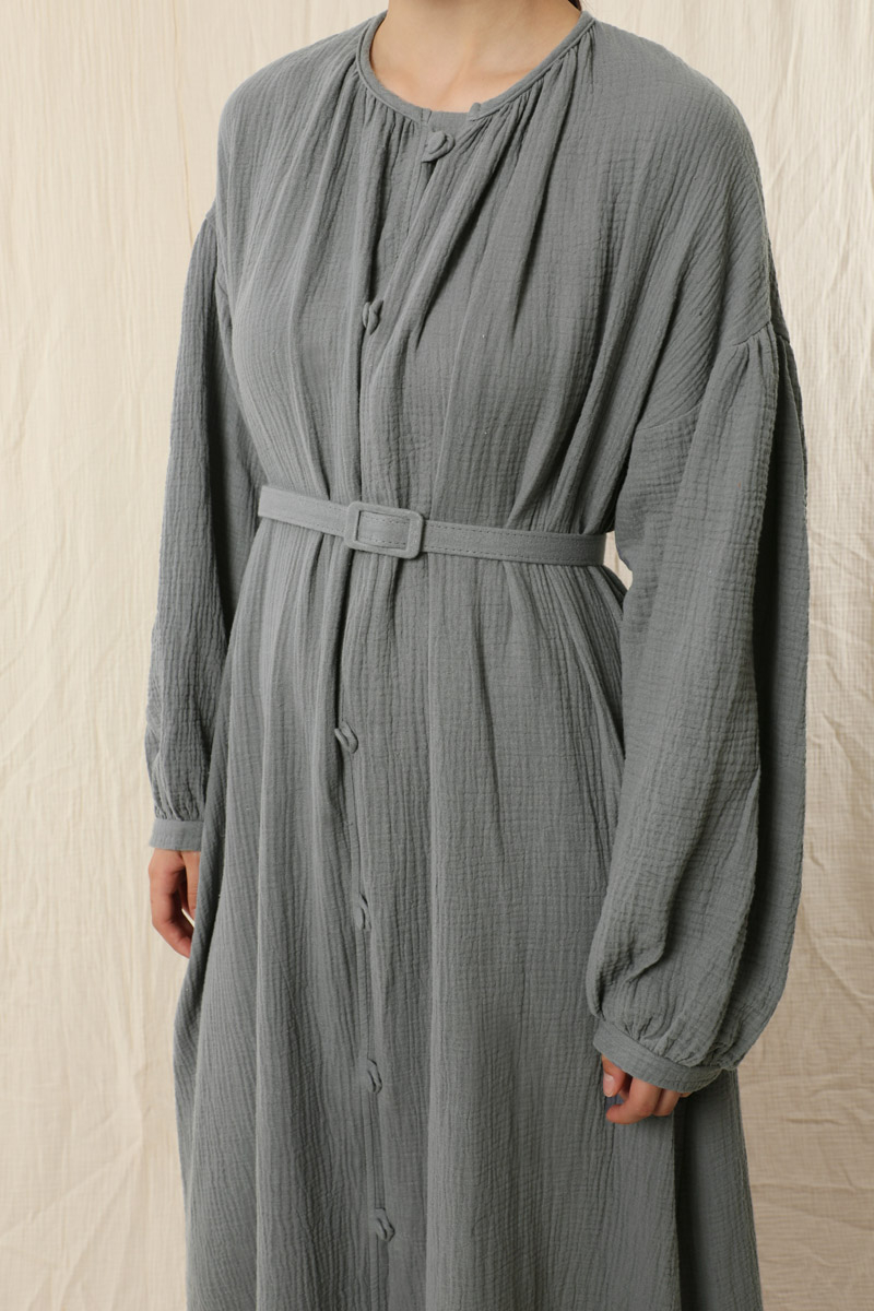 Yakası Büzgülü Düğmeli Elbise Koyu Gri. Önü birit düğmelidir. Kol kısmı düşük omuzludur. Omuz kısmı büzgülüdür. İnce manşetlidir. Manşeti büzgülüdür. İnce tokalı kemeri mevcuttur. Yan ceplidir. Astarsızdır.