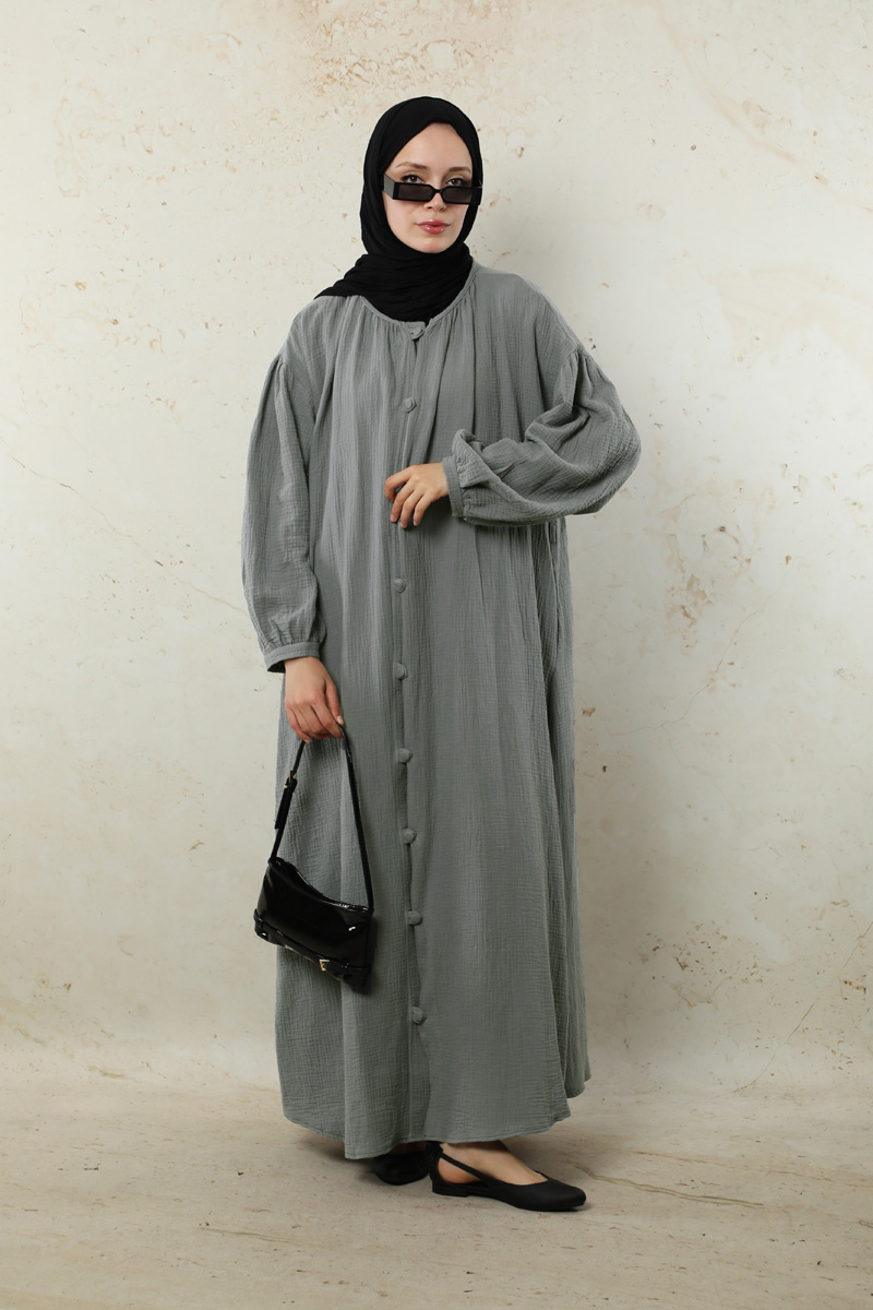 Yakası Büzgülü Düğmeli Elbise Koyu Gri