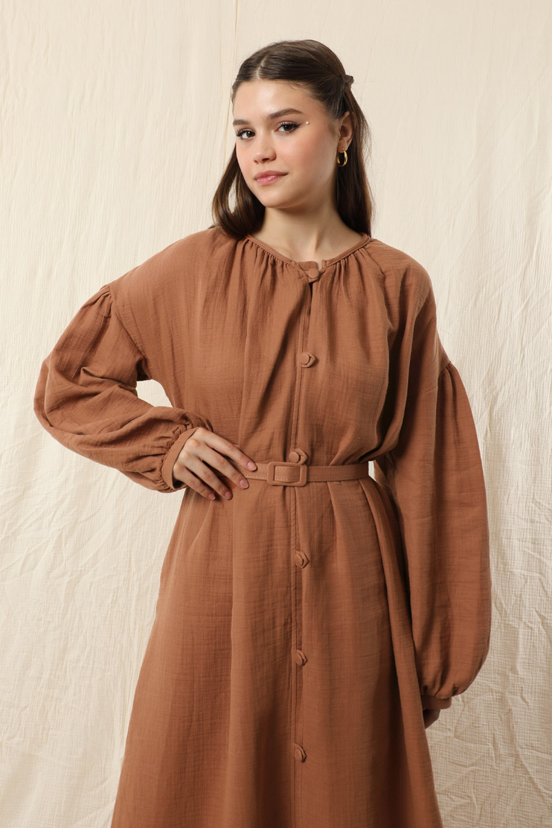Yakası Büzgülü Düğmeli Elbise Oranj. Önü birit düğmelidir. Kol kısmı düşük omuzludur. Omuz kısmı büzgülüdür. İnce manşetlidir. Manşeti büzgülüdür. İnce tokalı kemeri mevcuttur. Yan ceplidir. Astarsızdır.