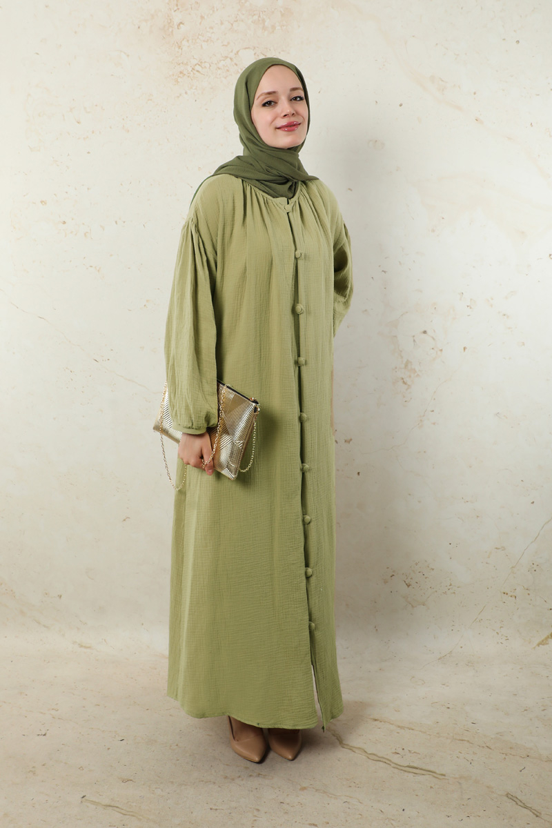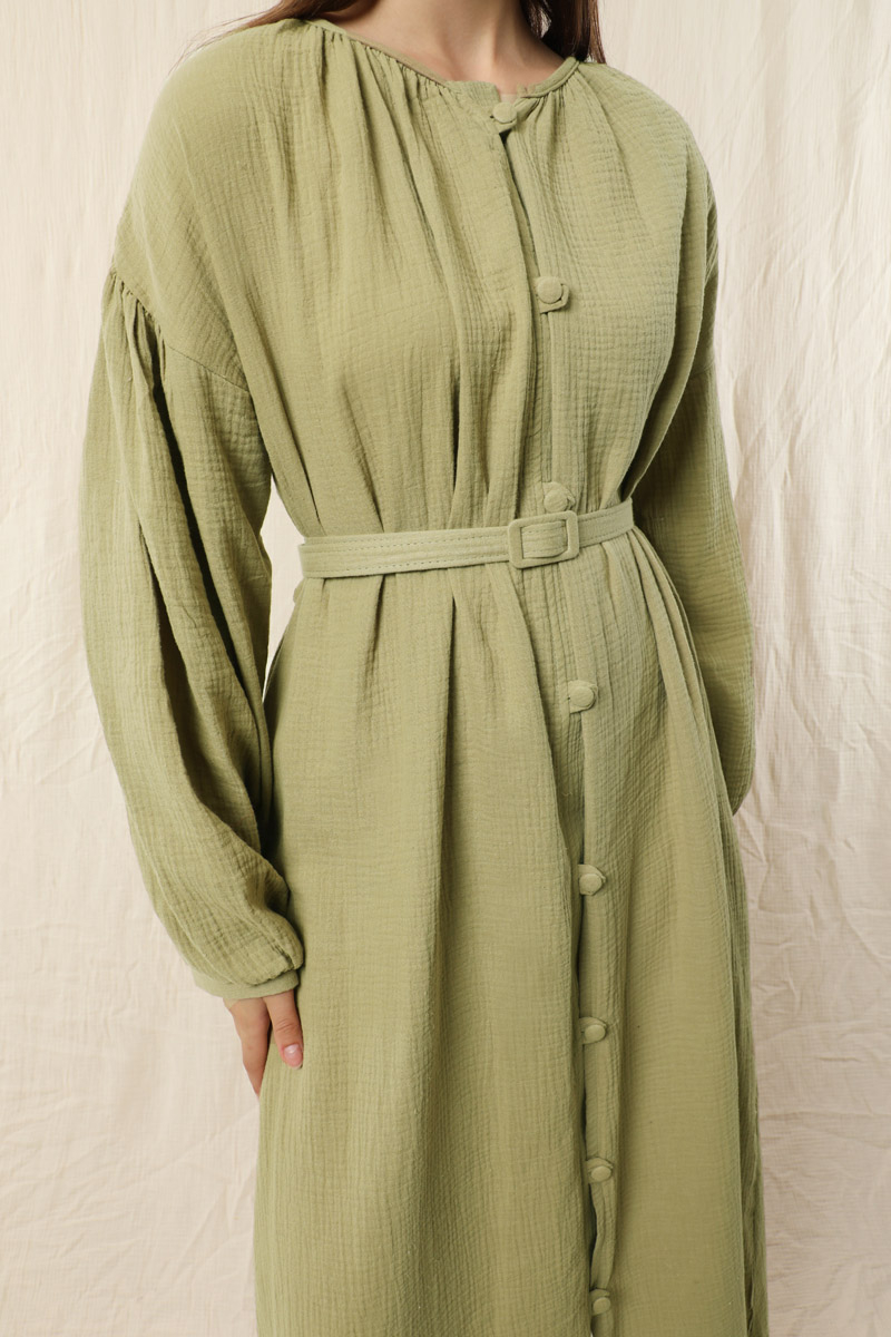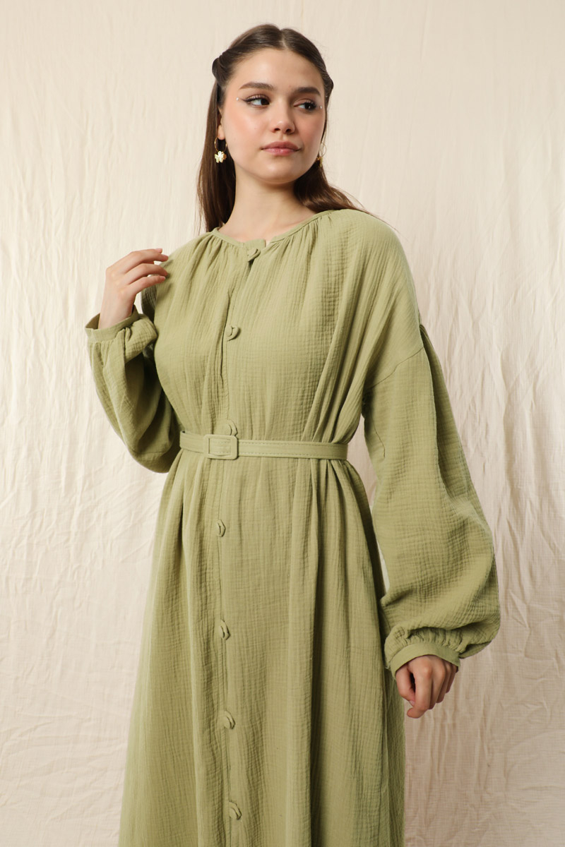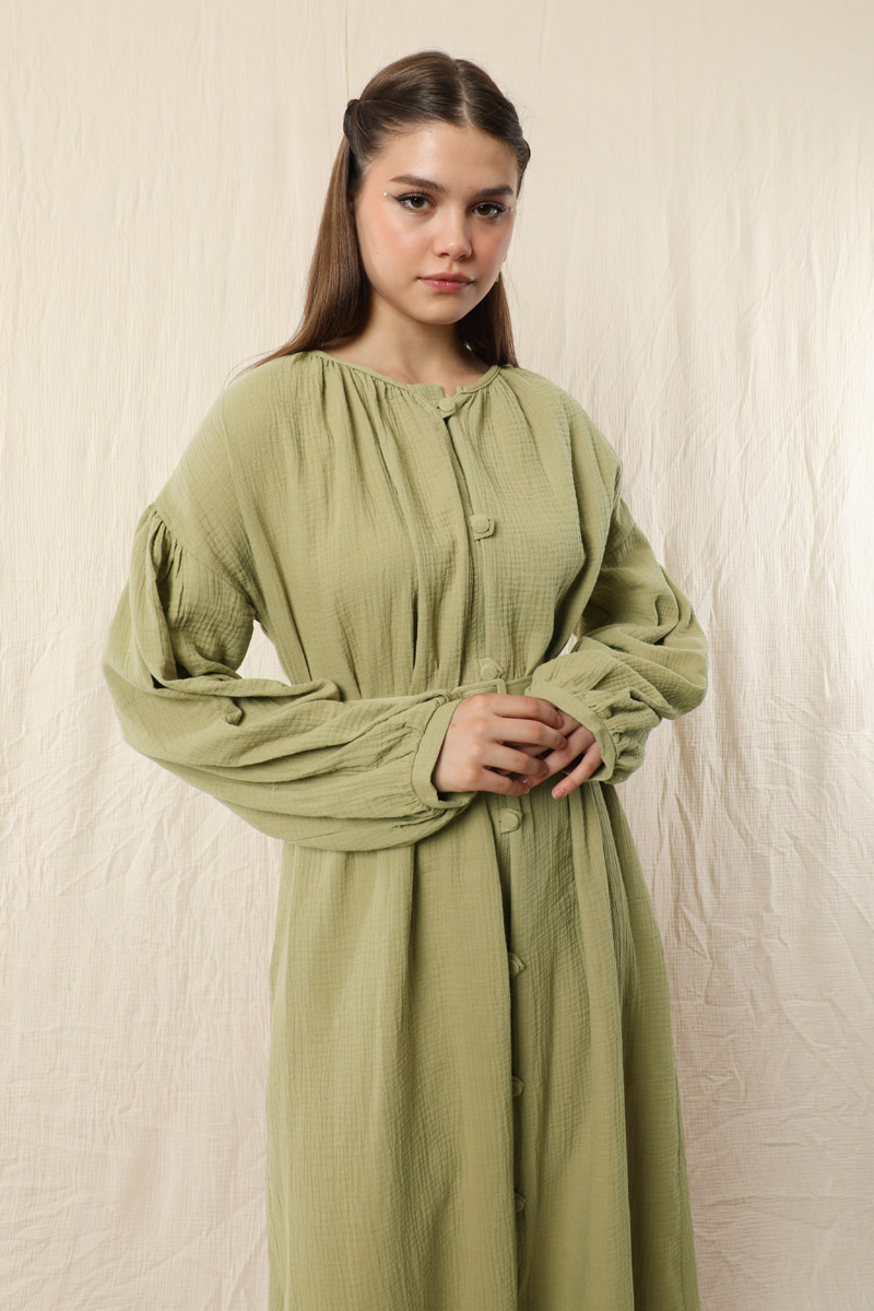 Yakası Büzgülü Düğmeli Elbise Yağ Yeşili