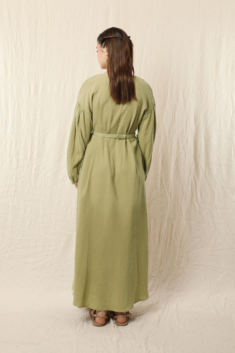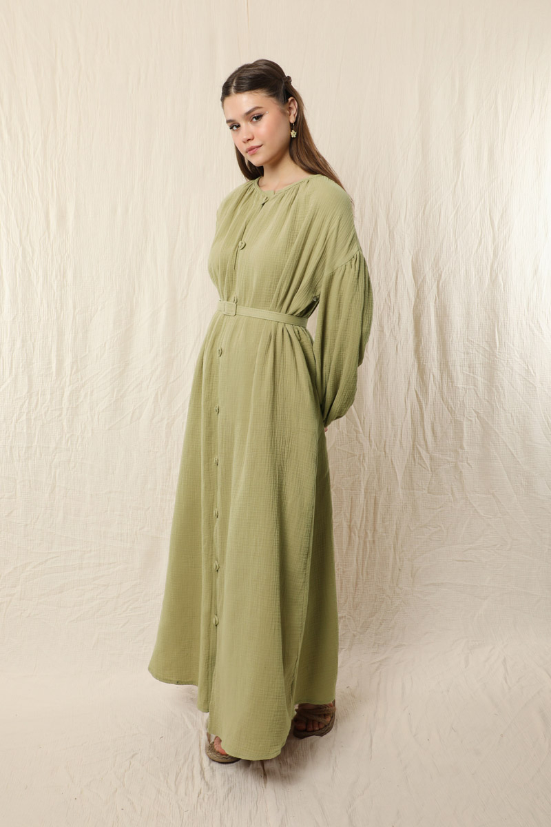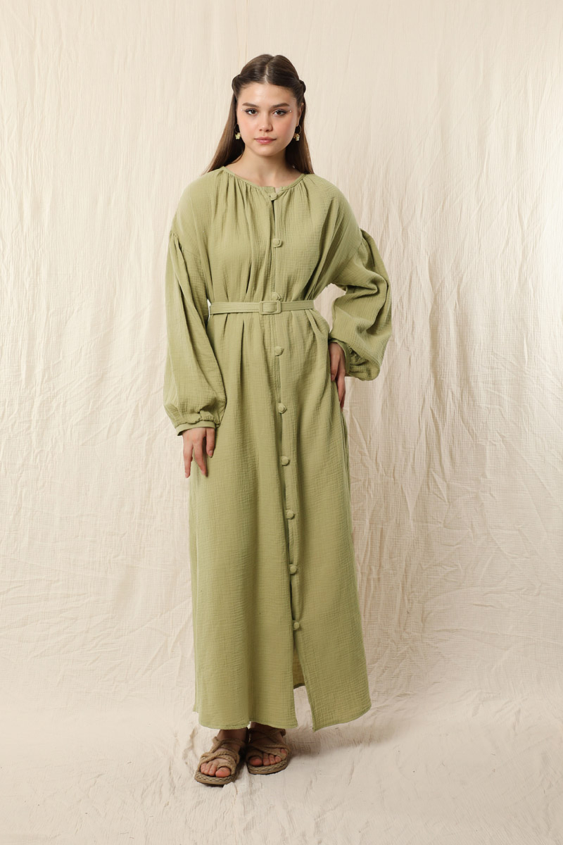 Yakası Büzgülü Düğmeli Elbise Yağ Yeşili. Önü birit düğmelidir. Kol kısmı düşük omuzludur. Omuz kısmı büzgülüdür. İnce manşetlidir. Manşeti büzgülüdür. İnce tokalı kemeri mevcuttur. Yan ceplidir. Astarsızdır.