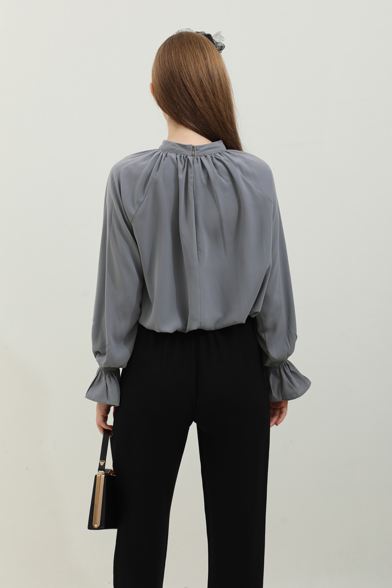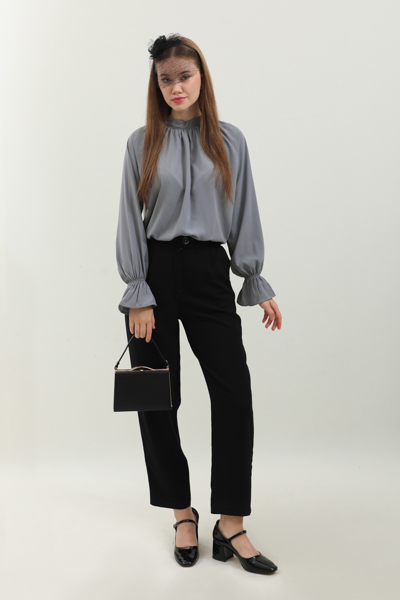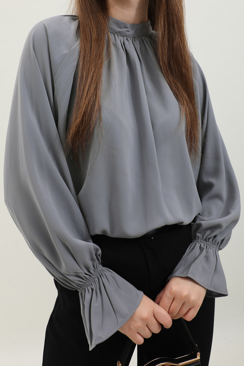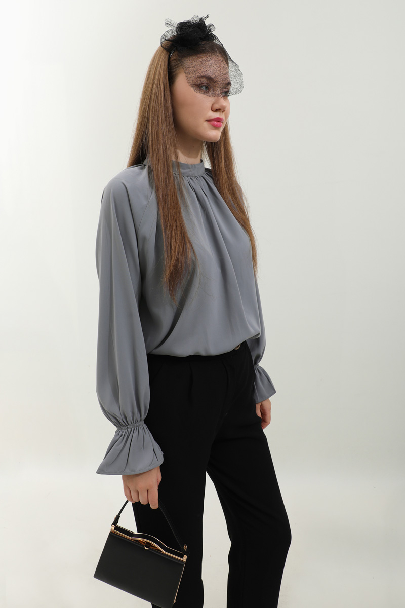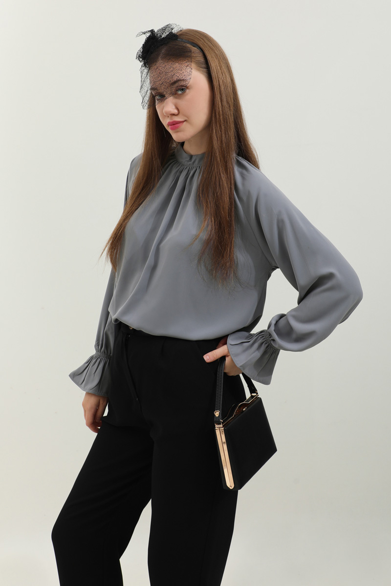 Yakası Büzgülü Gömlek Antrasit. Hakim yakalıdır, kolları lastiklidir, arkadan yarı fermuarlıdır, yakası büzgülü, kol manşeti volanlıdır, günlük ve özel günlerde kullanıma uygundur, etek ve pantolon kombinlerinizde tercih edebilirsiniz.