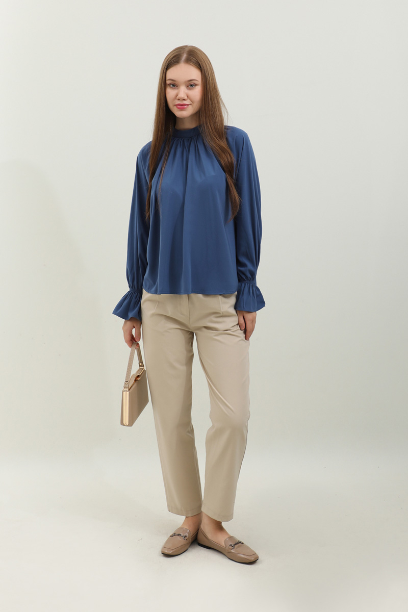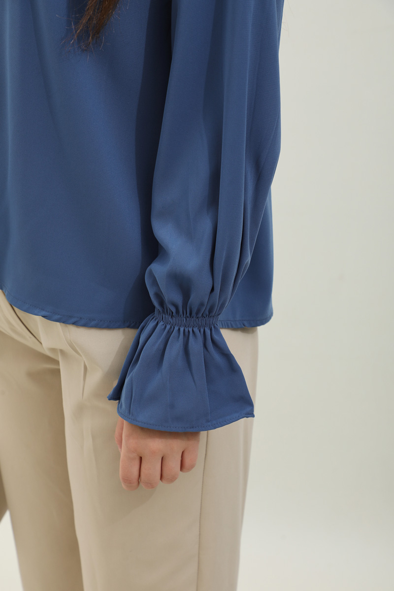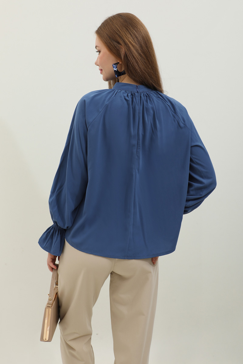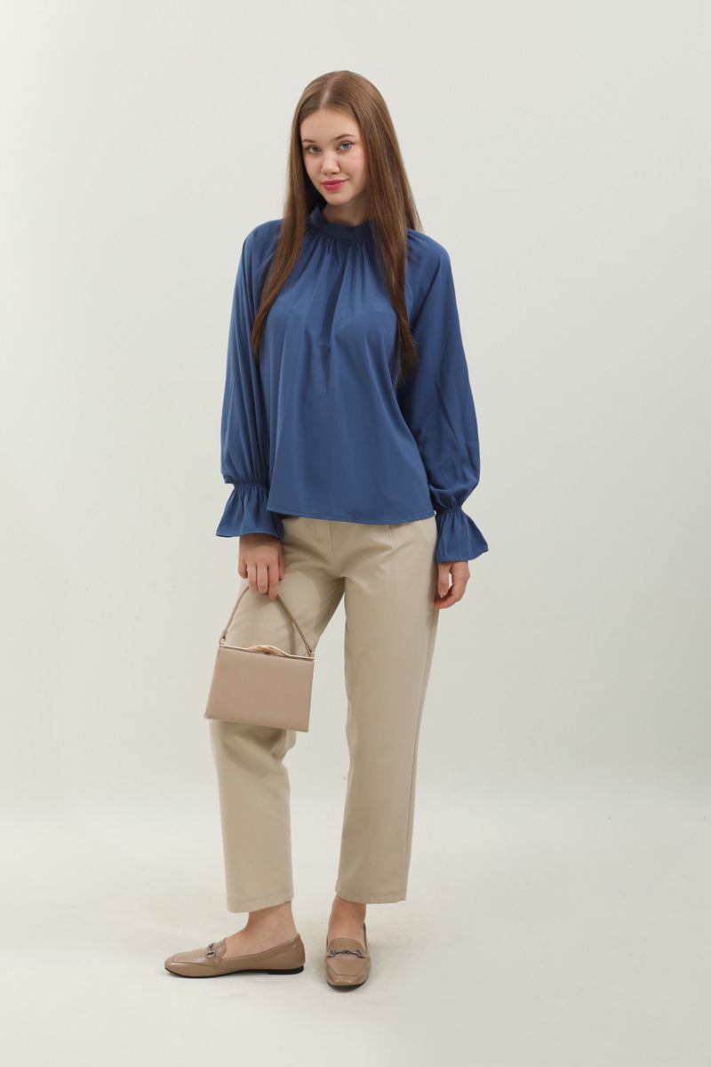 Yakası Büzgülü Gömlek Lacivert. Hakim yakalıdır, kolları lastiklidir, arkadan yarı fermuarlıdır, yakası büzgülü, kol manşeti volanlıdır, günlük ve özel günlerde kullanıma uygundur, etek ve pantolon kombinlerinizde tercih edebilirsiniz.