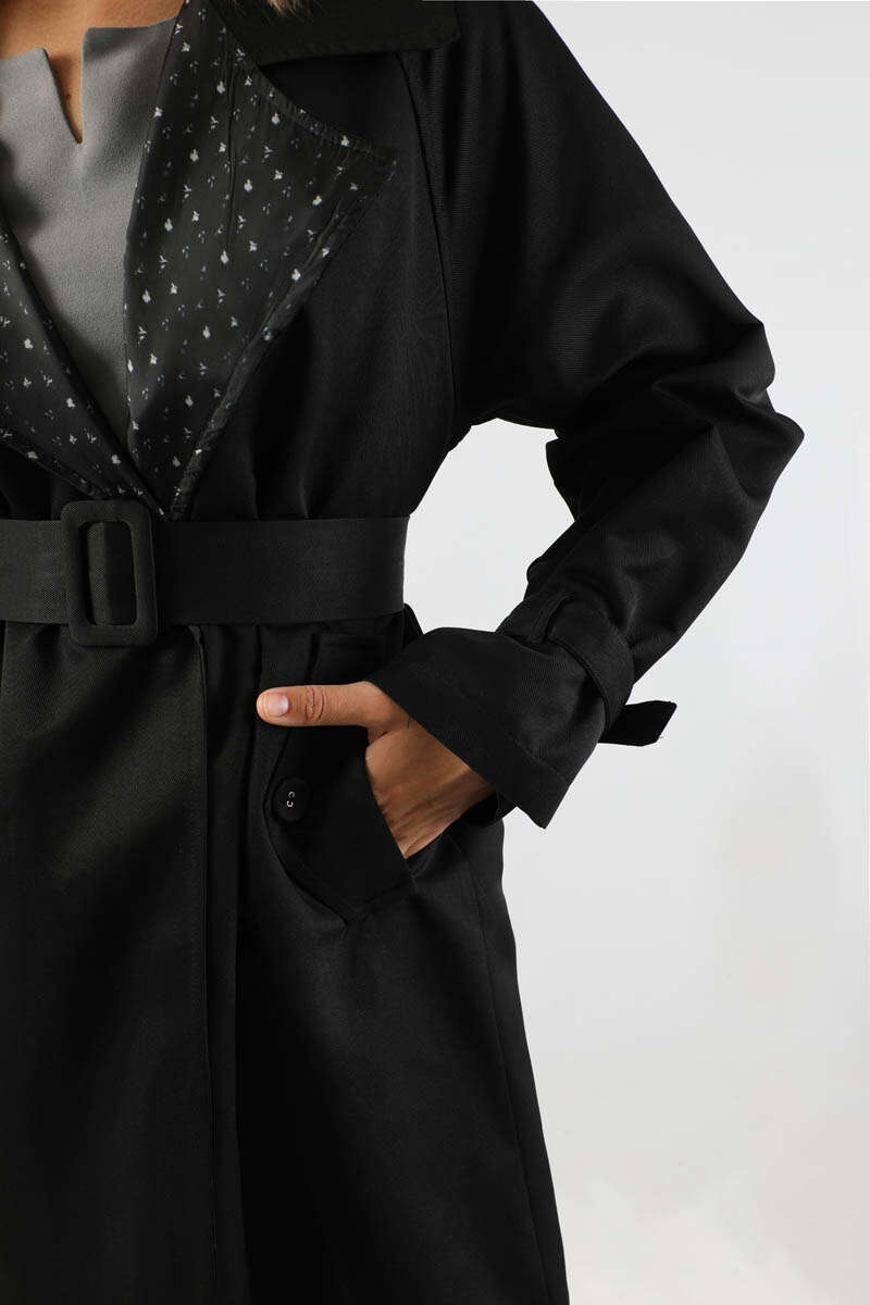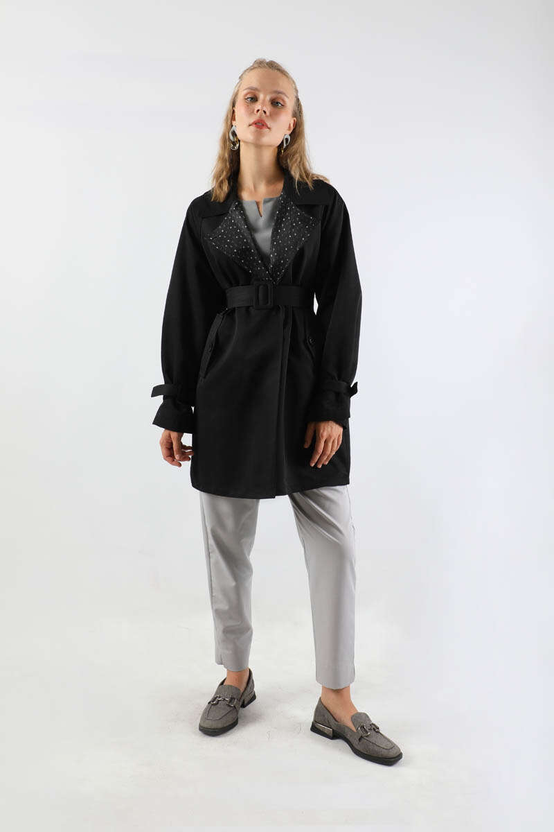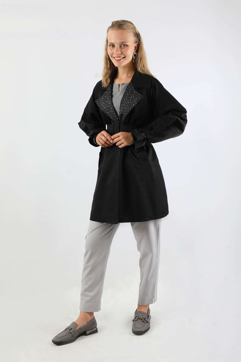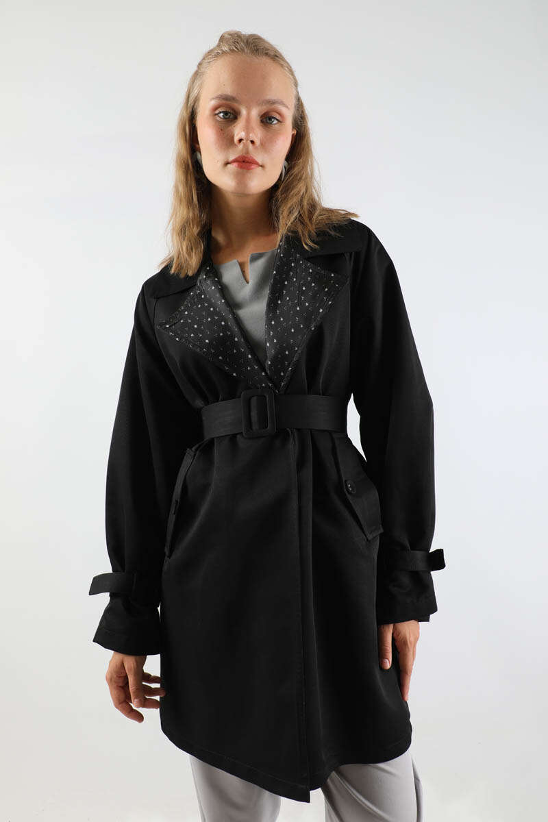 Yakası Desenli Midi Trençkot Siyah. Manşetinde Apolet detayı mevcuttur. Kruvazesinden astarlıdır. Ceplidir. Reglan Kolludur. Arkadan A pilelidir. Kuşaklıdır. Günlük kullanım ve özel günlerinizde tercih edebilirsiniz.