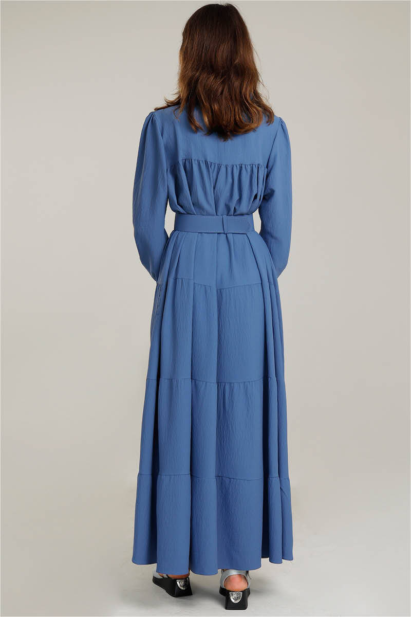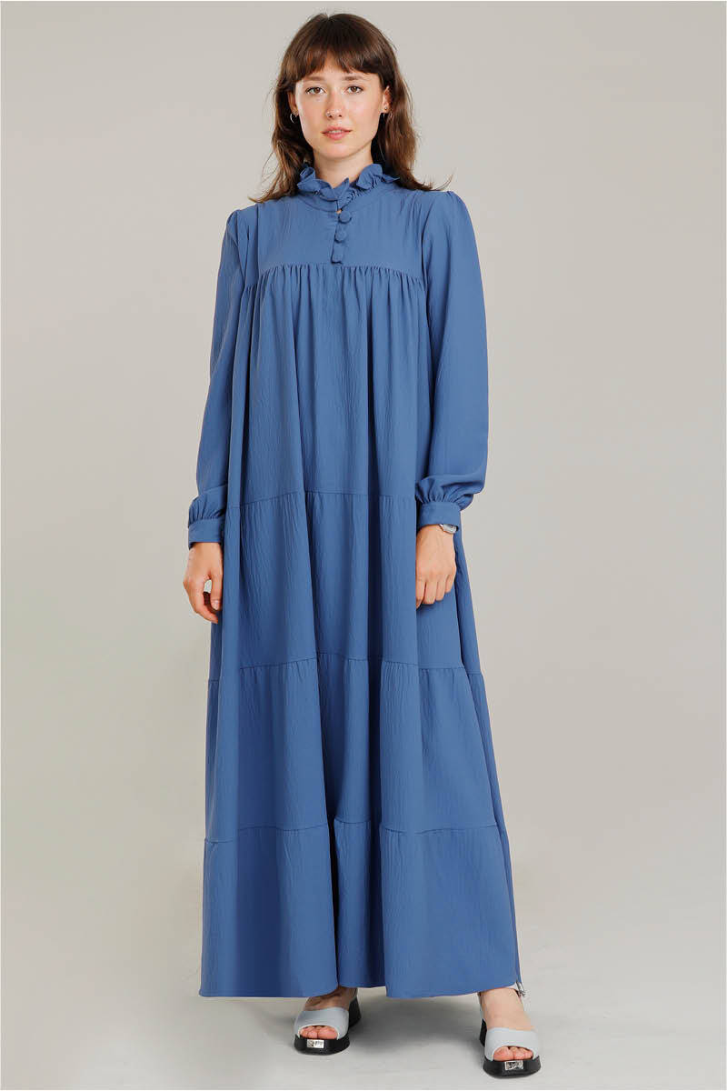 Yakası Fırfırlı Beli Kemerli Elbise İndigo