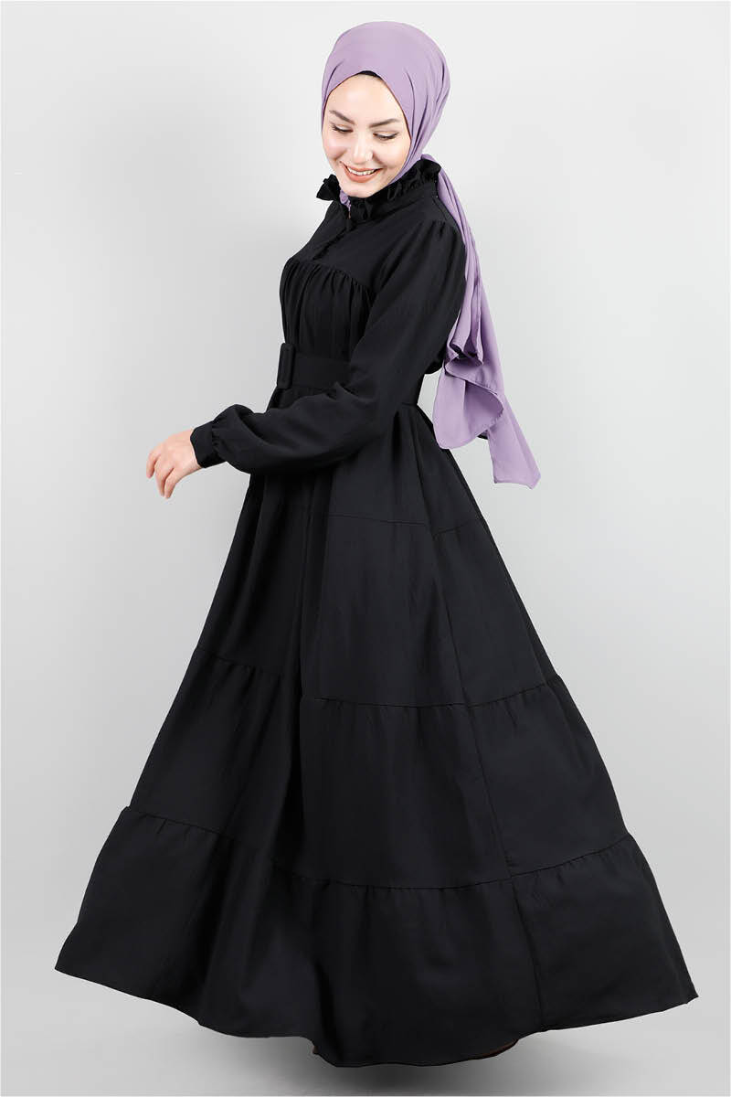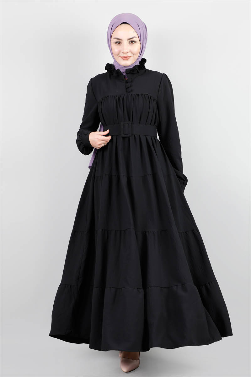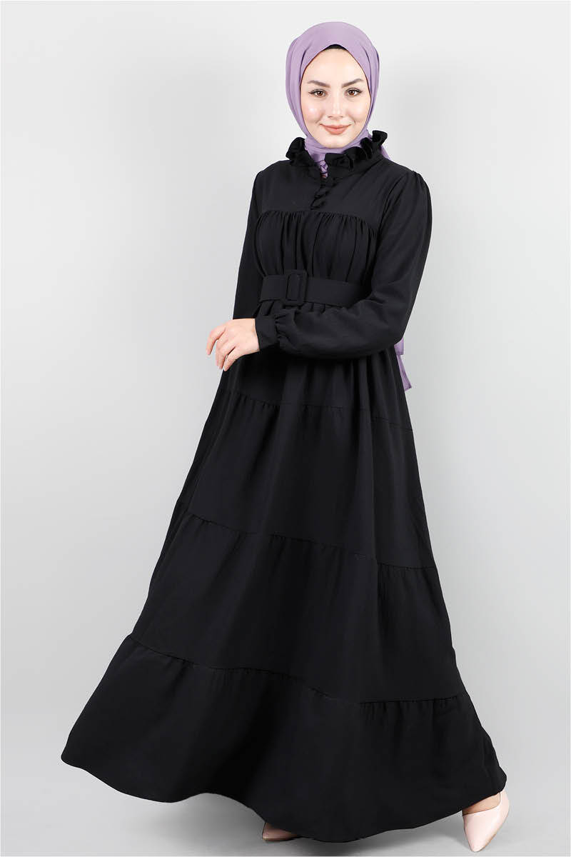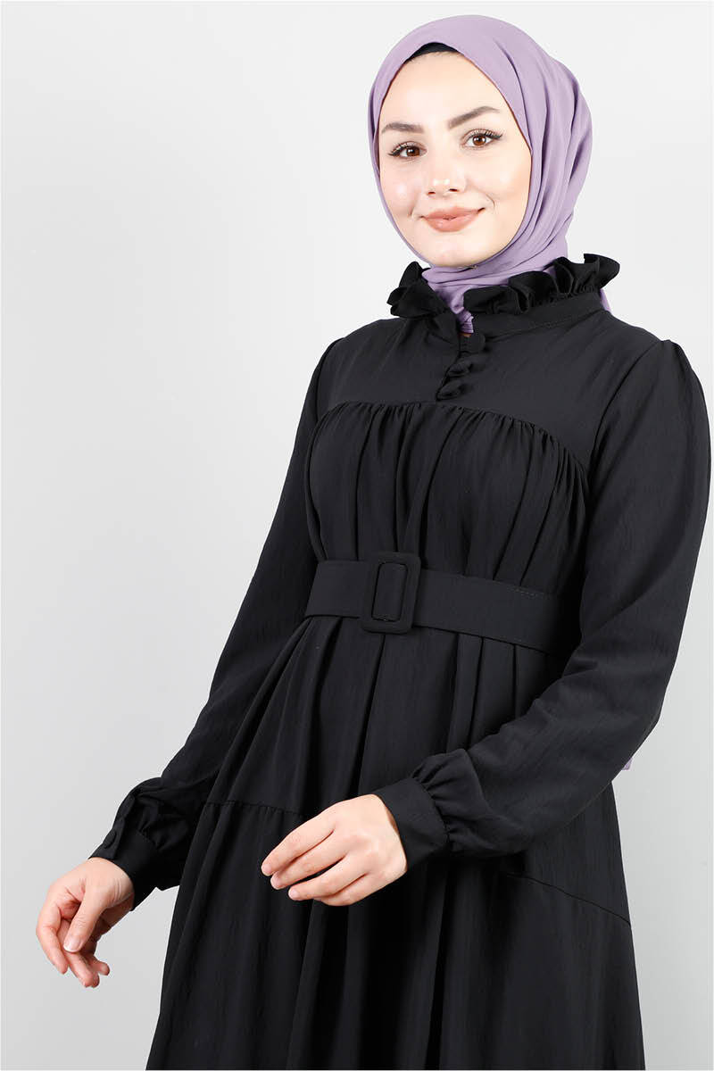 Yakası Fırfırlı Beli Kemerli Elbise Siyah