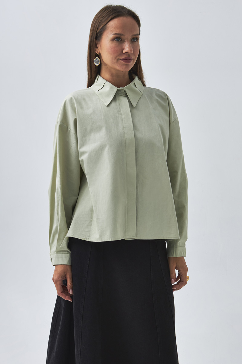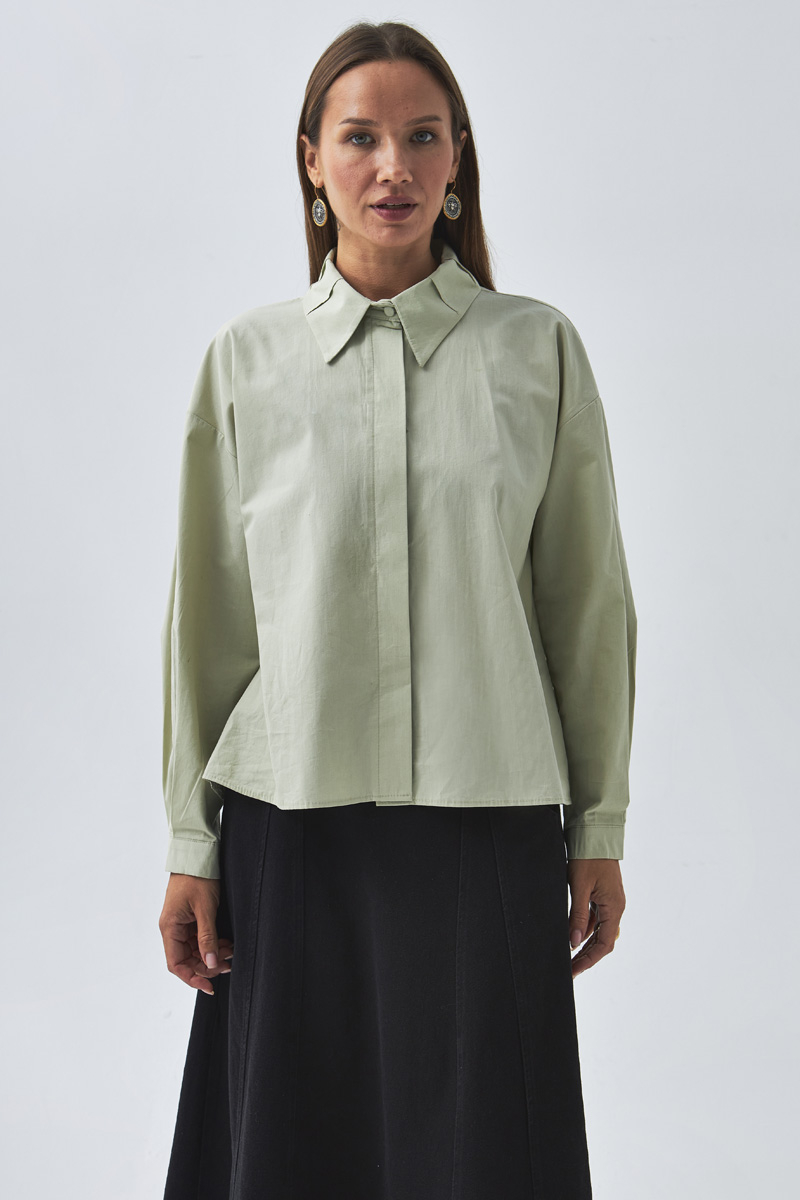 With its simple and modern design, this shirt is a versatile piece that complements both casual and elegant outfits. The classic shirt collar and pleated detail at the neckline add a subtle, refined touch, while the loose fit ensures comfort throughout the day. Its breathable fabric structure makes it ideal for daily wear.