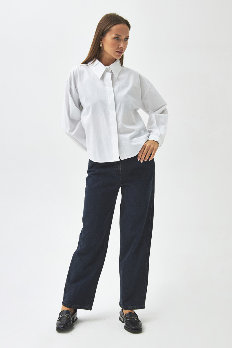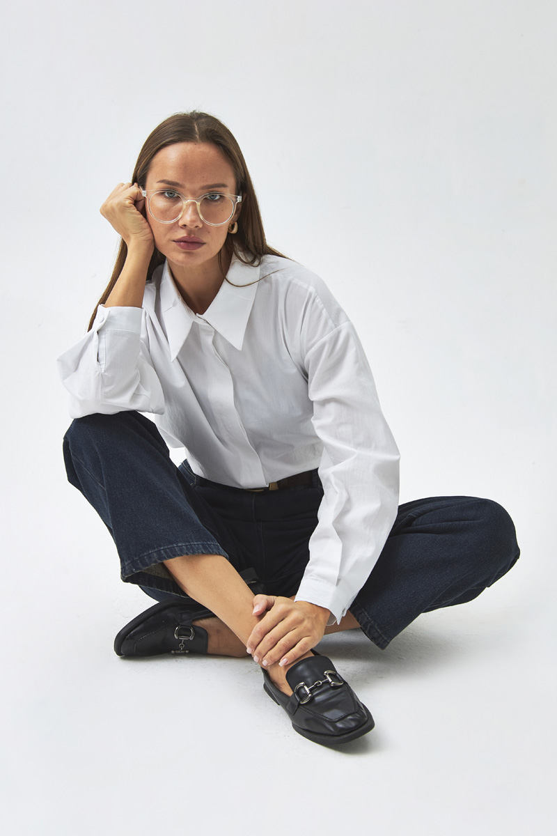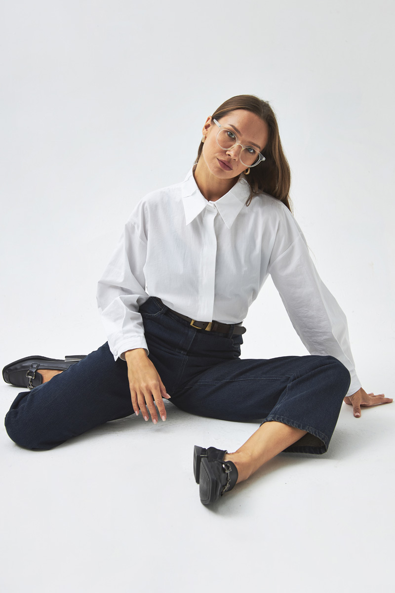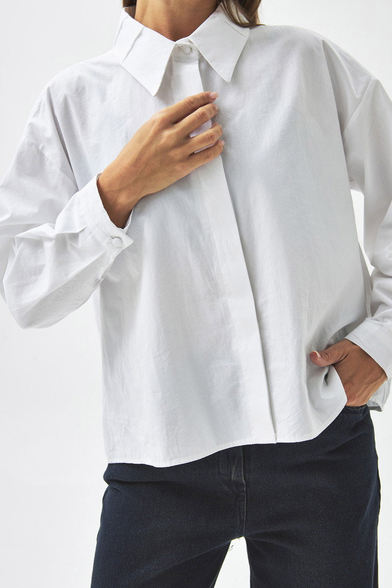 Pleated Collar Shirt White With its simple and modern design, this shirt is a versatile piece that complements both casual and elegant outfits. The classic shirt collar and pleated detail at the neckline add a subtle, refined touch, while the loose fit ensures comfort throughout the day. Its breathable fabric structure makes it ideal for daily wear.