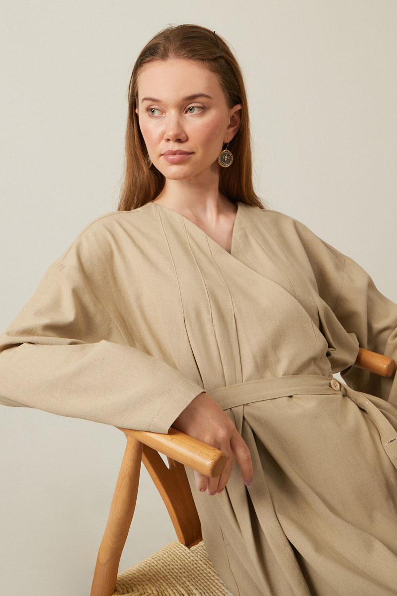 Yakası Pile Detaylı Keten Abaya Bej