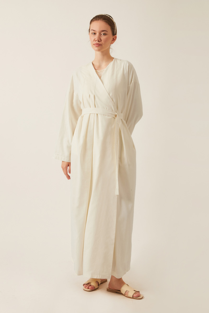 Yakası Pile Detaylı Keten Abaya Beyaz