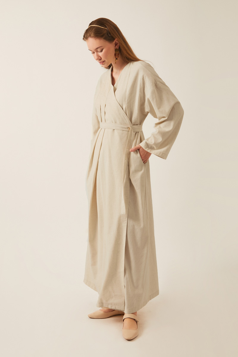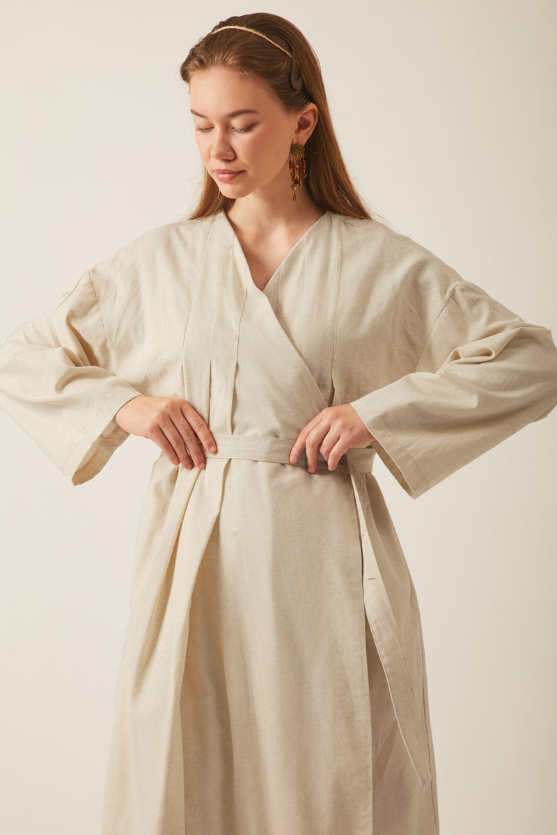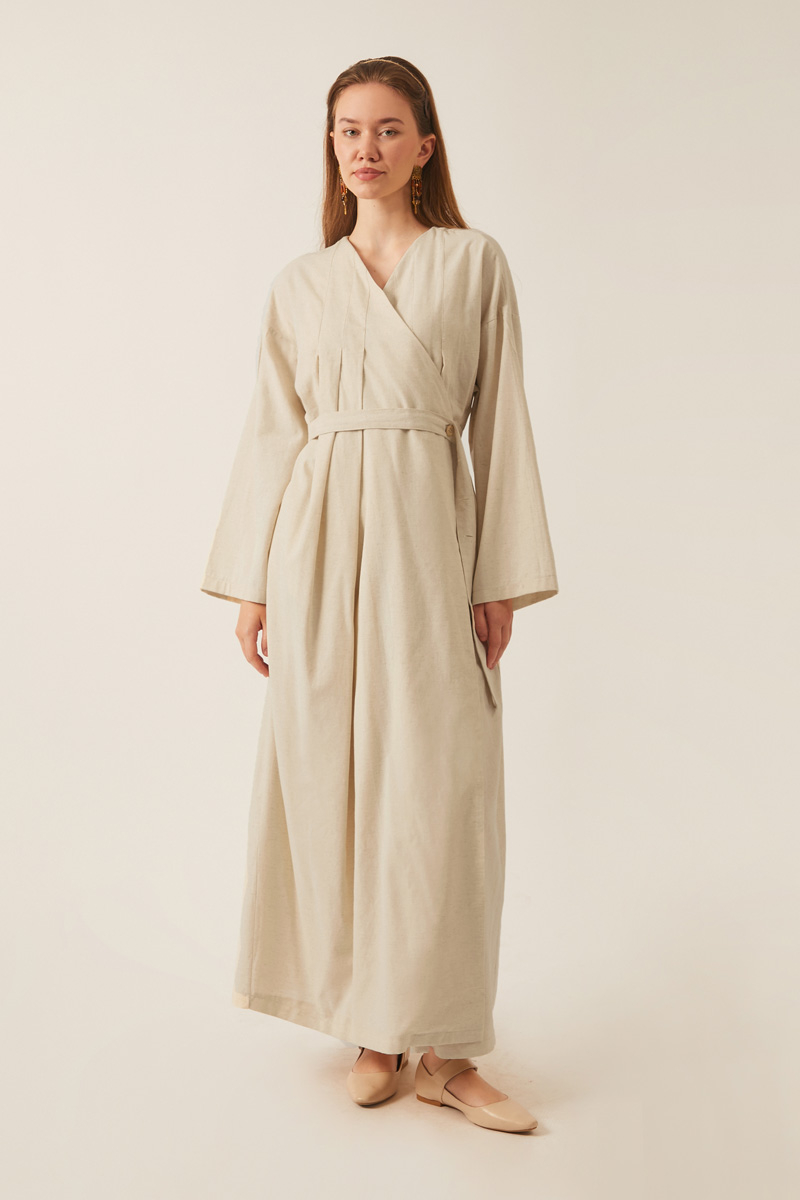Yakası Pile Detaylı Keten Abaya Taş