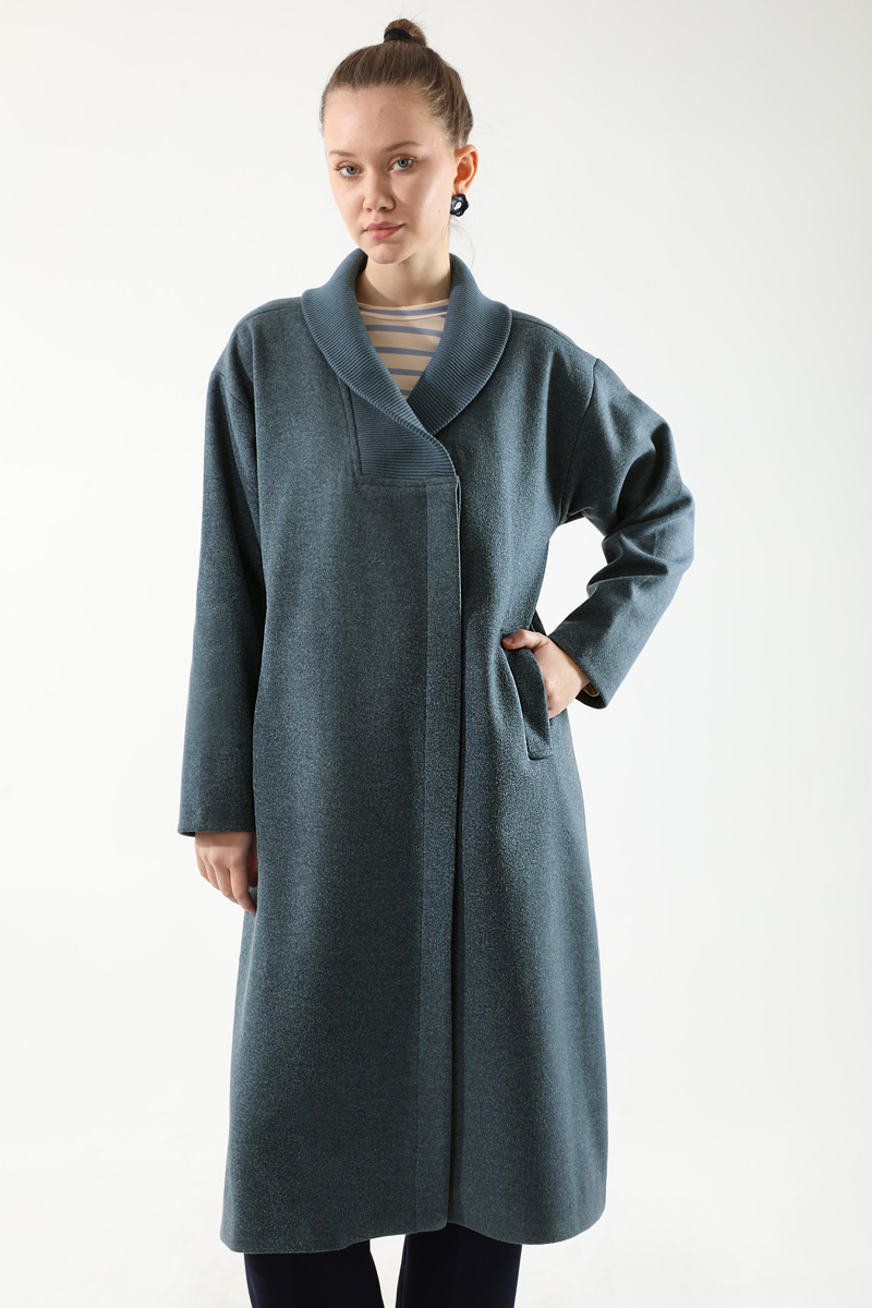 Yakası Ribanalı Kaşe Kaban İndigo. Gizli kruvaze kapama.Yandan cepli. Astarlı.