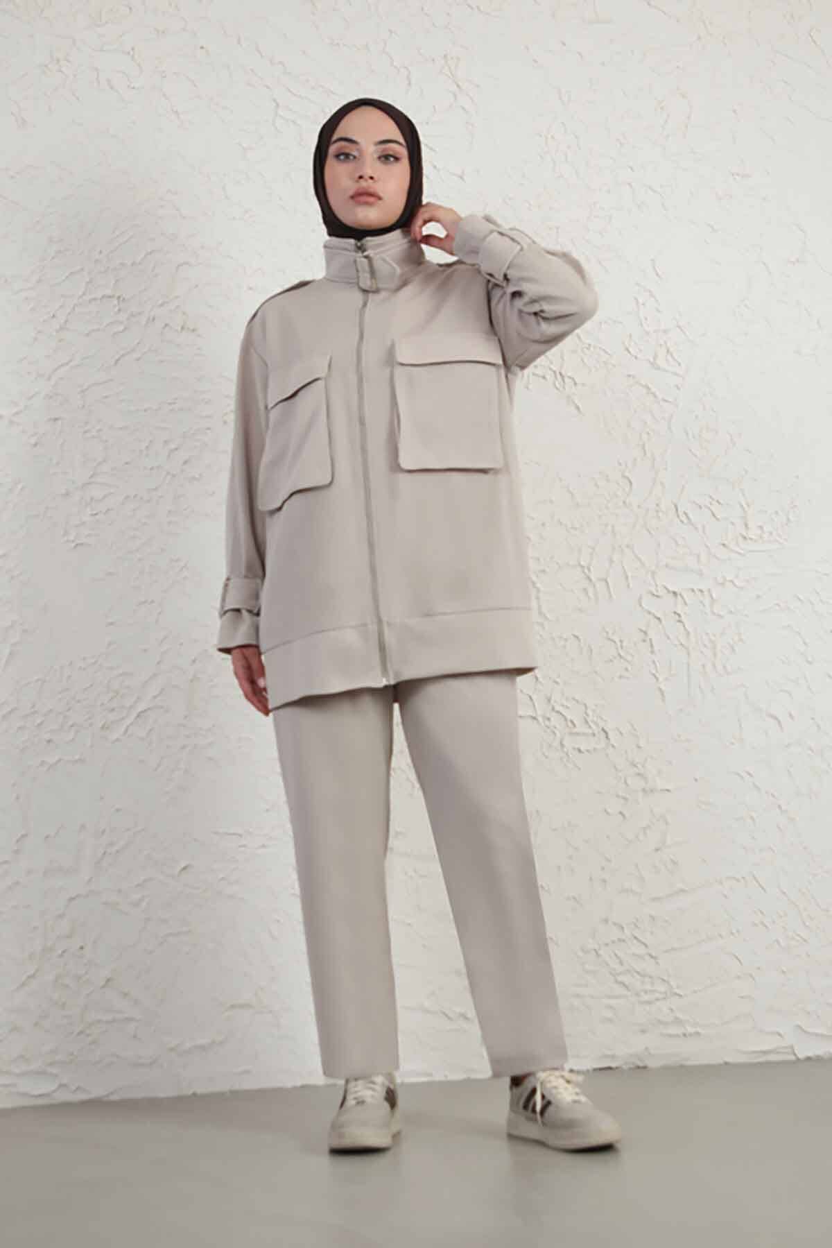 Buckled Collar Double Suit Beige. The tunic is zippered, there is a fastening buckle on the collar. The trousers have elastic waist and pockets.