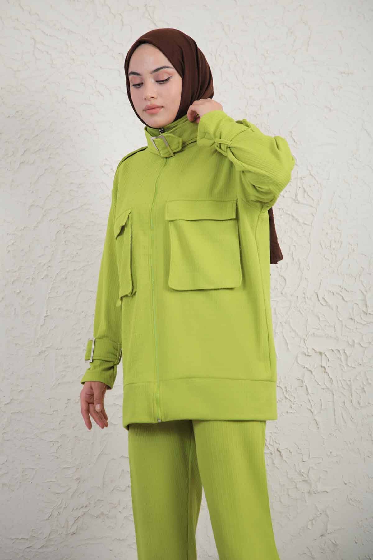 Yakası Tokalı İkili Takım Yağ Yeşili. Tunik fermuarlıdır, yakasında bağlama tokası mevcuttur. Pantolon beli lastiklidir ve ceplidir.