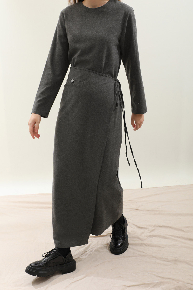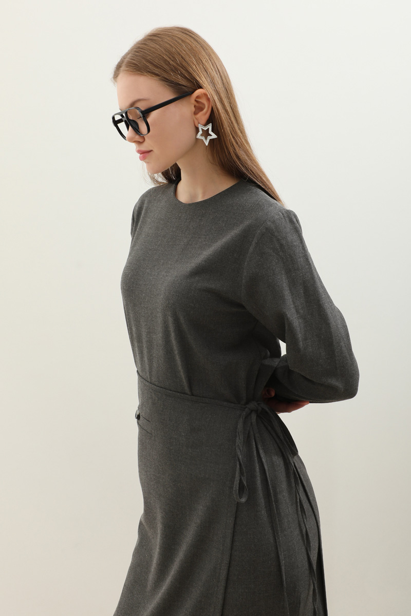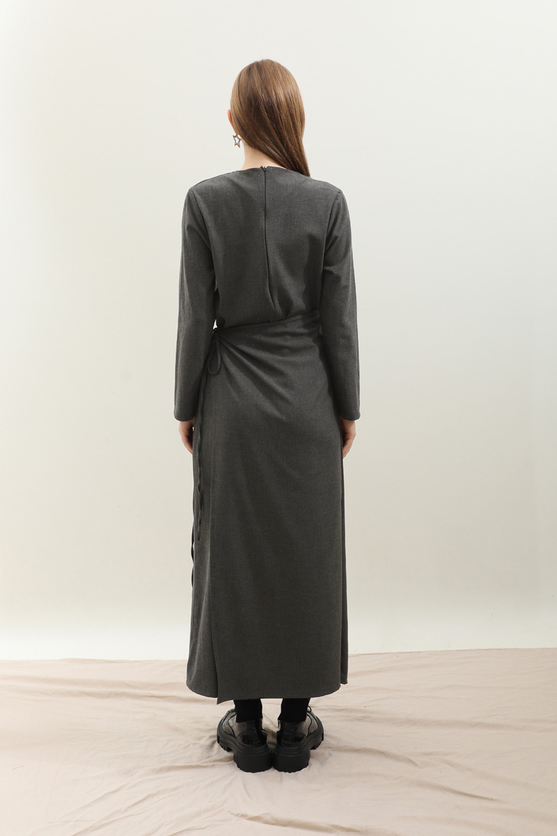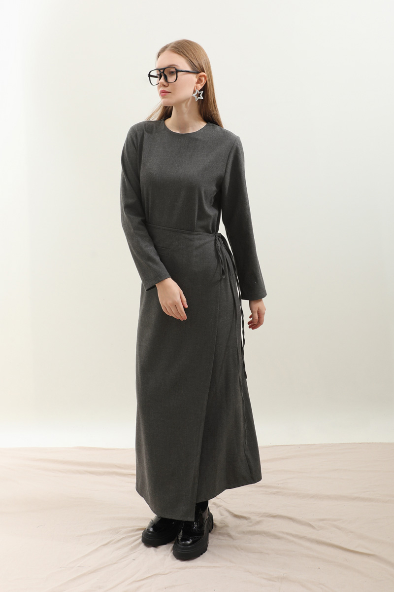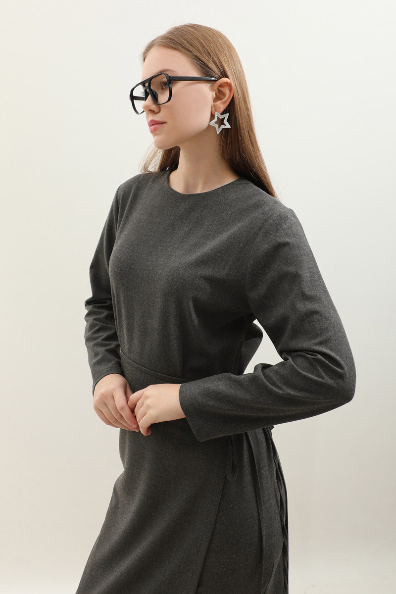Yandan Bağlamalı Etekli Elbise Antrasit. Bisiklet yakadır, arkadan fermuarlıdır, belden etek bağlamalıdır. etek kısmında cep aksesuarı vardır. Astarsızdır. Günlük kullanım ve özel günlerinizde tercih edebilirsiniz.
