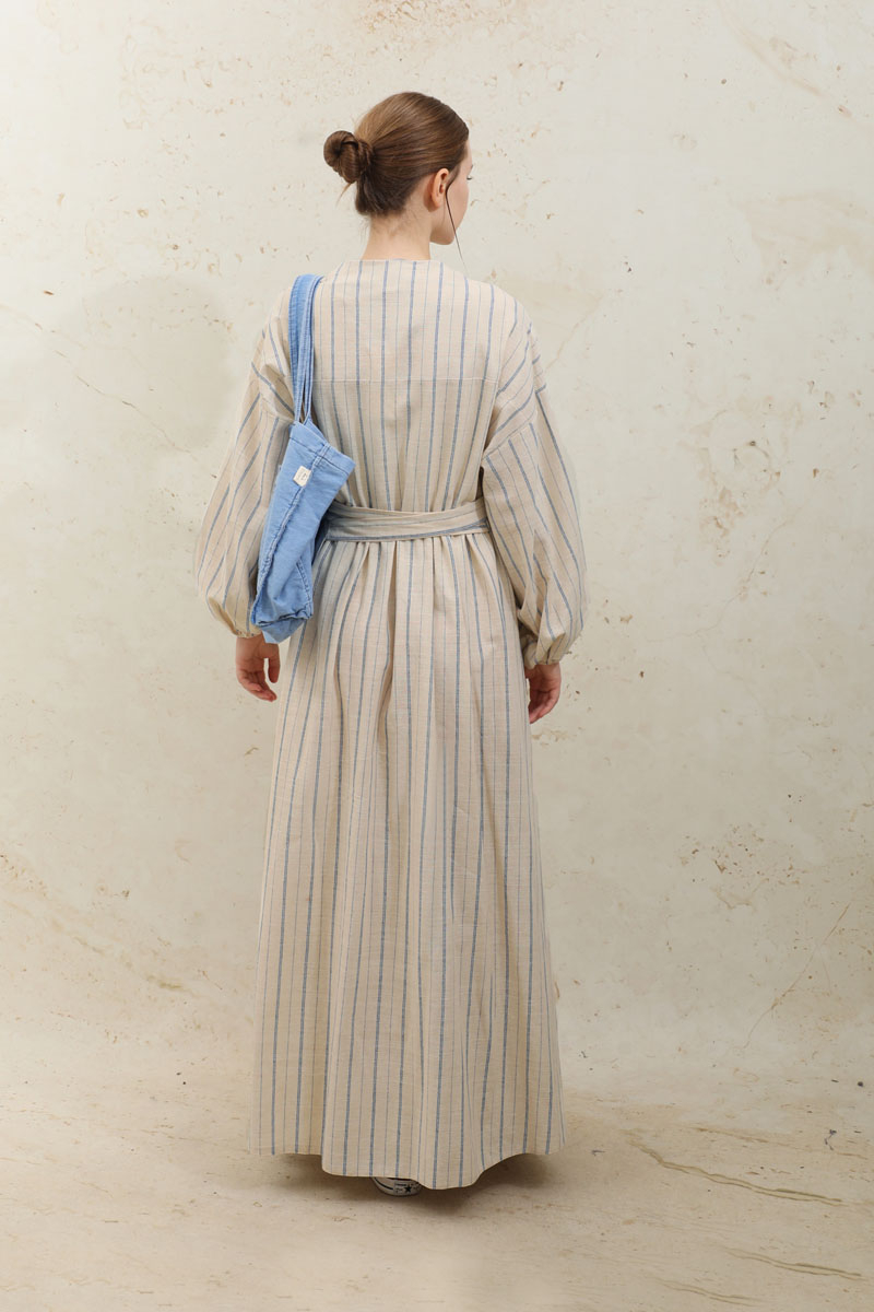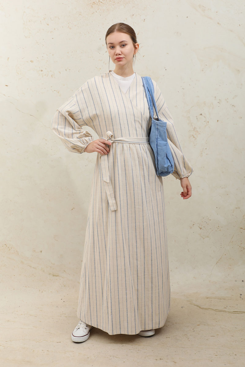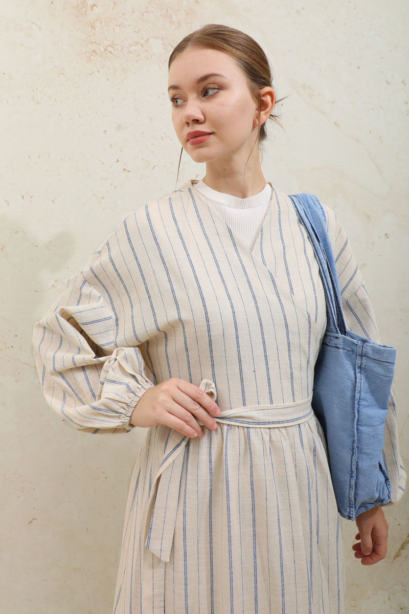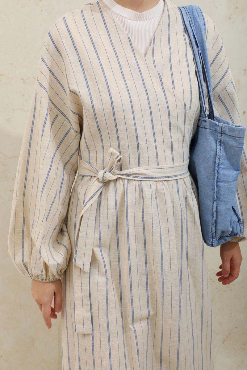 Yandan Bağlamalı Keten Kimona Mavi. V yakalıdır, kruvaze kapamadır, beli büzgülüdür, kol manşeti lastiklidir, çizgili desenlidir, salaş modeldir, belden bağlamalıdır, isterseniz kimona,abaya olarak kullanabilirsiniz.