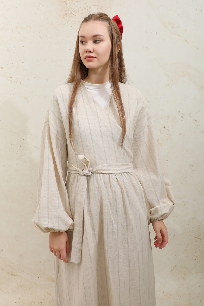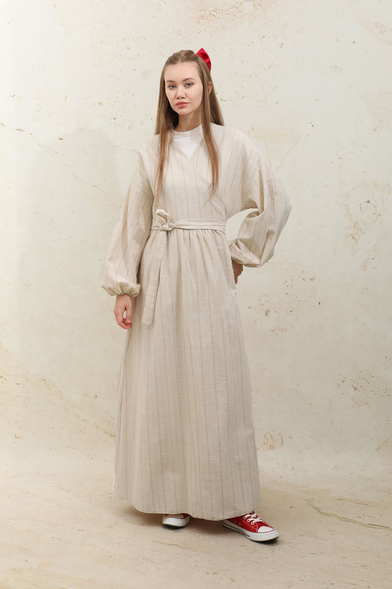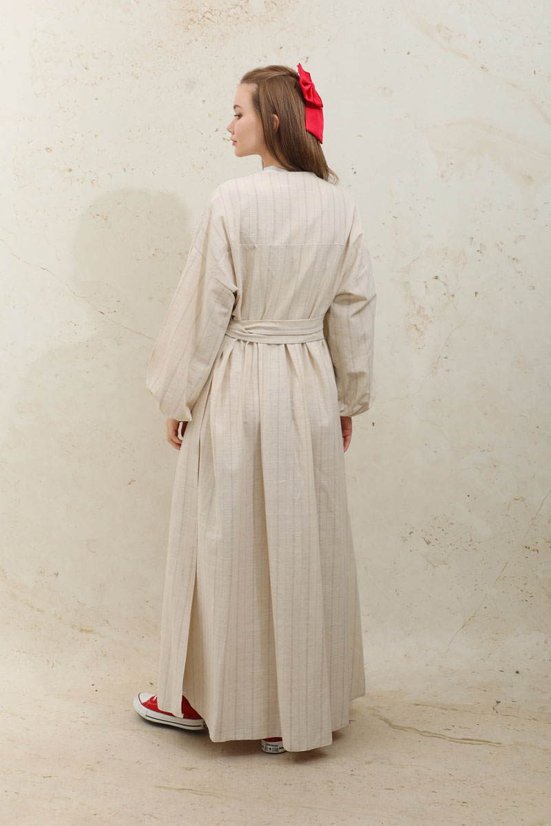 Yandan Bağlamalı Keten Kimona Vizon. V yakalıdır, kruvaze kapamadır, beli büzgülüdür, kol manşeti lastiklidir, çizgili desenlidir, salaş modeldir, belden bağlamalıdır, isterseniz kimona,abaya olarak kullanabilirsiniz.