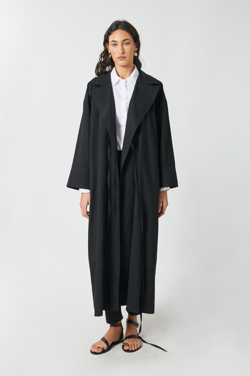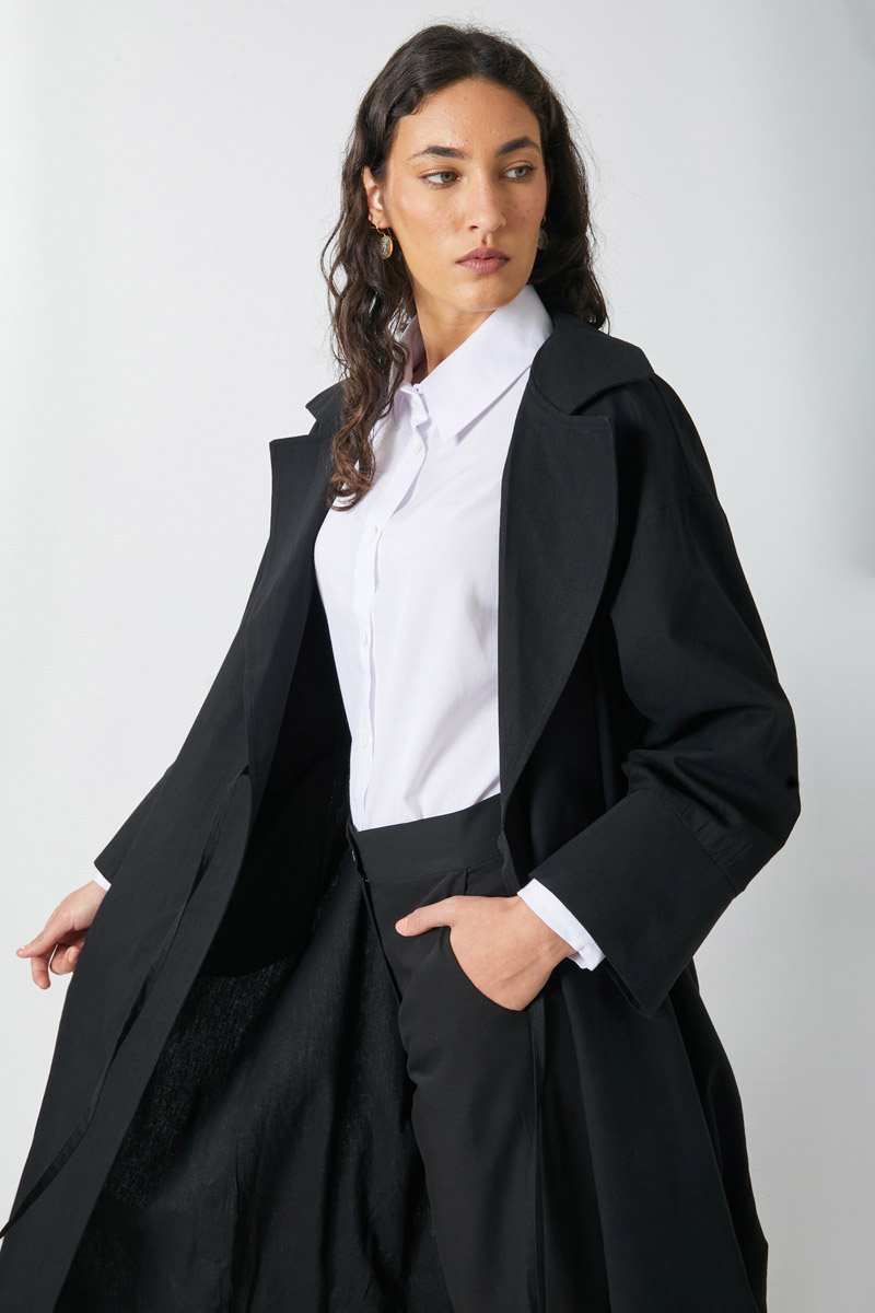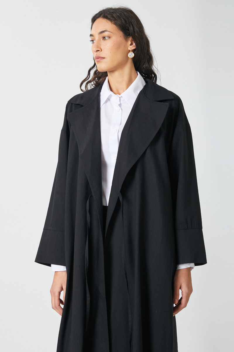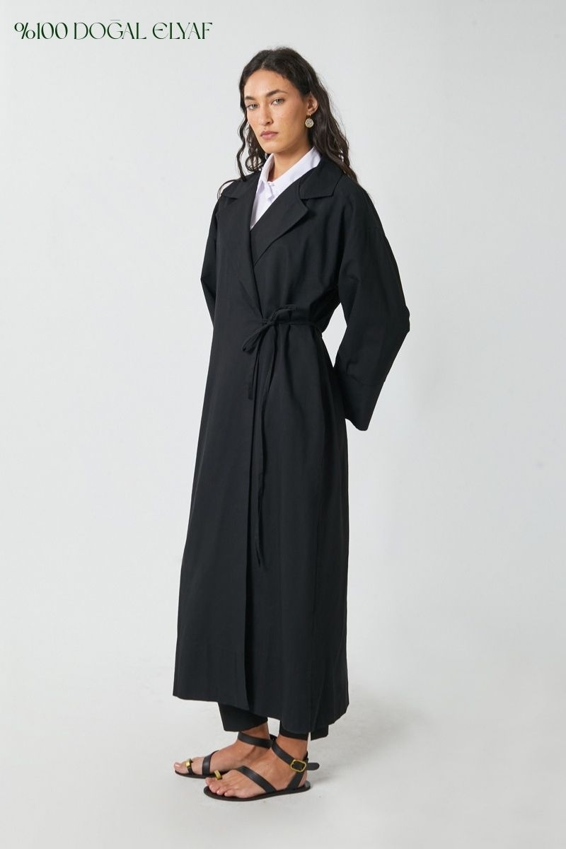 Bağlamalı Keten Trençkot Siyah