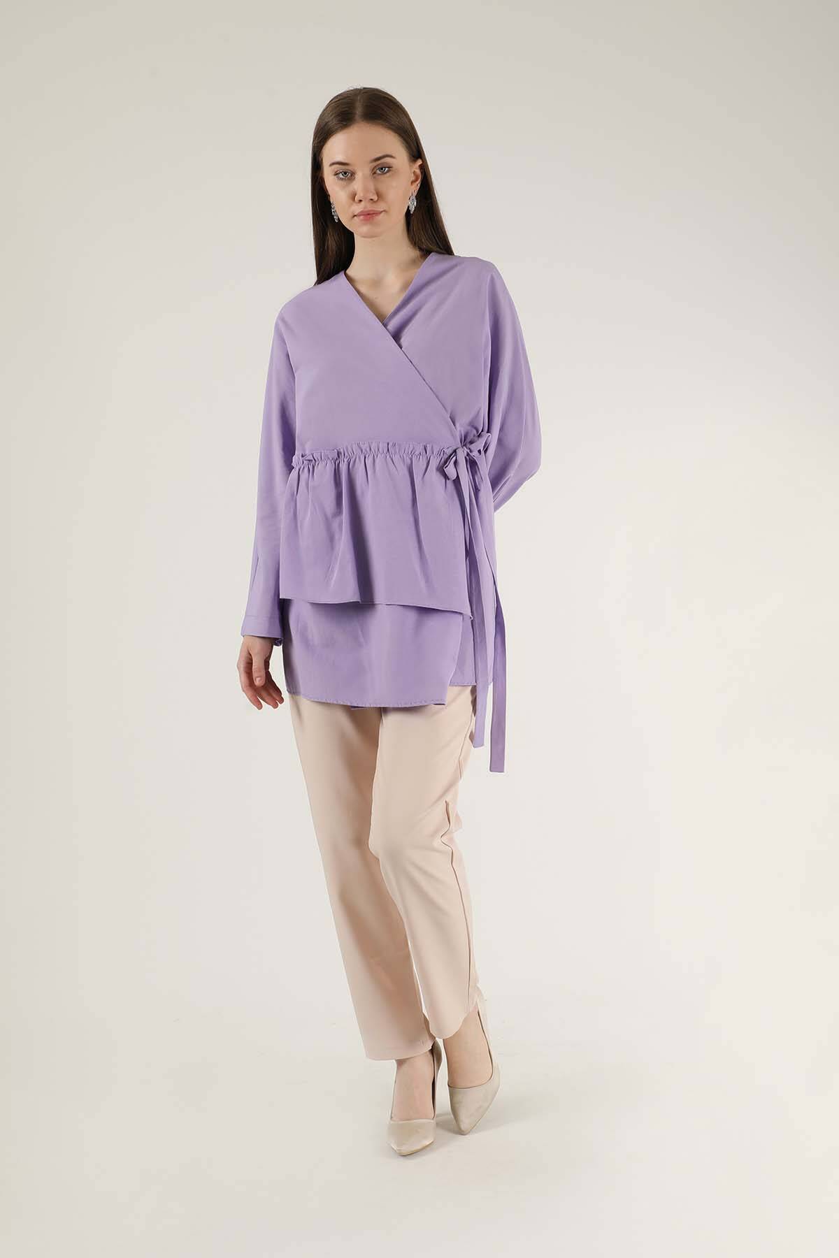Yandan Bağlamalı Kimono Tunik Lila. Kruvaze kapamadır. Yandan bağlamalıdır. V yakalıdır. Önde büzgülü detayı vardır. Yarım yarasa koldur.