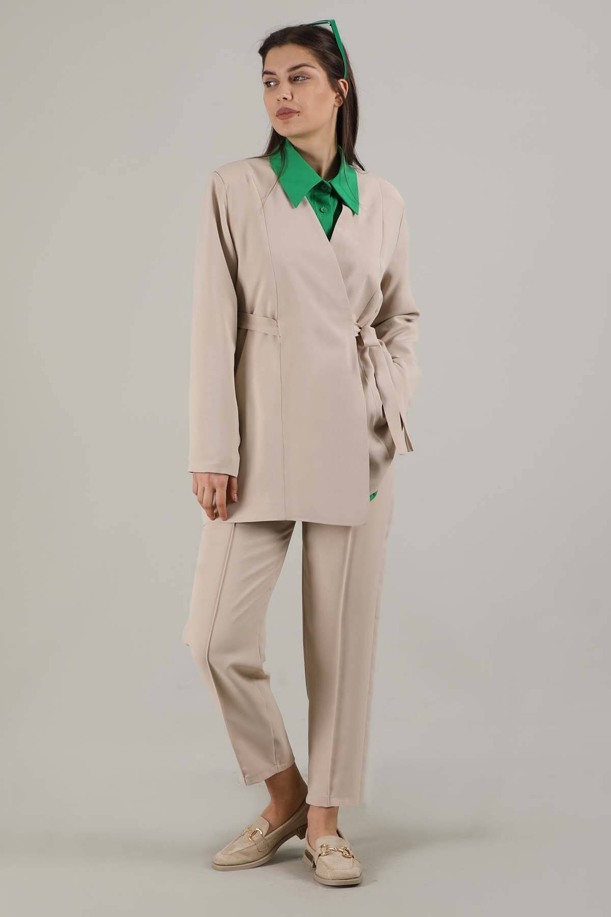 Side tie, detailed. With pockets. Sold as a set with trousers.