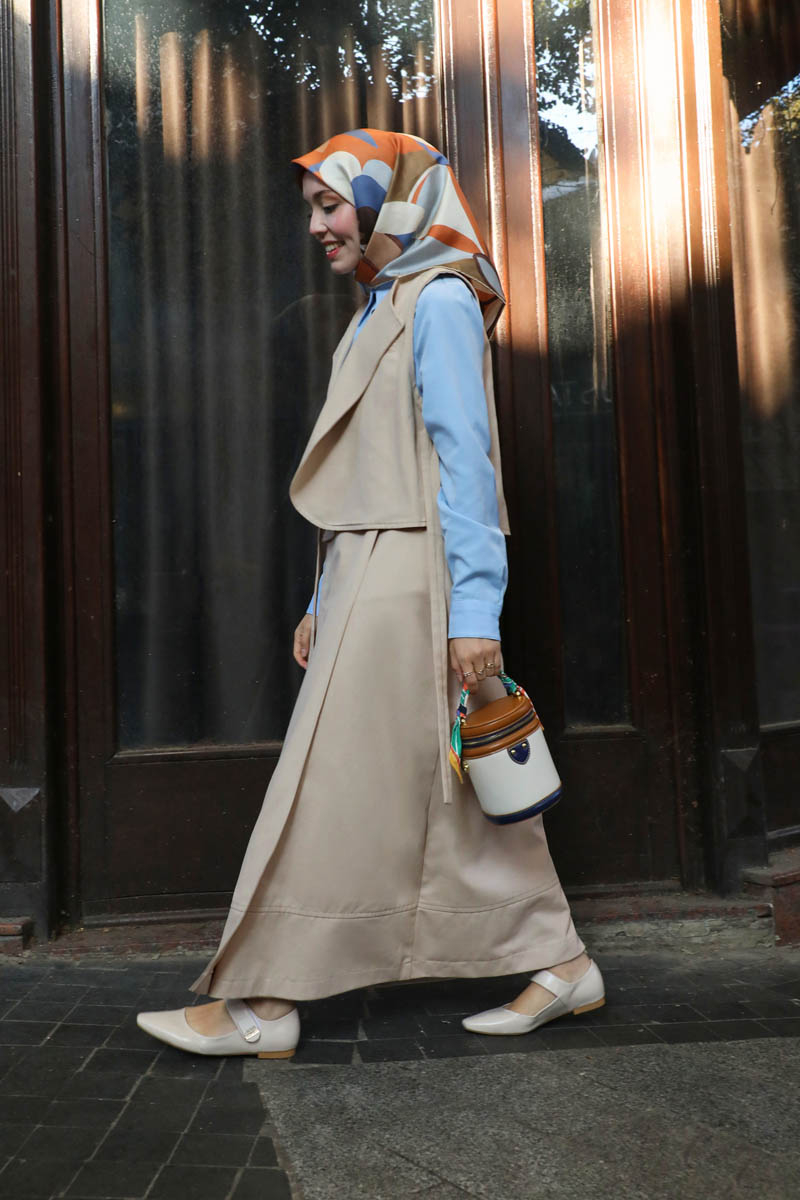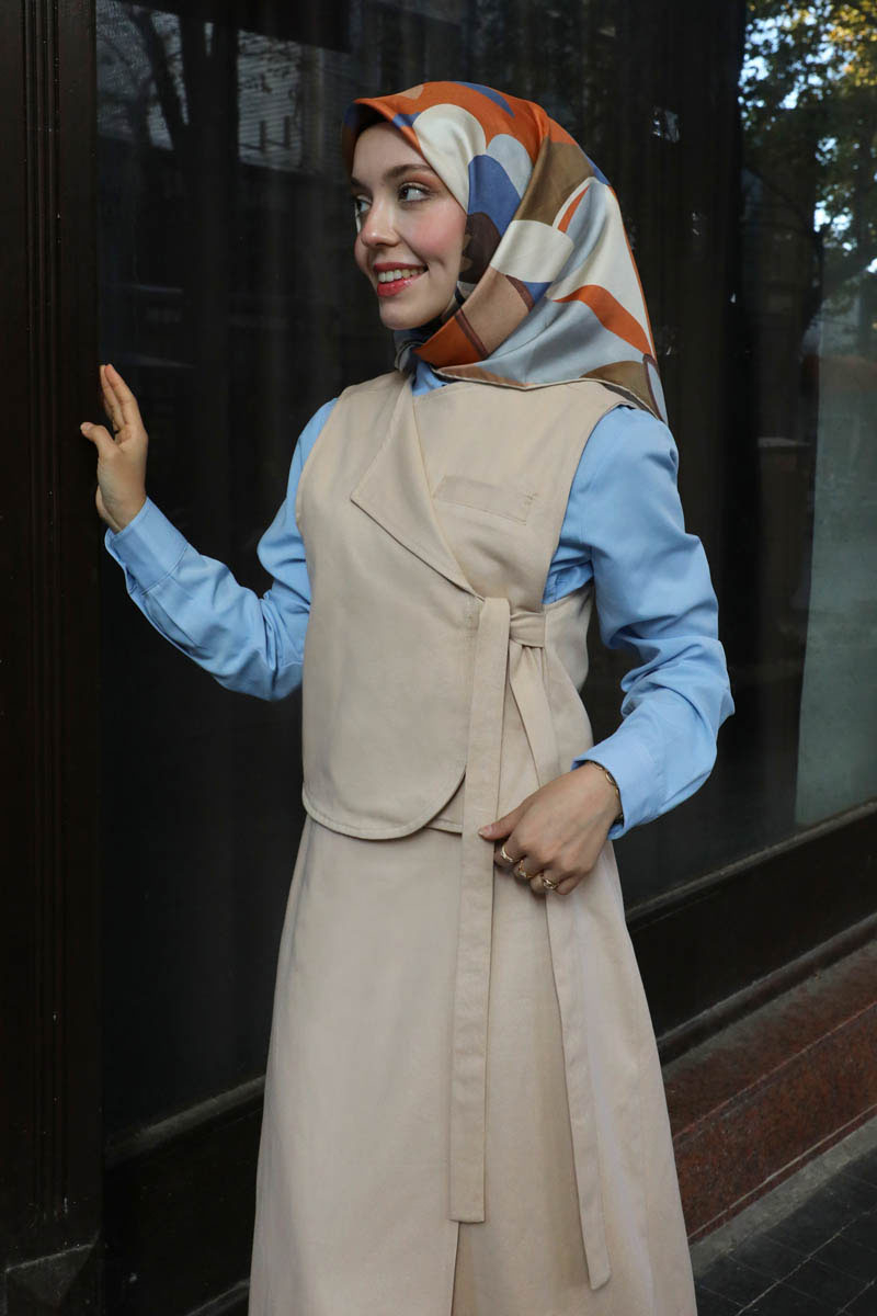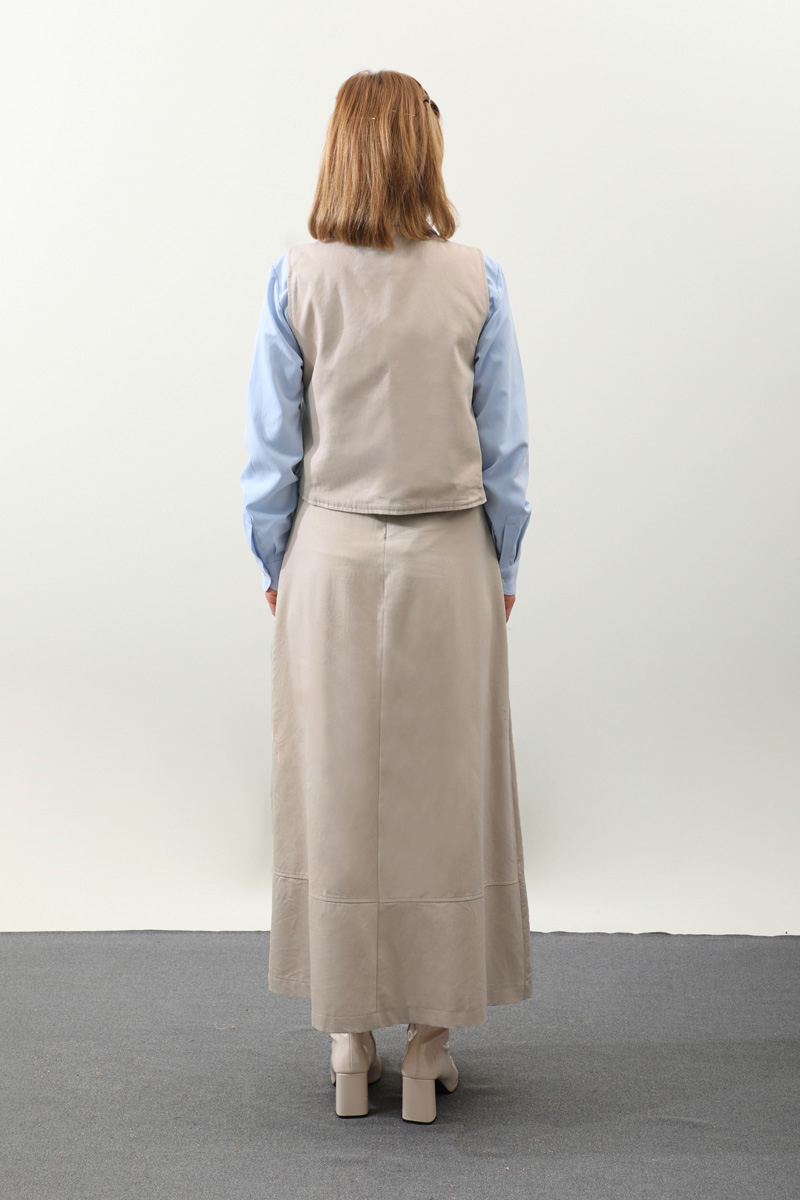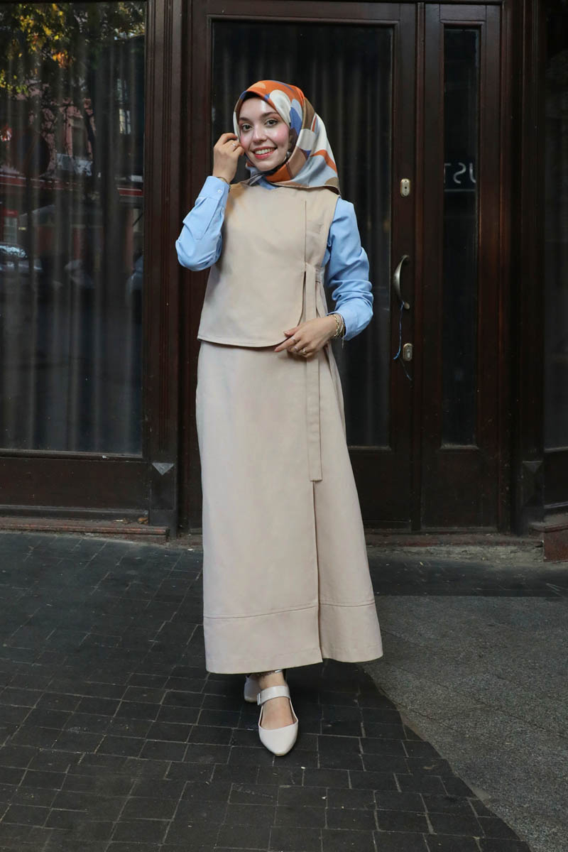 Yandan Bağlamalı Yelek Etek Takım Krem