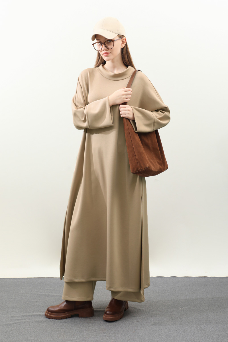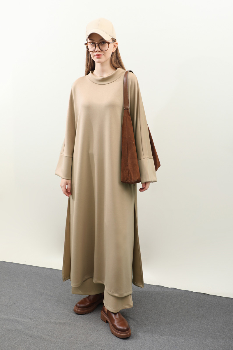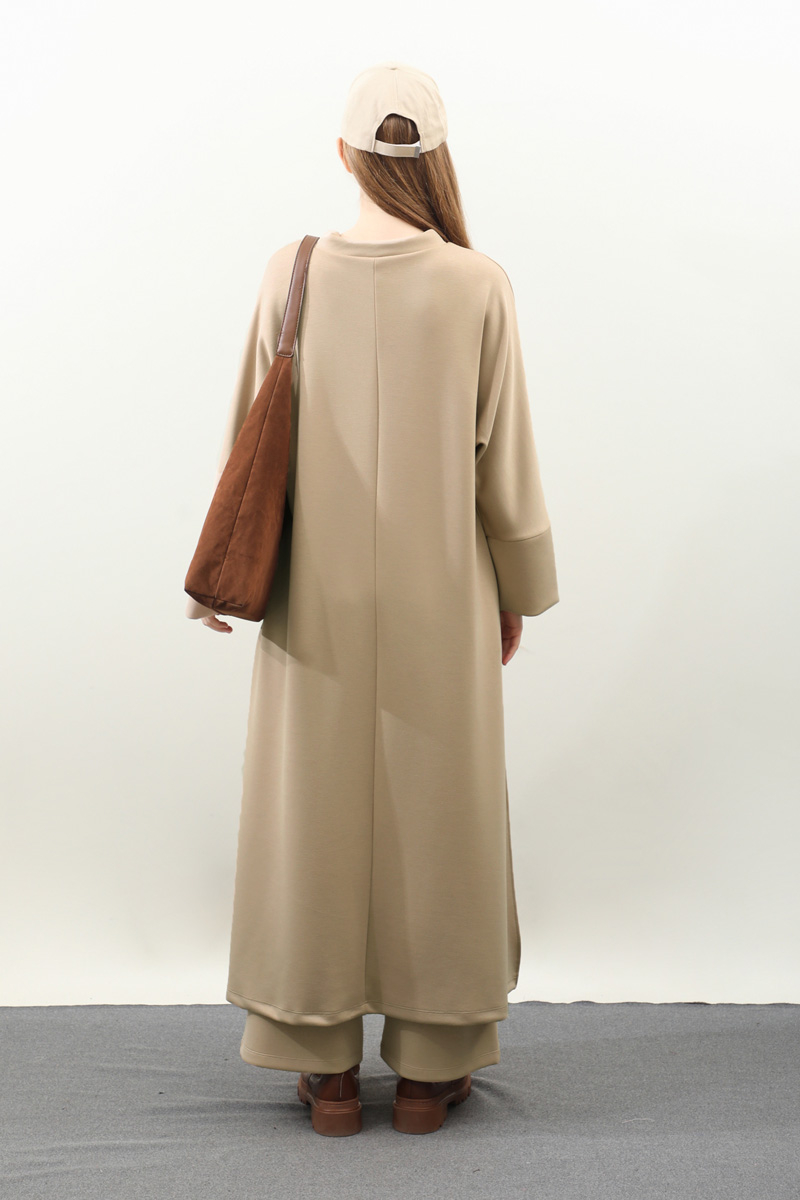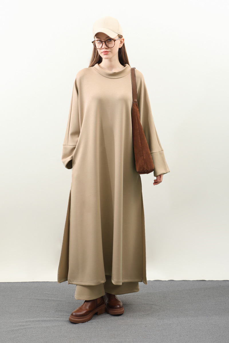 Yandan Yırtmaçlı Uzun Takım Bej. Dökümlü balıkçı yaka, geniş kol ve kalın maşetli, yandan yırtmaç detaylıdır ve gizli ceplidir. Üst tunik pantolon beli lastiklidir bol paçadır. Salaş kalıbı ve yumuşak dokulu kumaşı ile rahatlığına önem verenler için tasarlanmıştır.