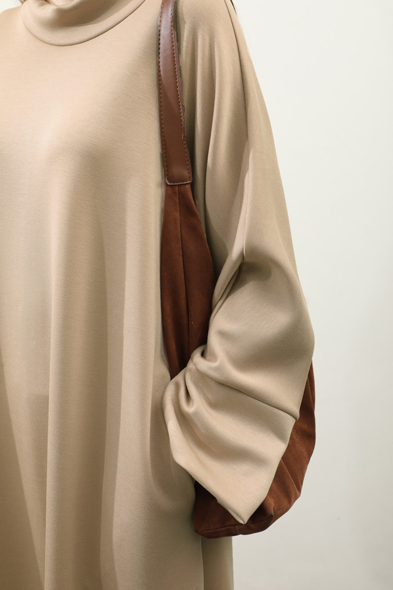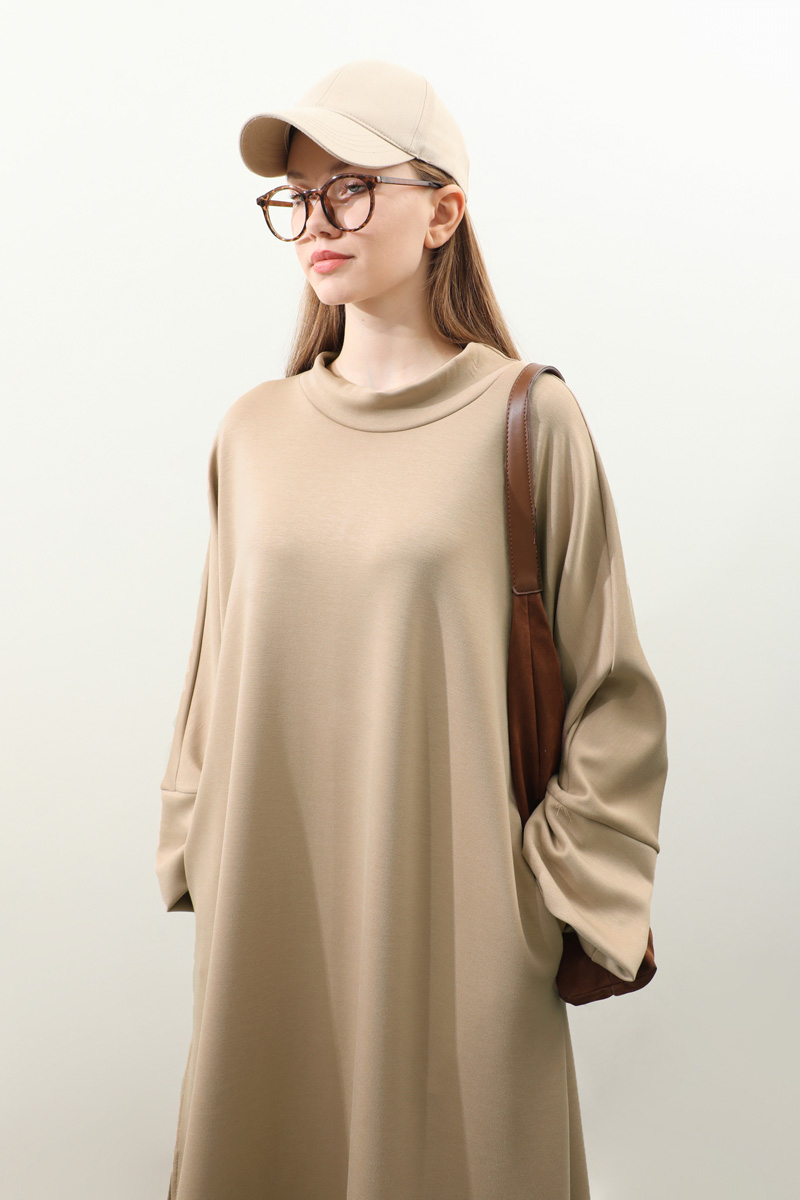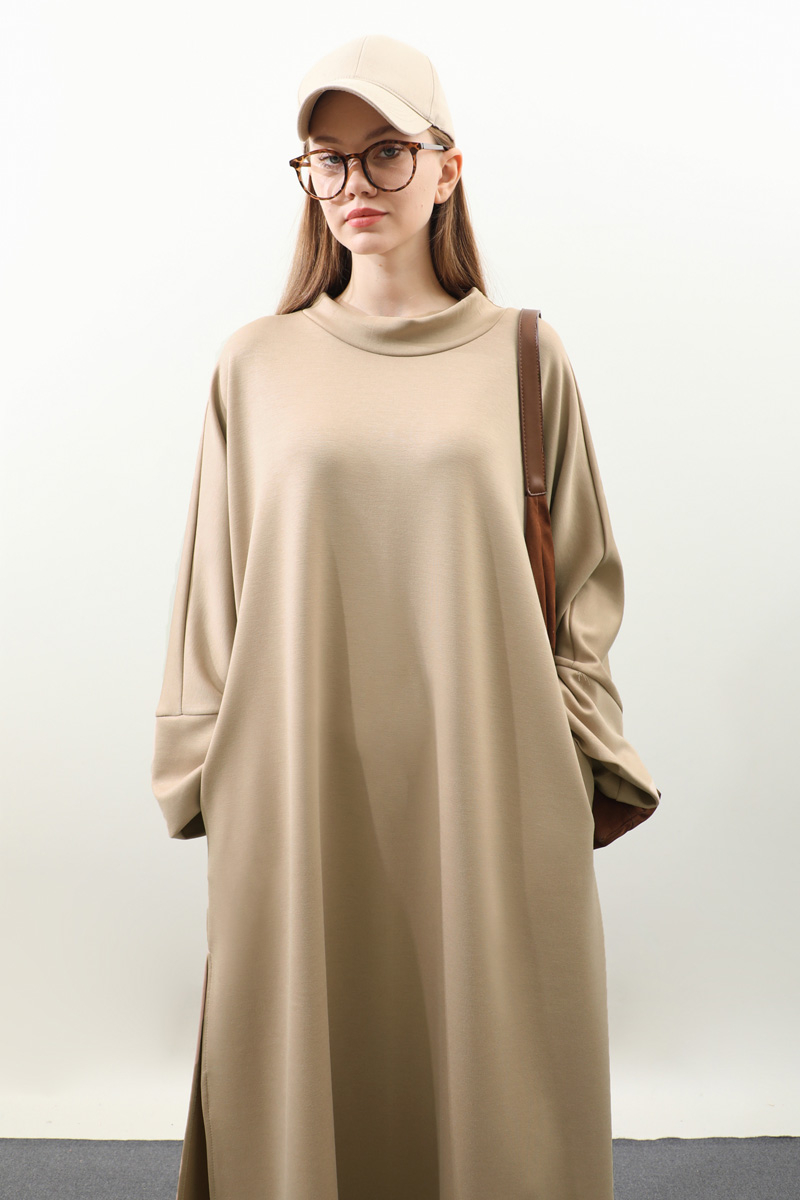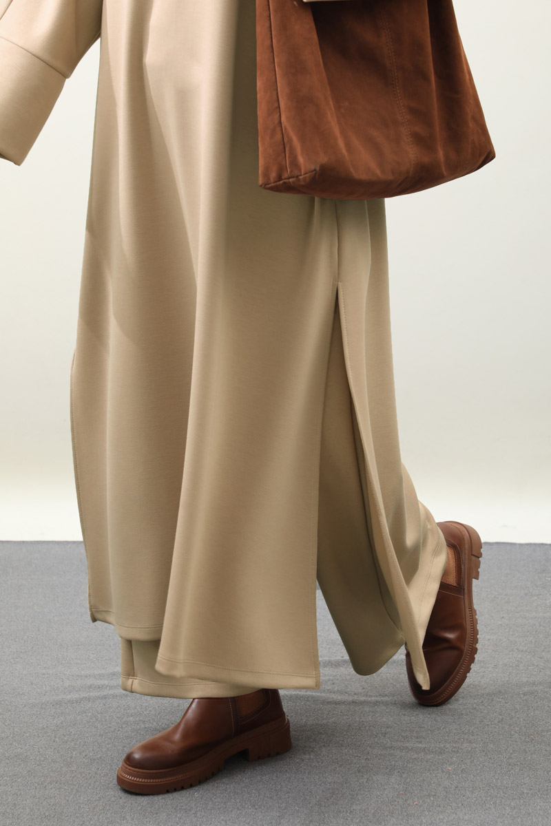 Yandan Yırtmaçlı Uzun Takım Bej. Dökümlü balıkçı yaka, geniş kol ve kalın maşetli, yandan yırtmaç detaylıdır ve gizli ceplidir. Üst tunik pantolon beli lastiklidir bol paçadır. Salaş kalıbı ve yumuşak dokulu kumaşı ile rahatlığına önem verenler için tasarlanmıştır.