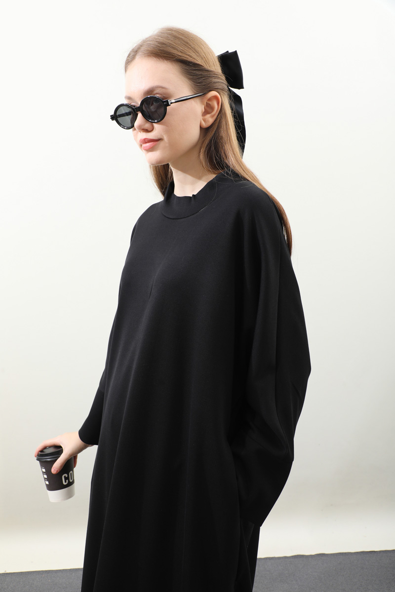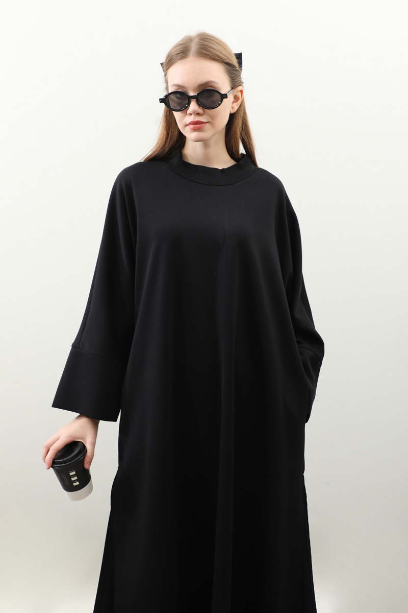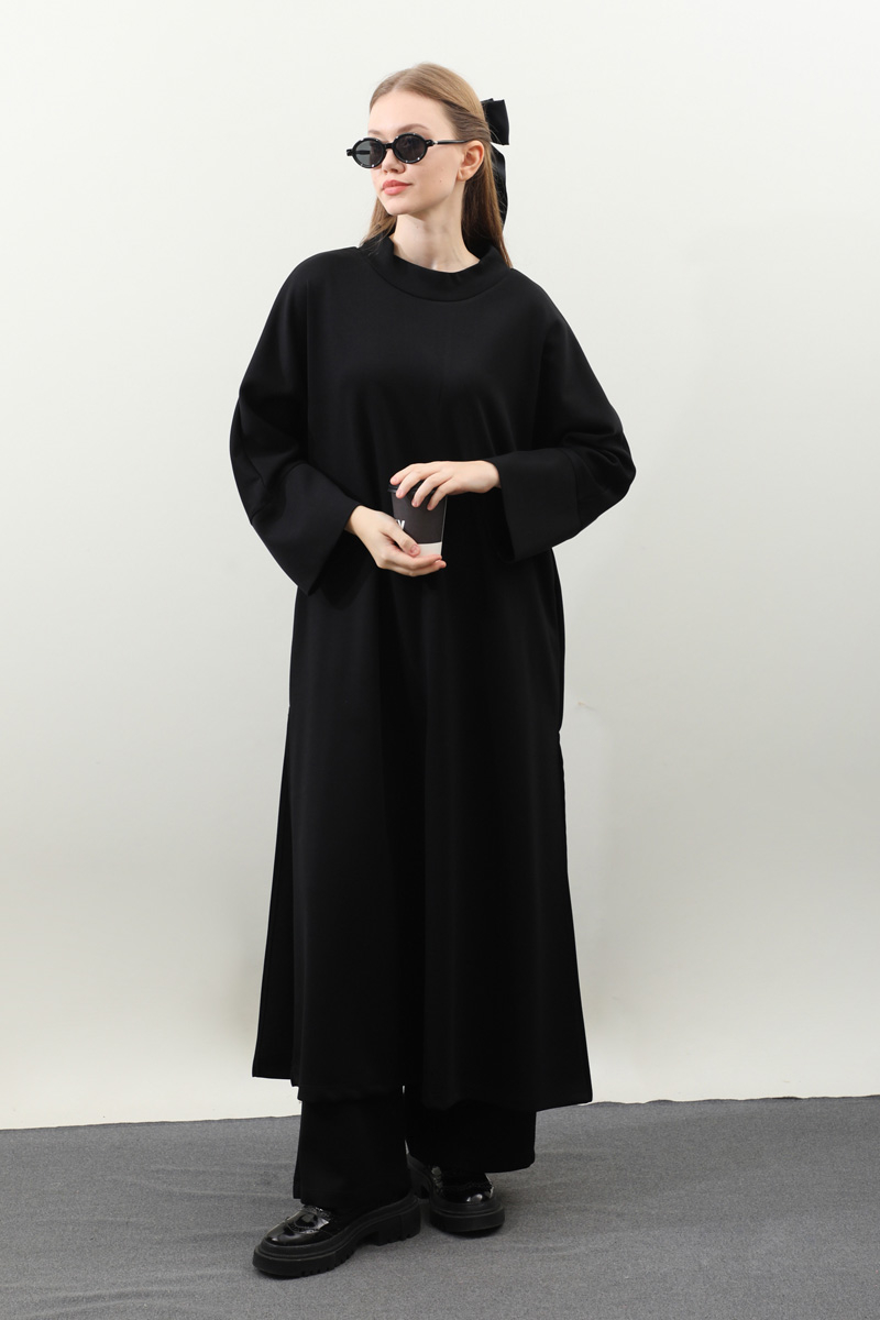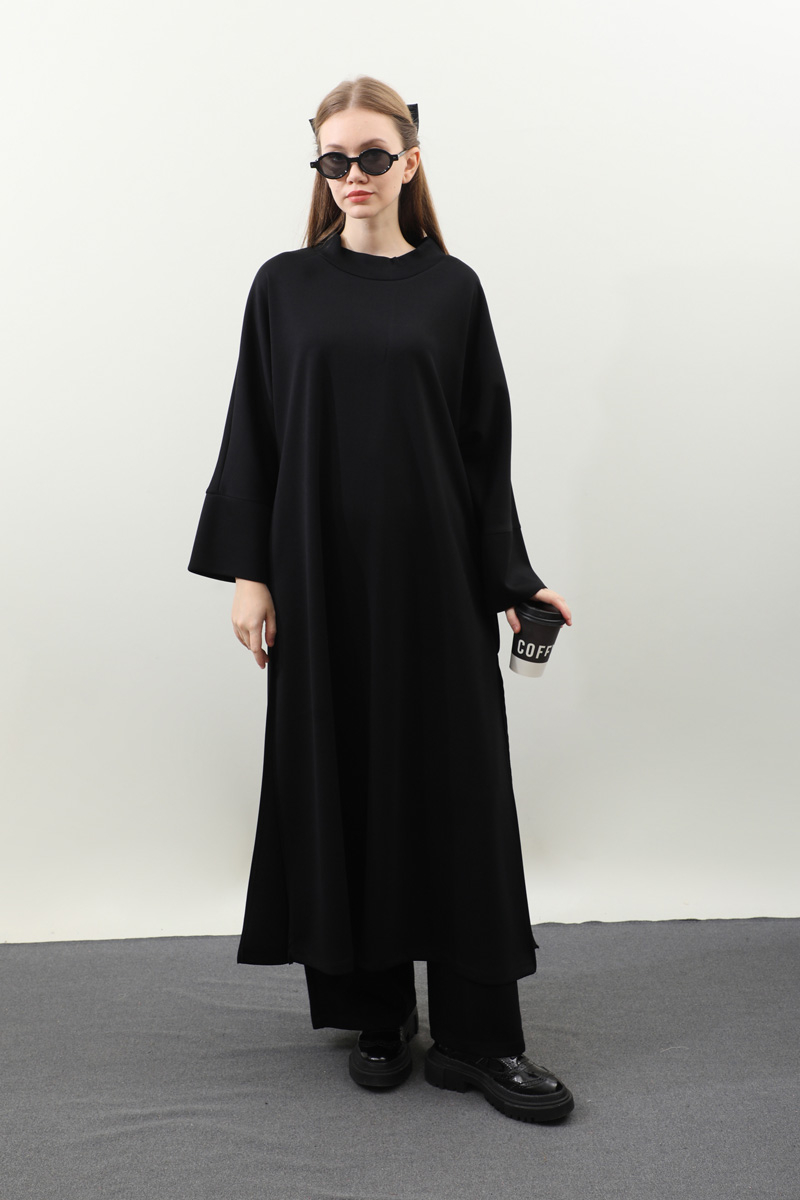 Yandan Yırtmaçlı Uzun Takım Siyah. Dökümlü balıkçı yaka, geniş kol ve kalın maşetli, yandan yırtmaç detaylıdır ve gizli ceplidir. Üst tunik pantolon beli lastiklidir bol paçadır. Salaş kalıbı ve yumuşak dokulu kumaşı ile rahatlığına önem verenler için tasarlanmıştır.