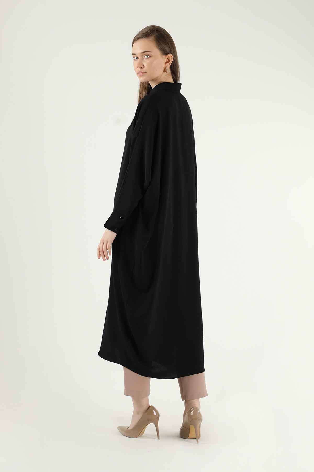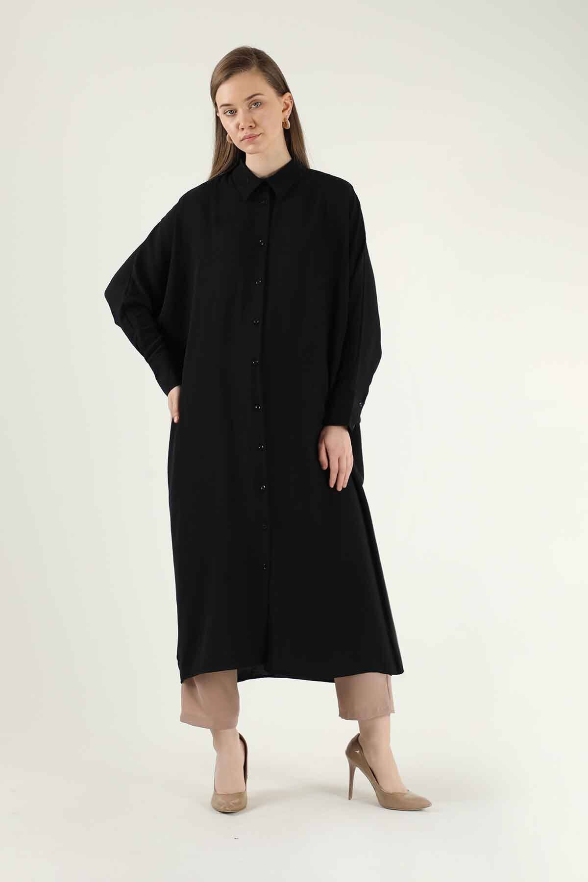 Düğmeli Uzun Gömlek Siyah. Yarasa kolludur. Yakalıdır. Düğmelidir. Astarsızdır. Özel günleriniz de veya günlük olarak tercih edebilirsiniz.
