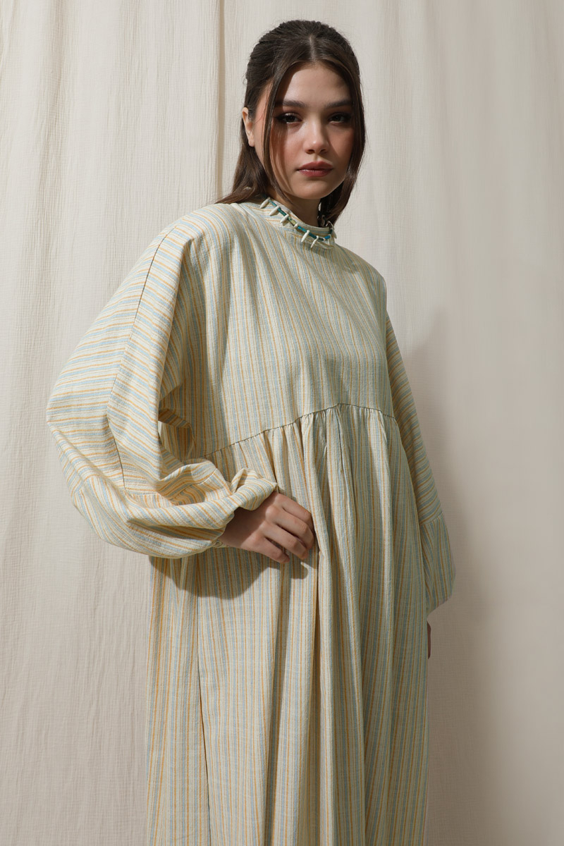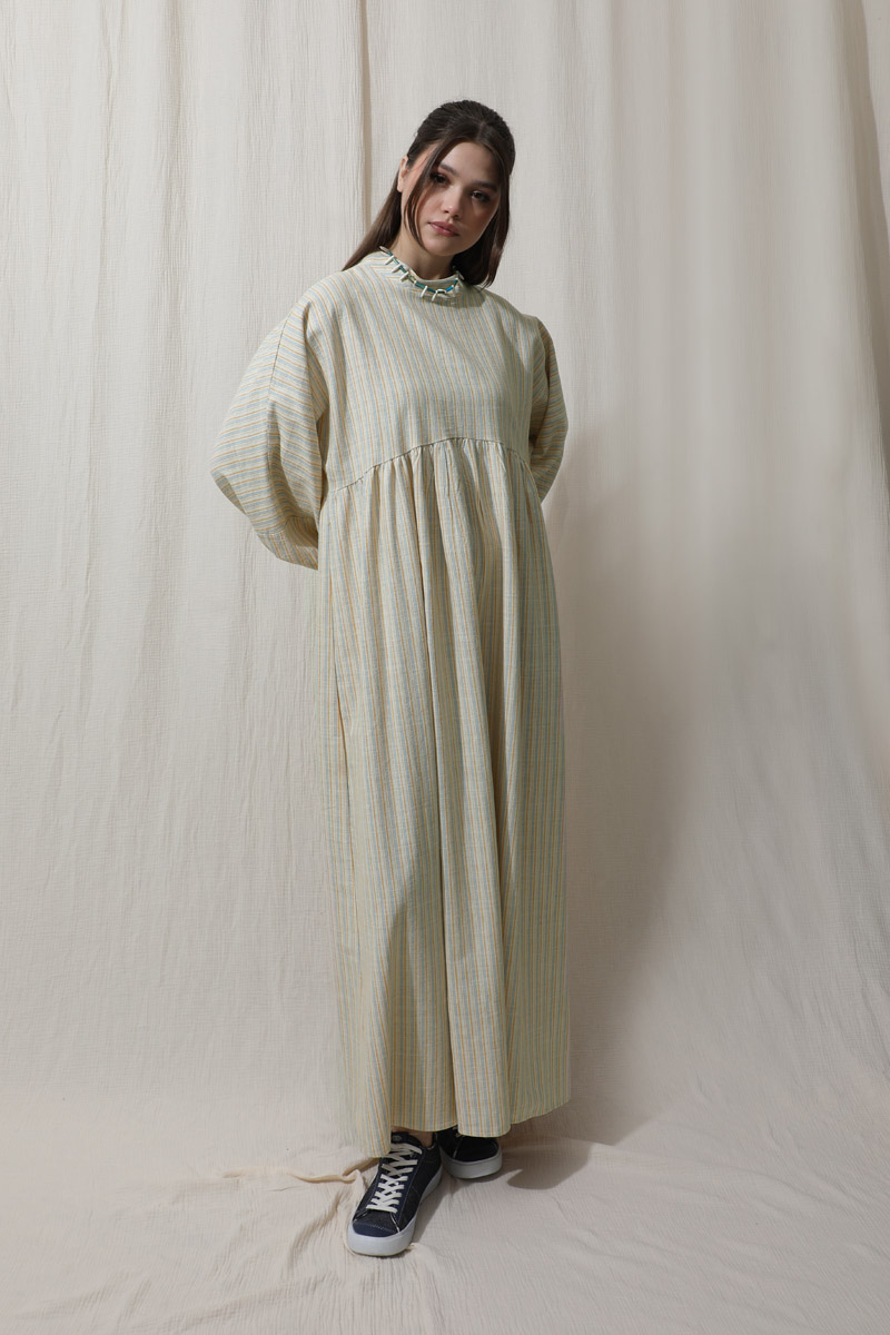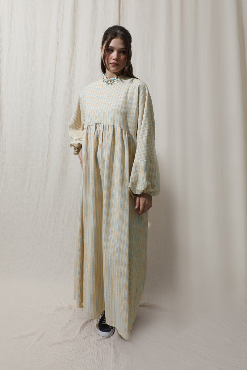 Çizgili Keten Elbise Bebe Mavisi. Dik yakalıdır. Yarasa kolludur. Bedeni kesik büzgü detaylıdır. Manşeti lastiklidir. Günlük kullanım ve özel günlerinizde tercih edebilirsiniz.