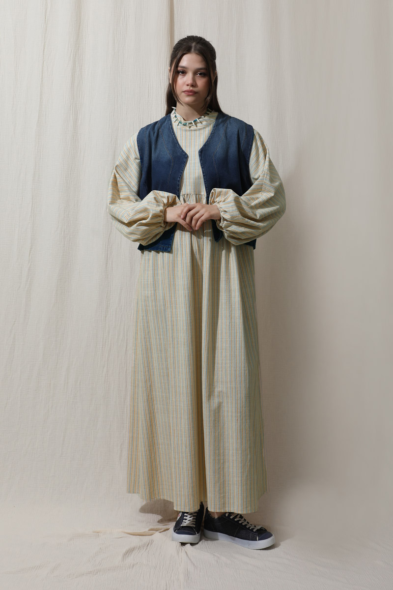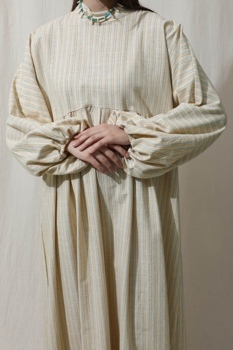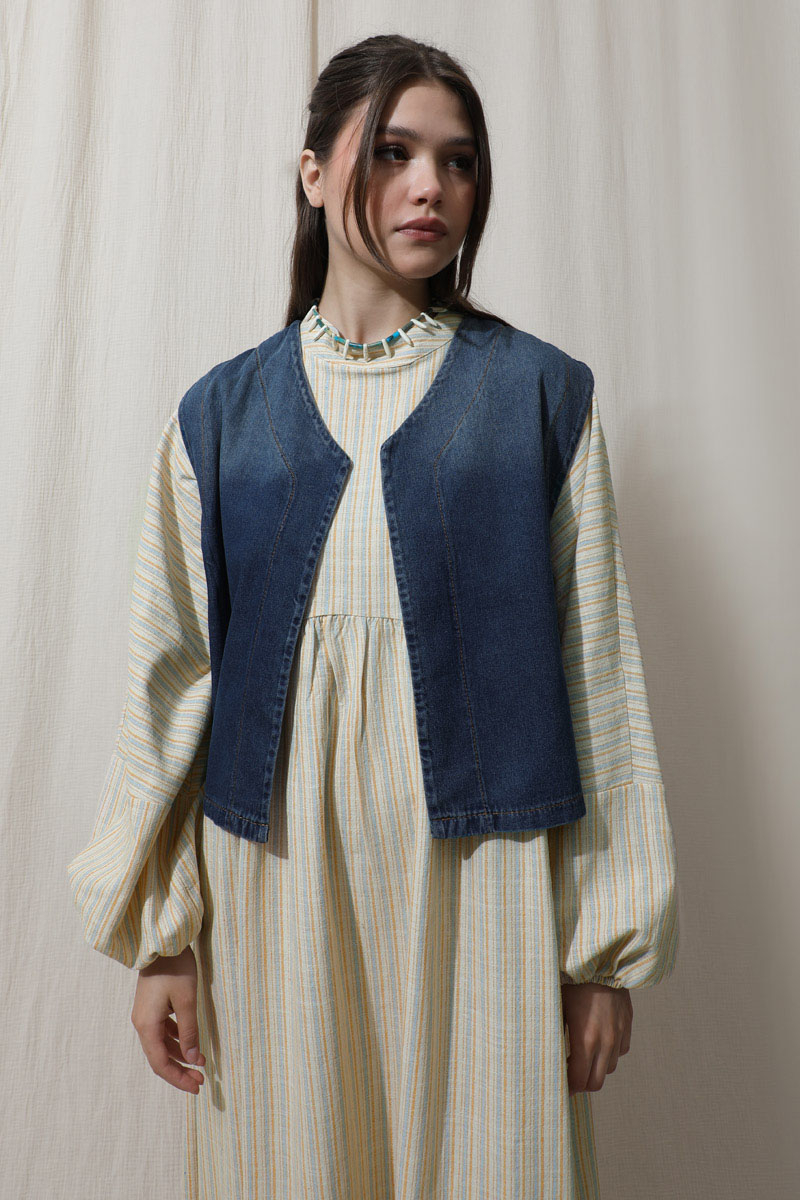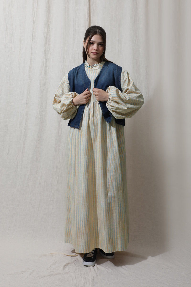 Çizgili Keten Elbise Bebe Mavisi. Dik yakalıdır. Yarasa kolludur. Bedeni kesik büzgü detaylıdır. Manşeti lastiklidir. Günlük kullanım ve özel günlerinizde tercih edebilirsiniz.