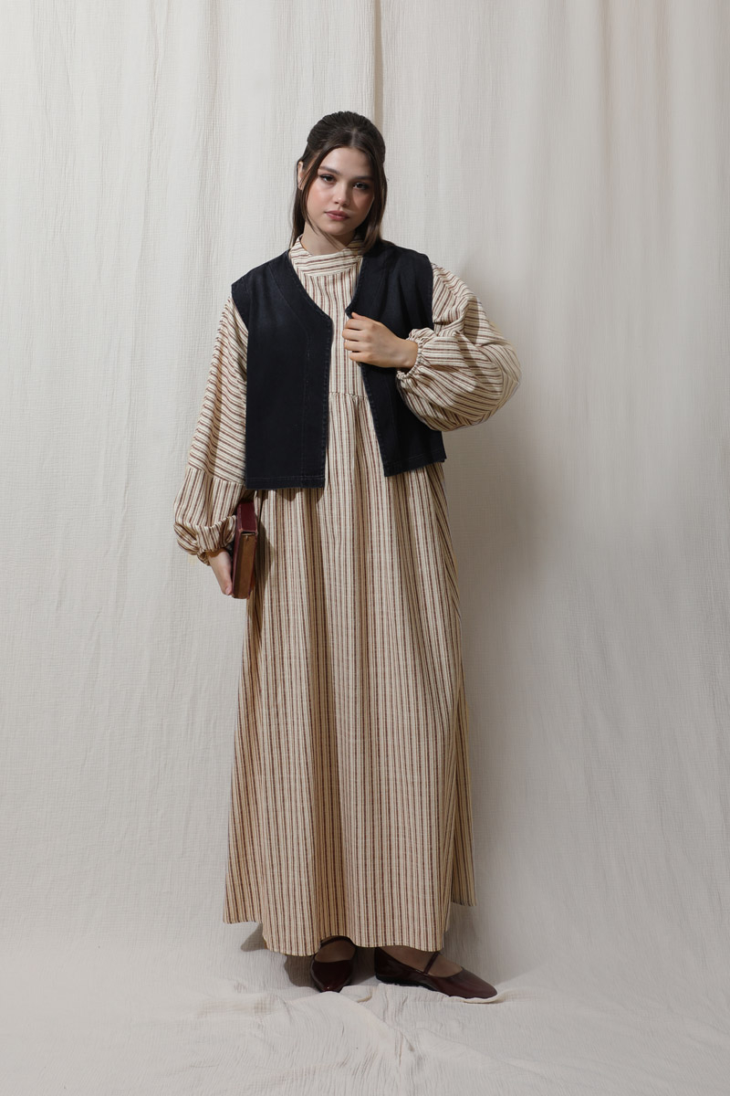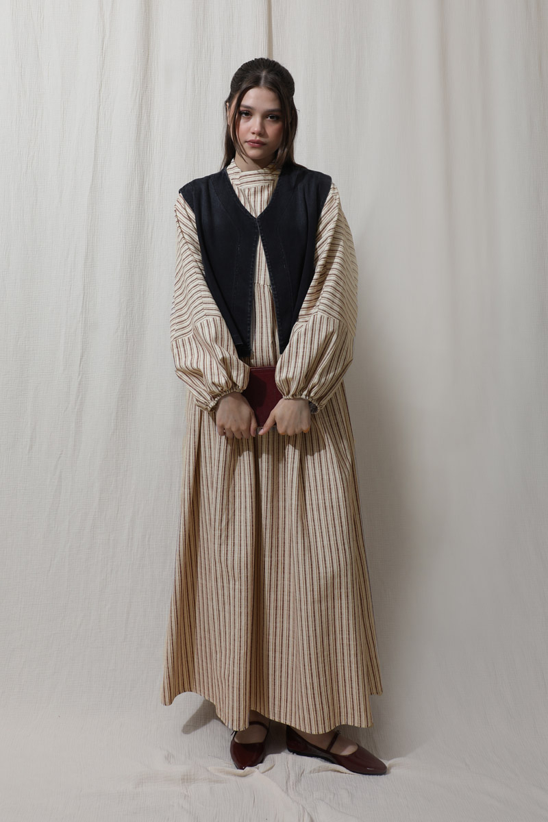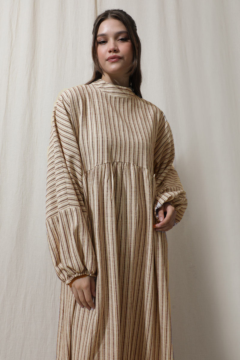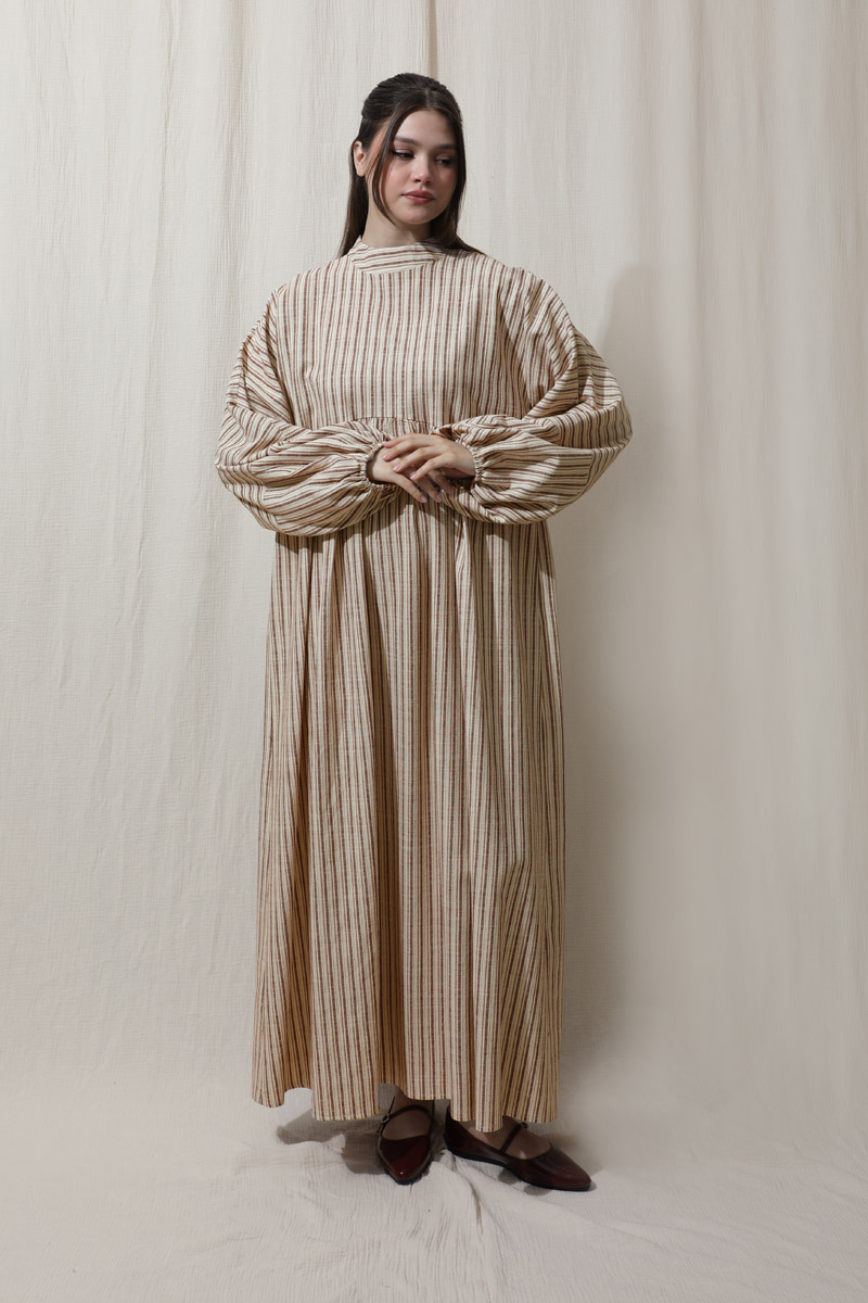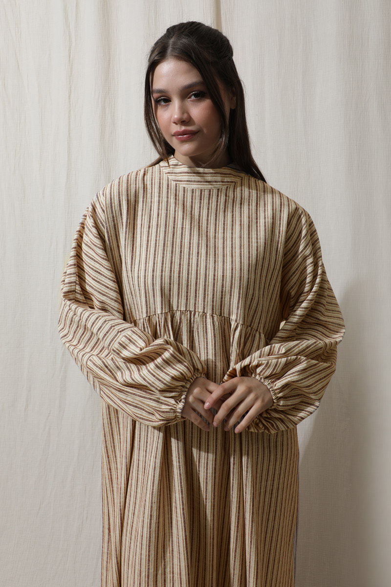 Çizgili Keten Elbise Bordo. Dik yakalıdır. Yarasa kolludur. Bedeni kesik büzgü detaylıdır. Manşeti lastiklidir. Günlük kullanım ve özel günlerinizde tercih edebilirsiniz.
