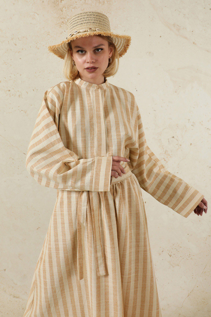 Yarasa Kol Keten Takım Camel. Bluz yarasa kol detaylıdır. Bilezik manşet detaylıdır. Hakim yaka ve gizli düğmelidir. Etek yandan ceplidir. Yandan gizli fermuarlıdır. Arkadan lastiklidir. Kuşaklıdır. Günlük kullanım ve özel günlerinizde tercih edebilirsiniz.
