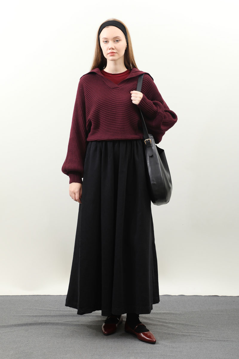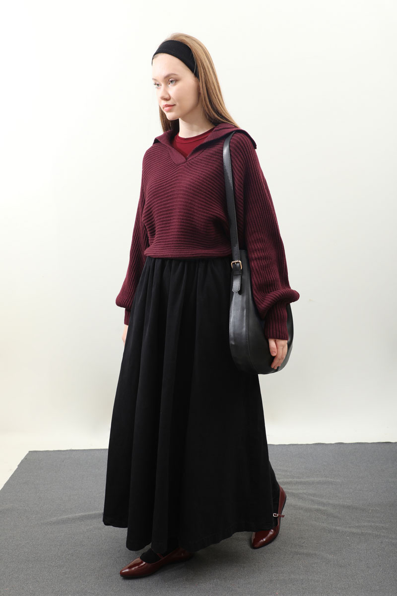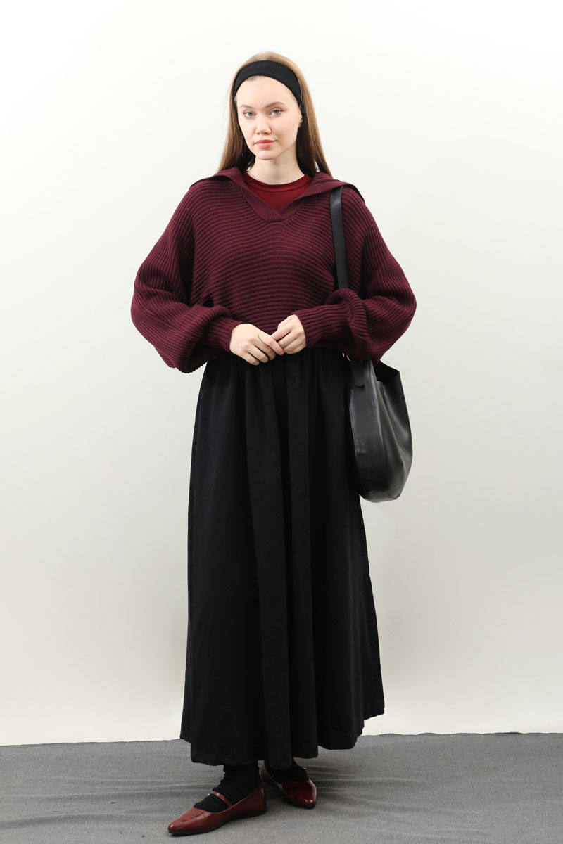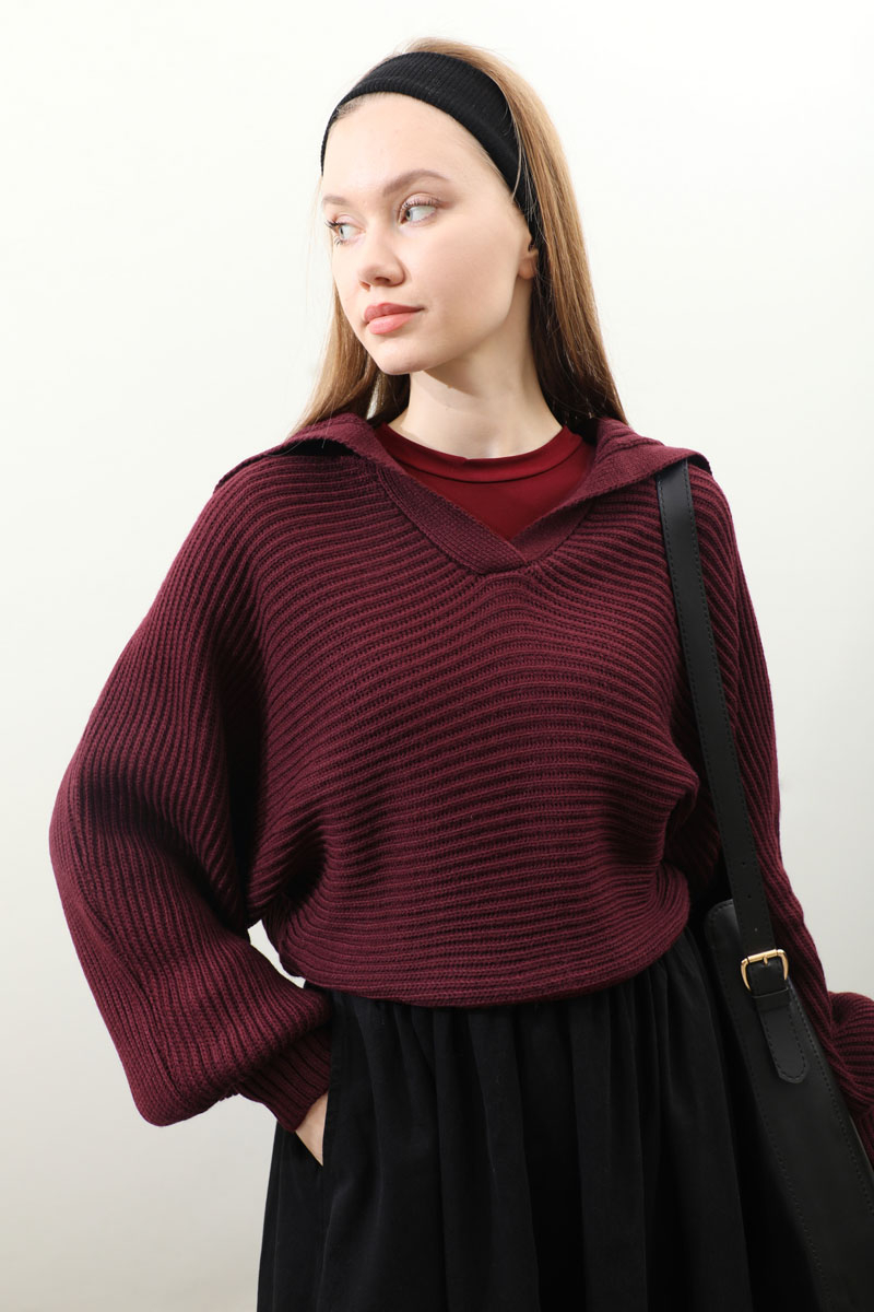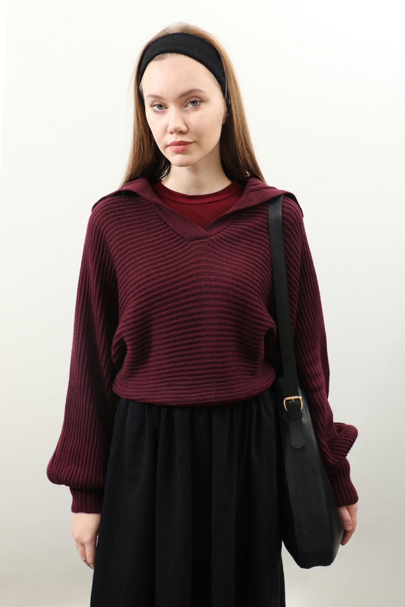 Yarasa Kol Kısa Kazak Bordo. Geniş yakadır, yarasa kolludur, uzun manşetliidr, enine çizgi detaylıdır. Günlük kullanım ve özel günlerinizde tercih edebilirsiniz.