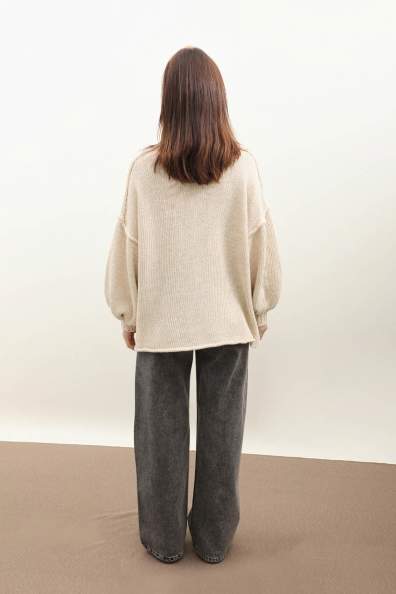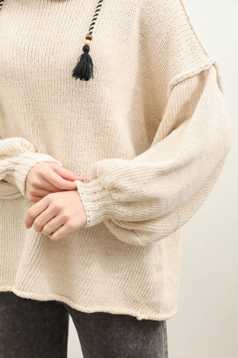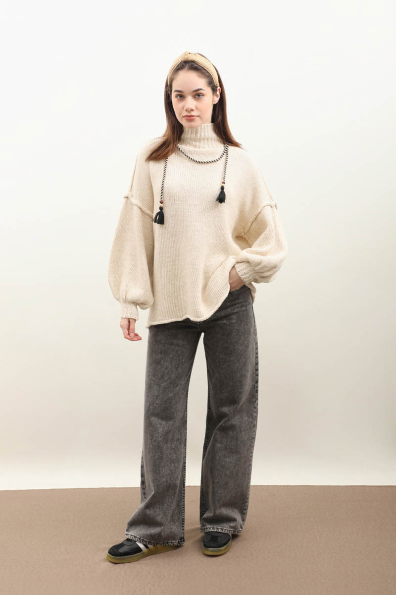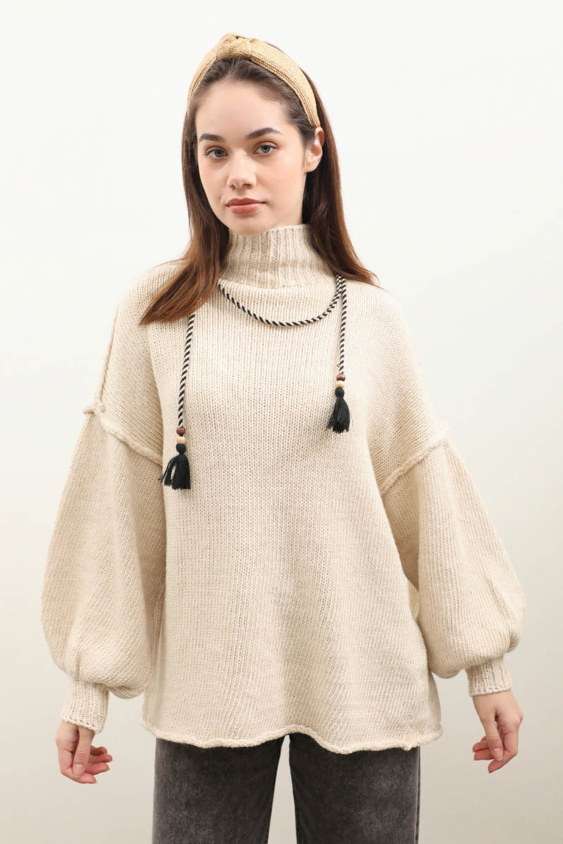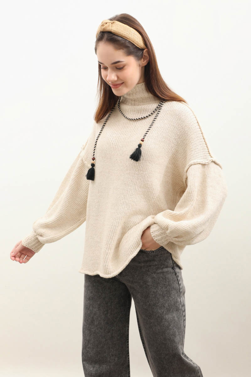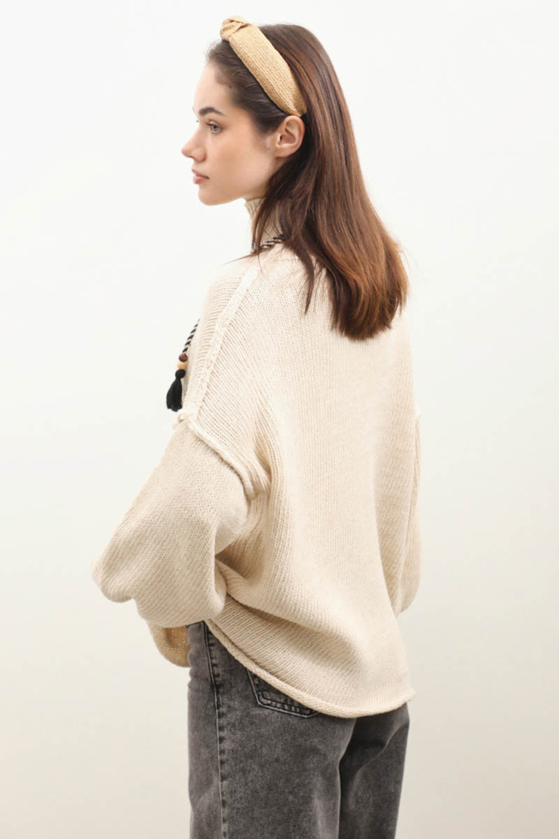 Yarım Balıkçı Kazak Bej. Balıkçı yakadır, düşük omuzludur, manşetli ribanalı dikiş detaylıdır, oversize kalıptır. Günlük kullanım ve özel günlerinizde tercih edebilirsiniz.
