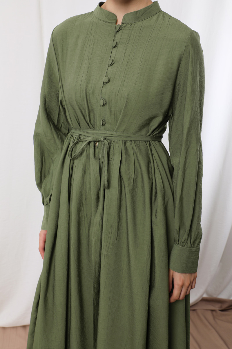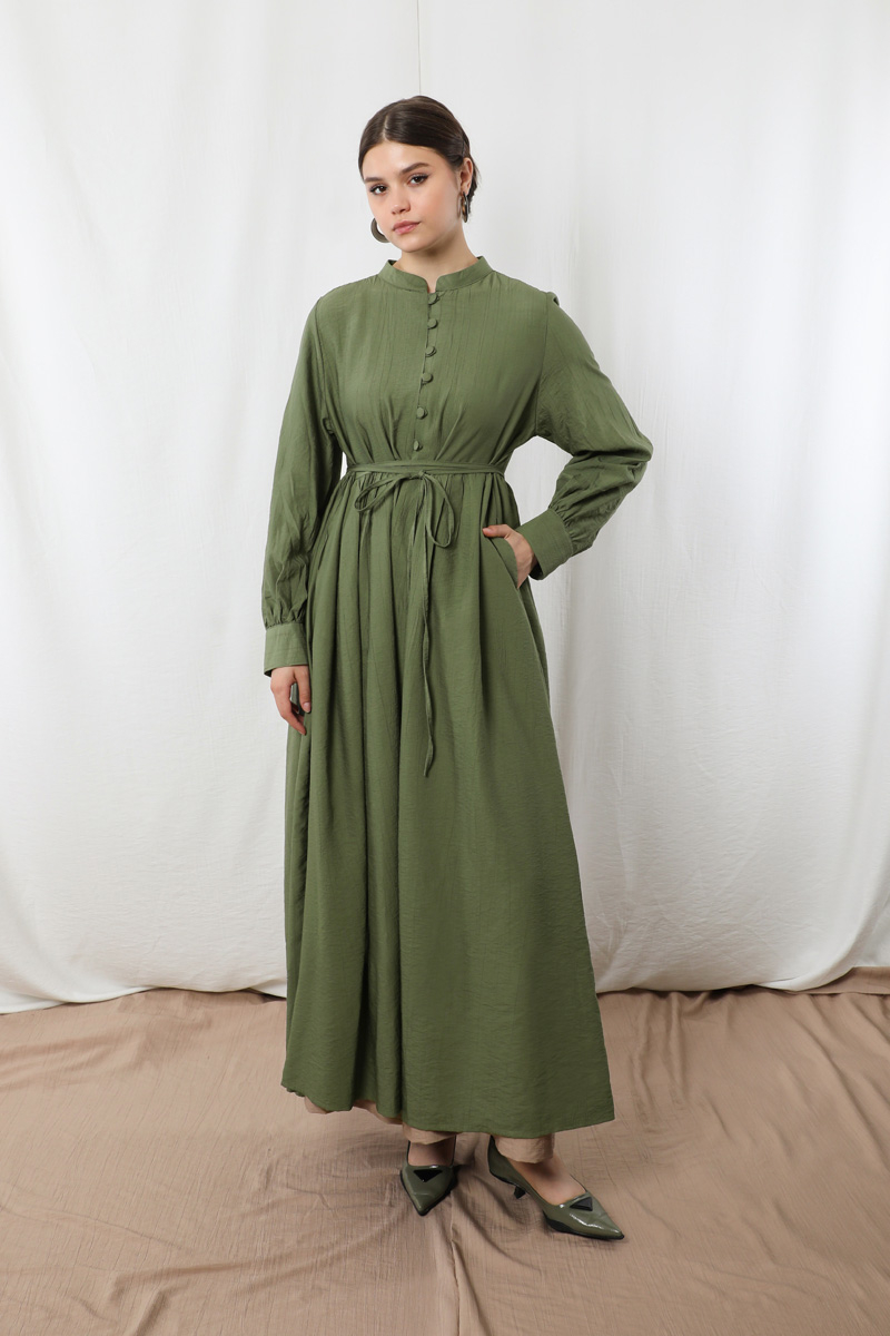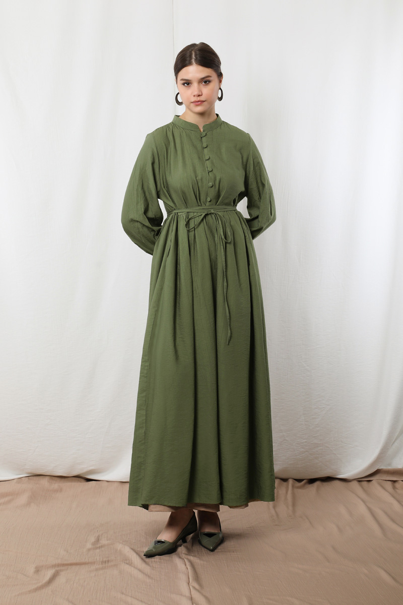 Yarım Düğmeli Abaya Takım Haki Bej. Hakim yakalıdır. Önü yarım birit düğmelidir. Manşeti birit düğmelidir ve büzgülüdür. Beli kesikli büzgülüdür. Uzun ve ince kuşaklıdır. Pantolon beli lastiklidir. Yandan ceplidir. Geniş paçalıdır. Astarsızdır.