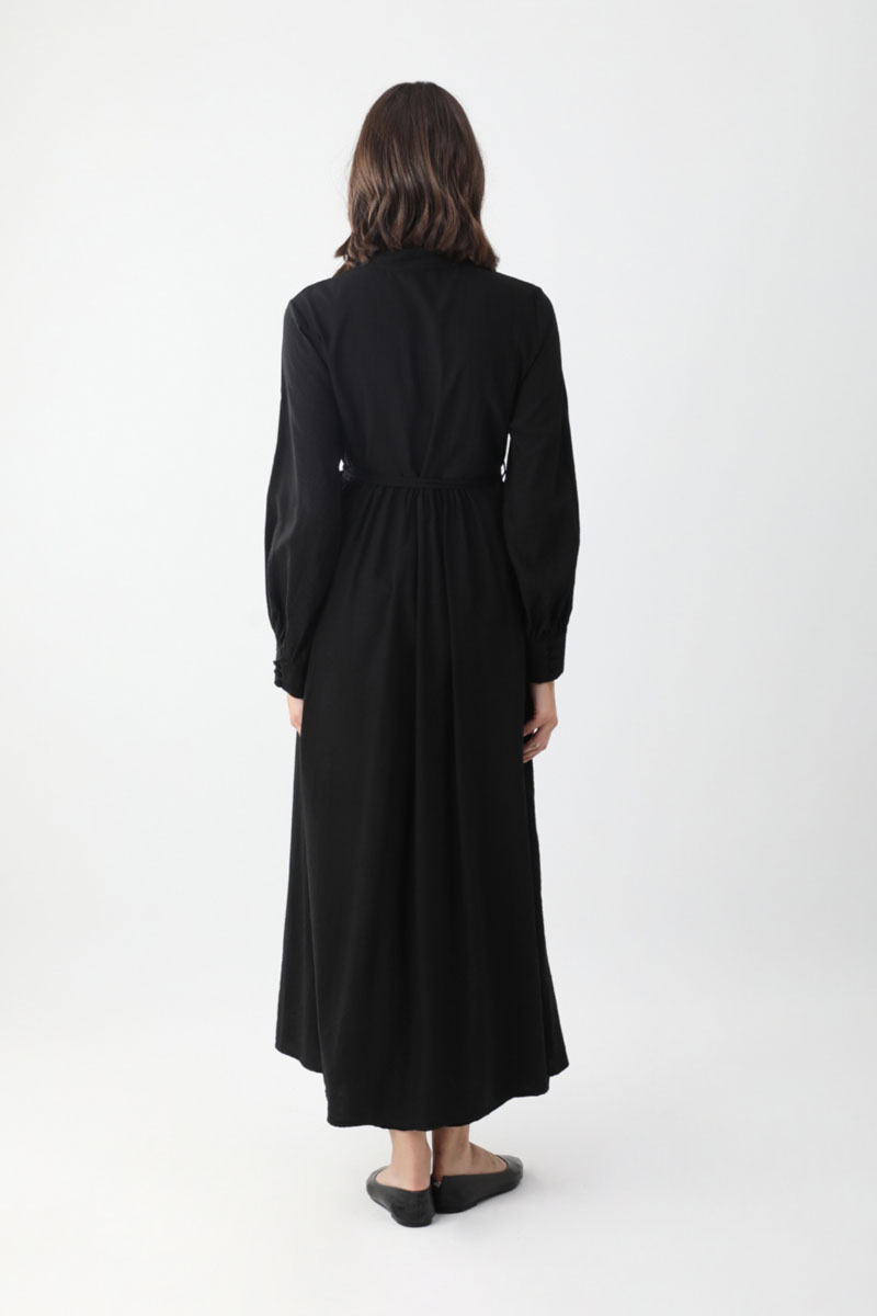 Yarım Düğmeli Abaya Takım Siyah. Hakim yakalıdır. Önü yarım birit düğmelidir. Manşeti birit düğmelidir ve büzgülüdür. Beli kesikli büzgülüdür. Uzun ve ince kuşaklıdır. Pantolon beli lastiklidir. Yandan ceplidir. Geniş paçalıdır. Astarsızdır.