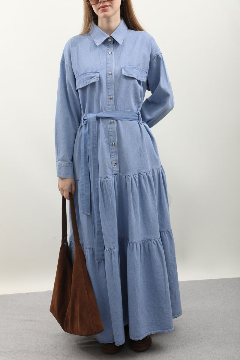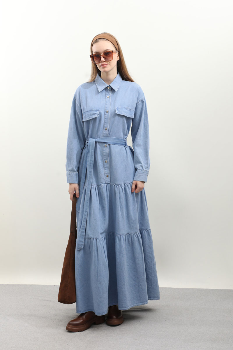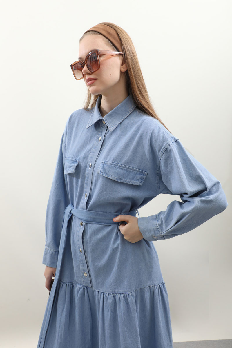 Yarım Düğmeli Kot Elbise Açık Mavi Önden düğme detaylıdır. Cepli ve Kuşaklı Geniş Manşetli Günlük kullanım ve özel günlerinizde tercih edebilirsiniz.