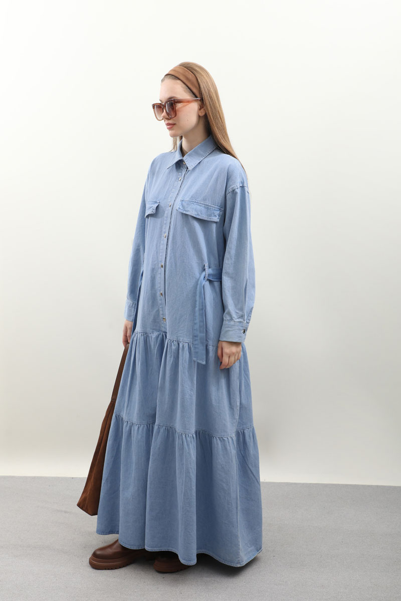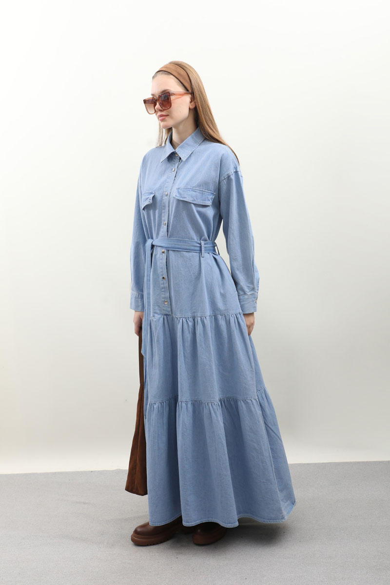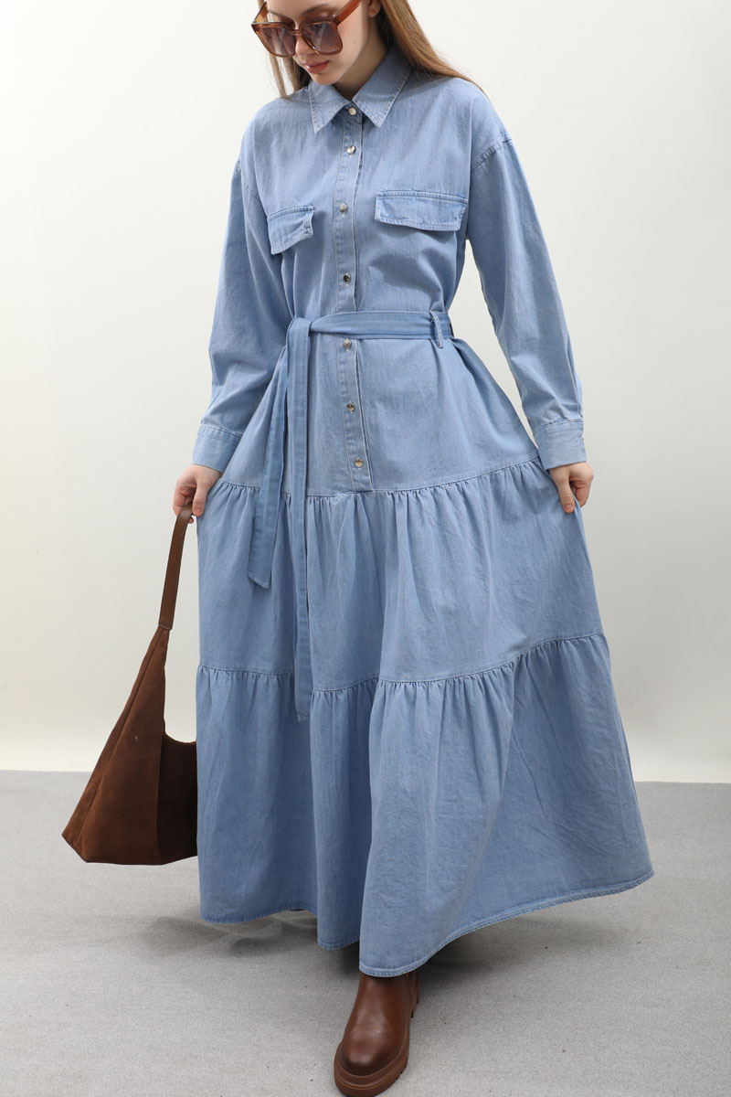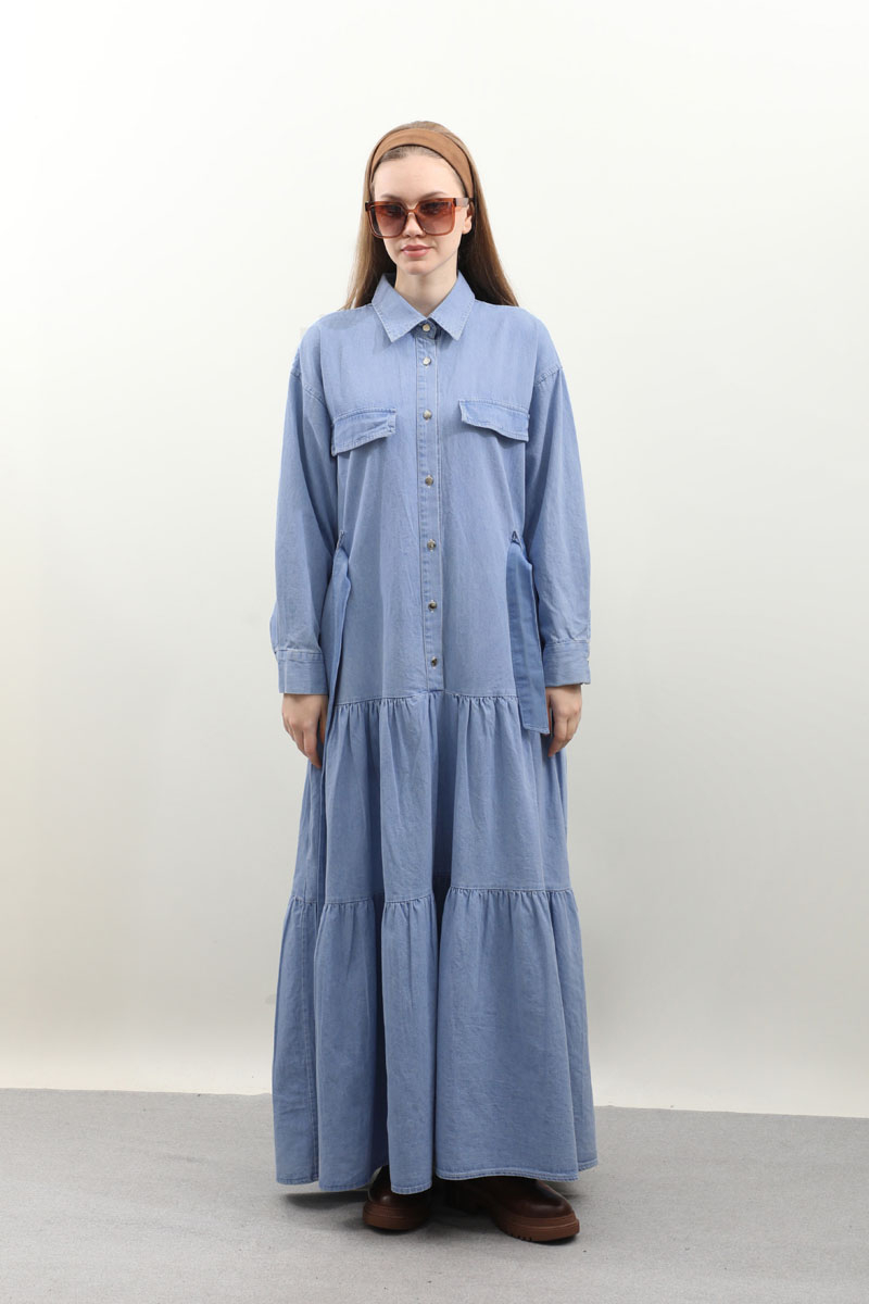 Yarım Düğmeli Kot Elbise Açık Mavi Önden düğme detaylıdır. Cepli ve Kuşaklı Geniş Manşetli Günlük kullanım ve özel günlerinizde tercih edebilirsiniz.