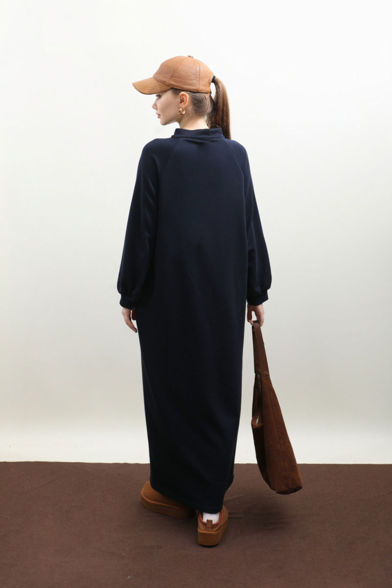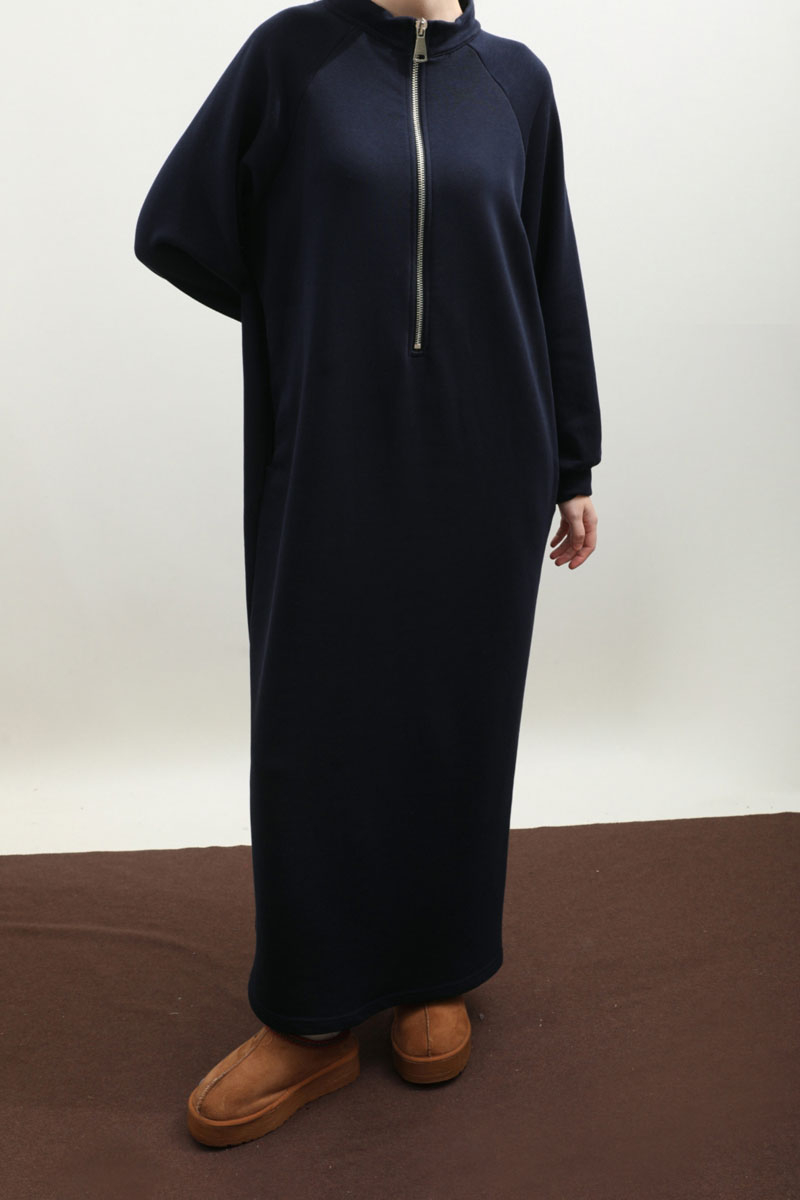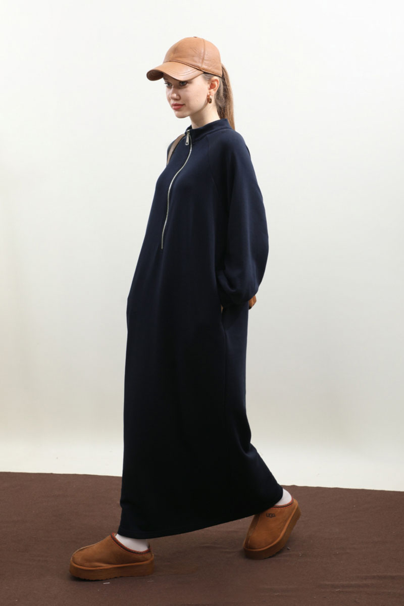 Yarım Fermuarlı Sweat Elbise Lacivert. Hakim yaka, öndern yarım fermuarlı, reglan kol, kalın manşetli, yandan gizli ceplidir. Mevsimlik üründür.