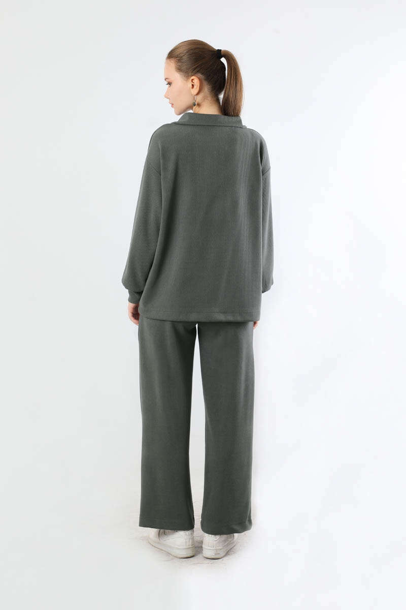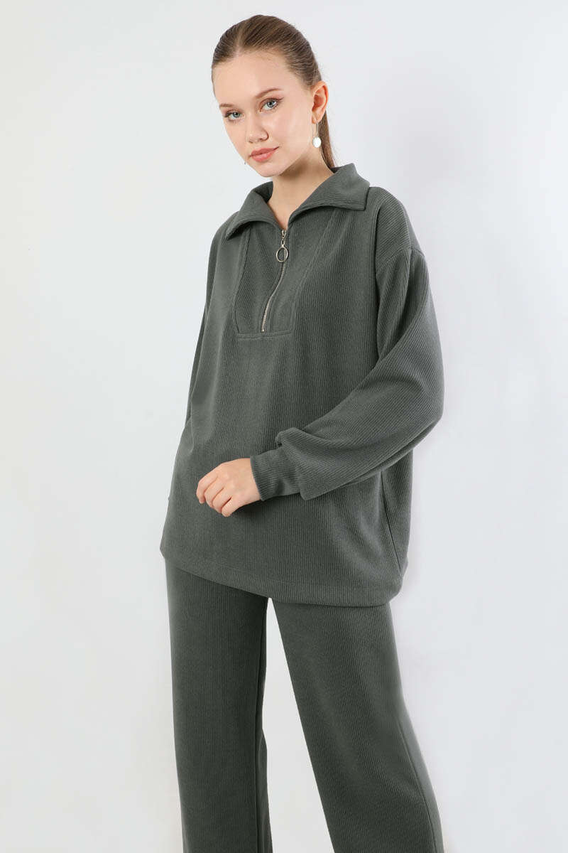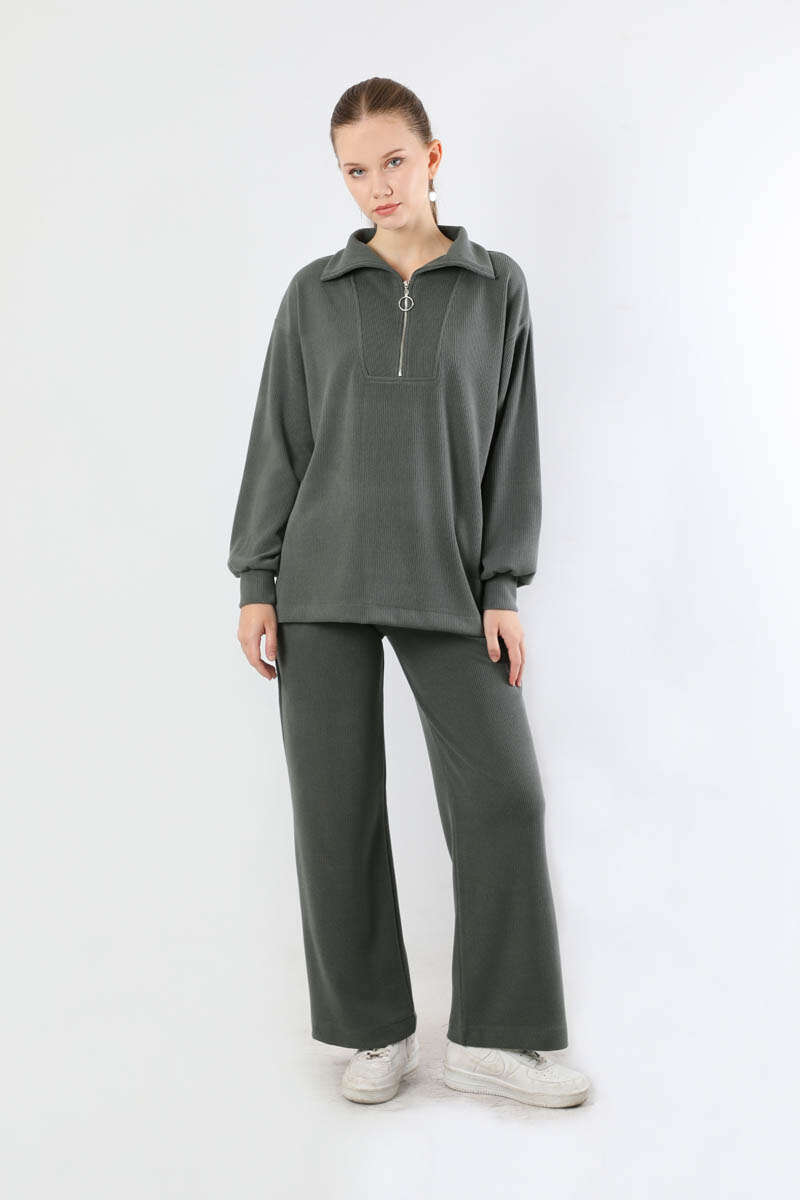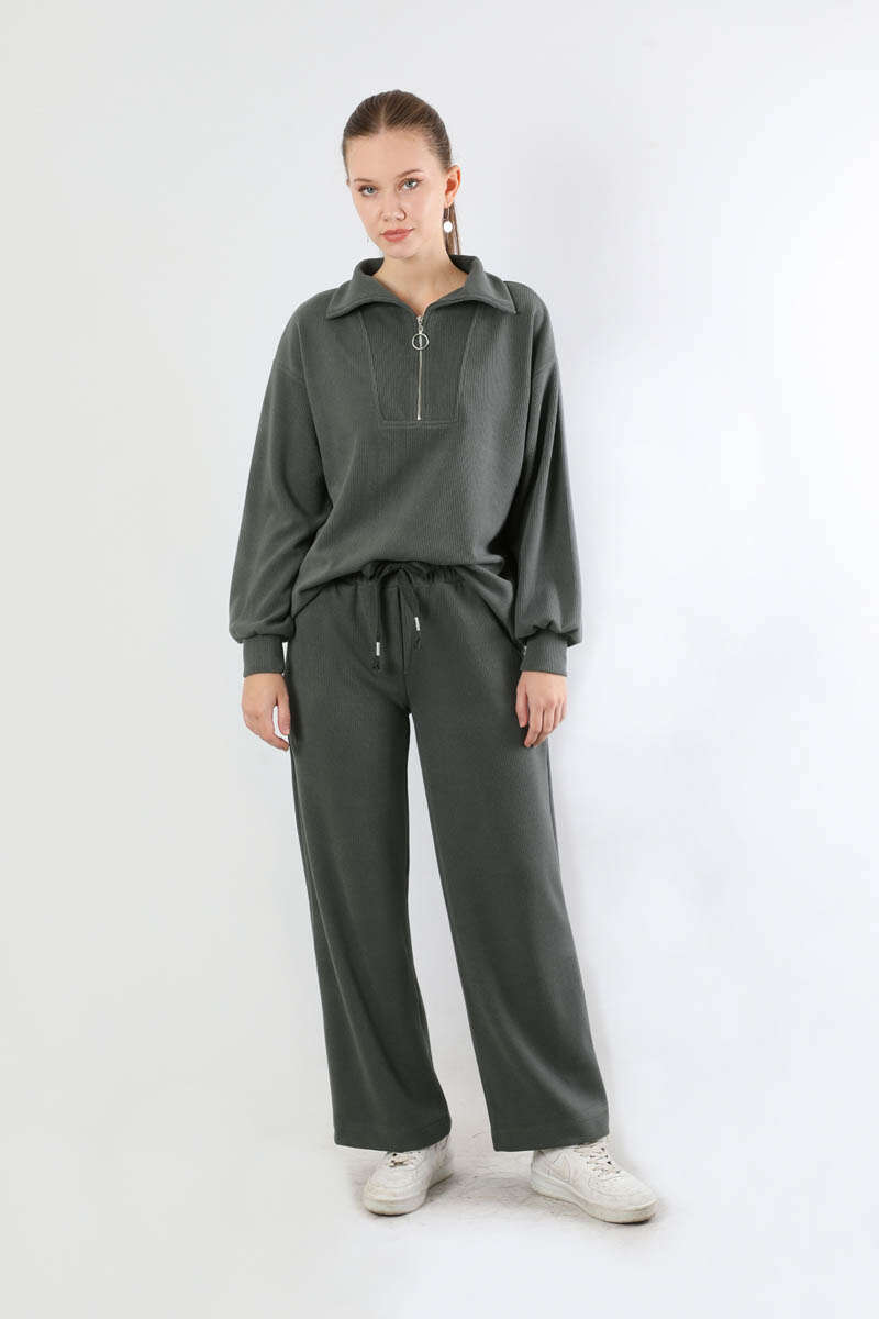 Yarım Fermuarlı Triko Takım Füme. Dik yaka ve fermuarlıdır. Düşük omuzludur. Önden robalıdır. Pantolon beli lastiklidir. Bol paçadır. Günlük kullanım ve özel günlerinizde tercih edebilirsiniz.
