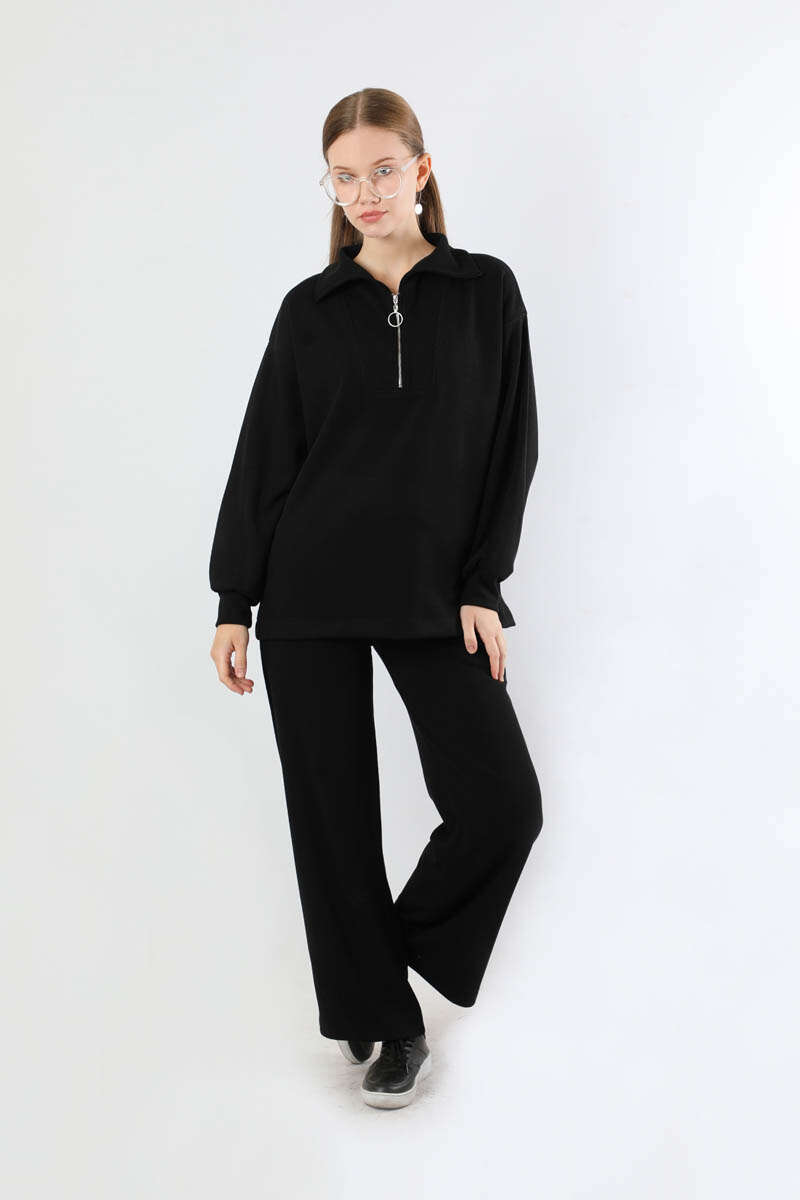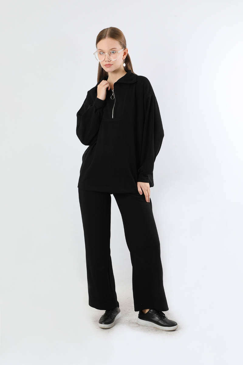 Yarım Fermuarlı Triko Takım Siyah. Dik yaka ve fermuarlıdır. Düşük omuzludur. Önden robalıdır. Pantolon beli lastiklidir. Bol paçadır. Günlük kullanım ve özel günlerinizde tercih edebilirsiniz.