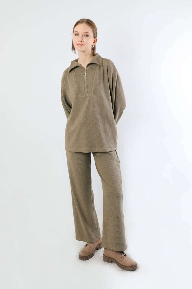 Yarım Fermuarlı Triko Takım Toprak. Dik yaka ve fermuarlıdır. Düşük omuzludur. Önden robalıdır. Pantolon beli lastiklidir. Bol paçadır. Günlük kullanım ve özel günlerinizde tercih edebilirsiniz.