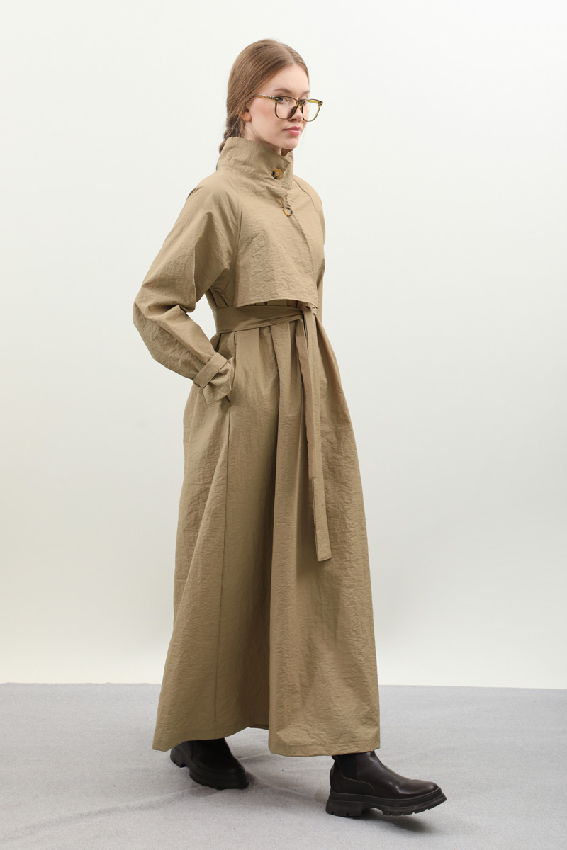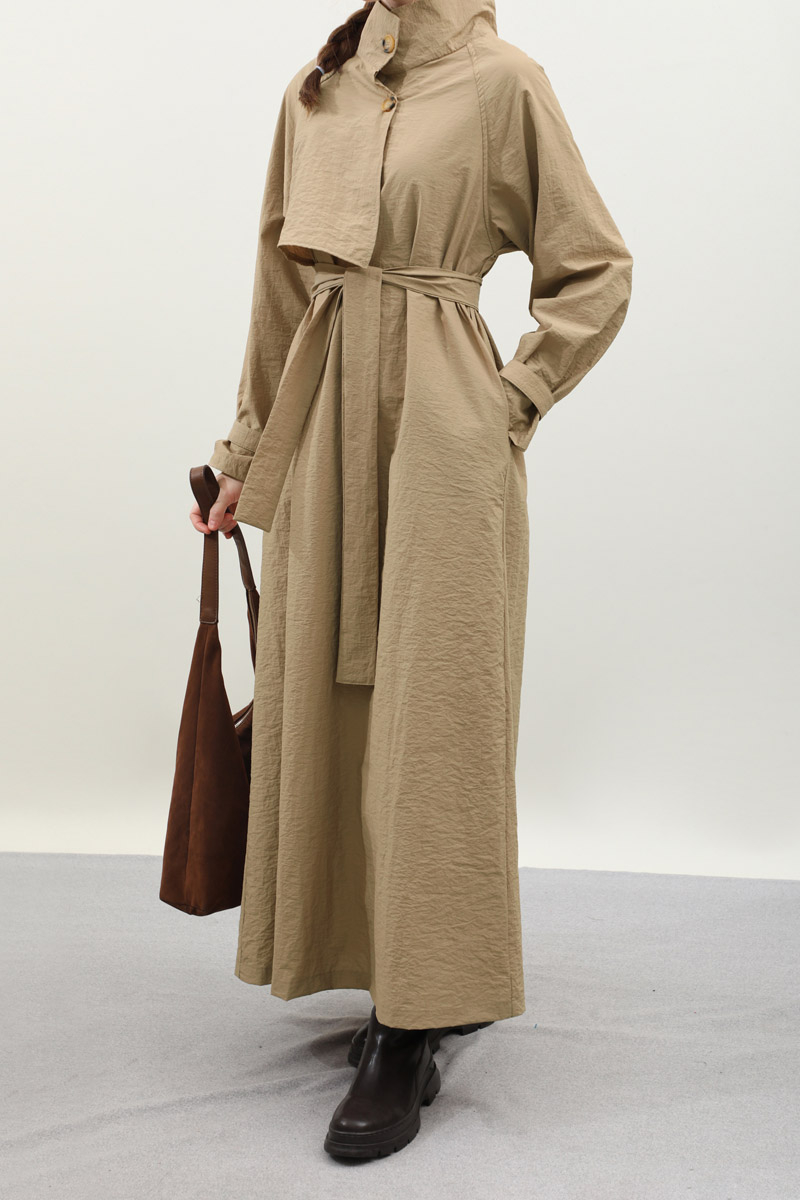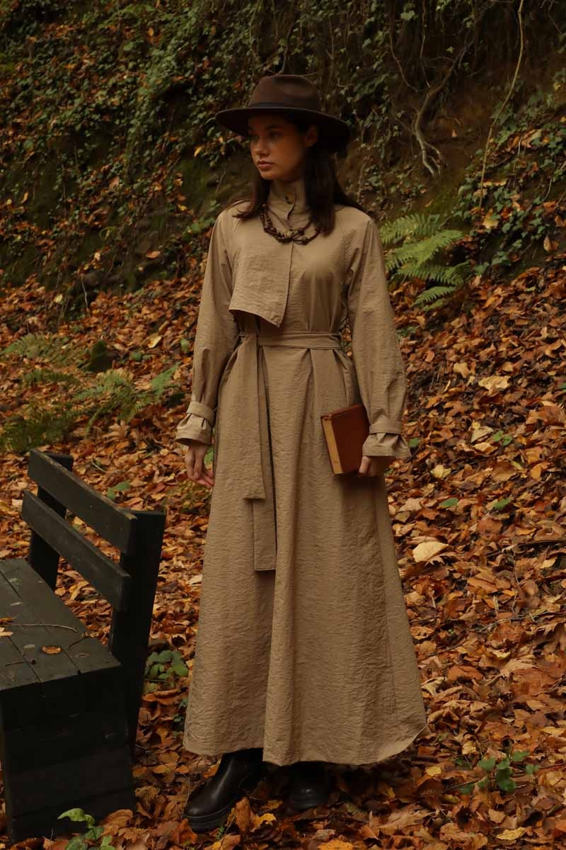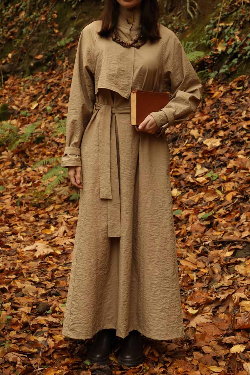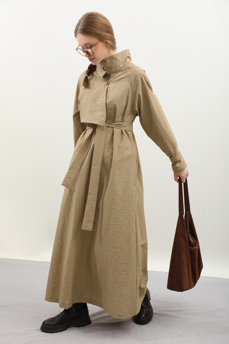 Yarım Rüzgarlıklı Paraşüt Elbise Camel. Balıkçı yakadır, önden düğmelidir, reglan kolludur, hareketli rüzgarlık detaylıdır, manşetleri ayarlanabilir kemerlidir, astarlıdır, yandan ceplidir, kuşaklıdır, Günlük kullanım ve özel günlerinizde tercih edebilirsiniz.