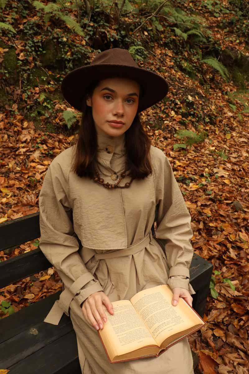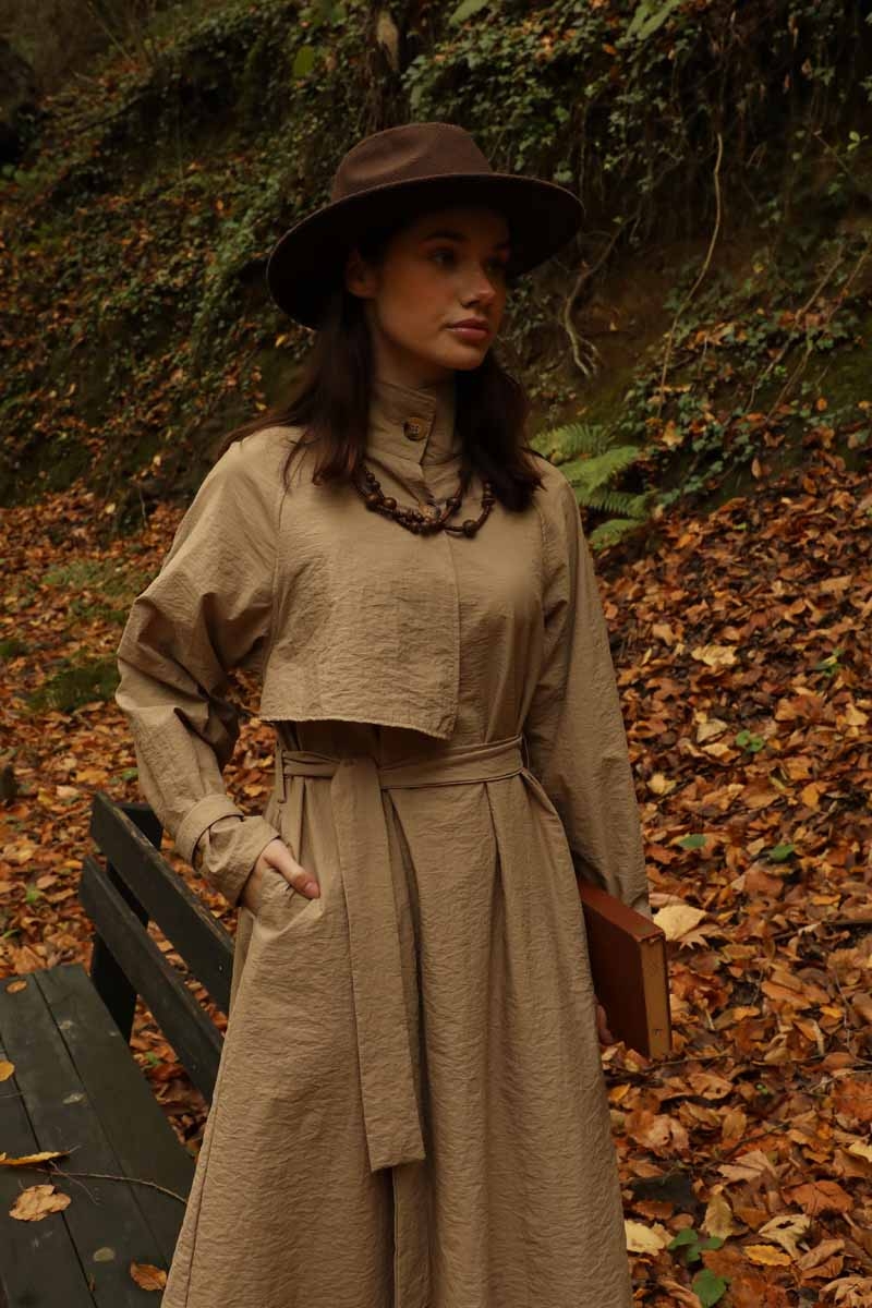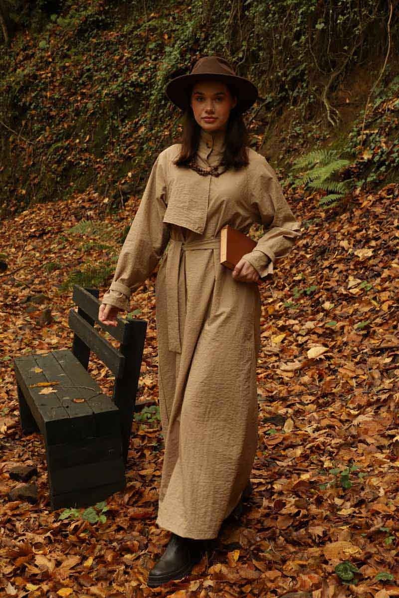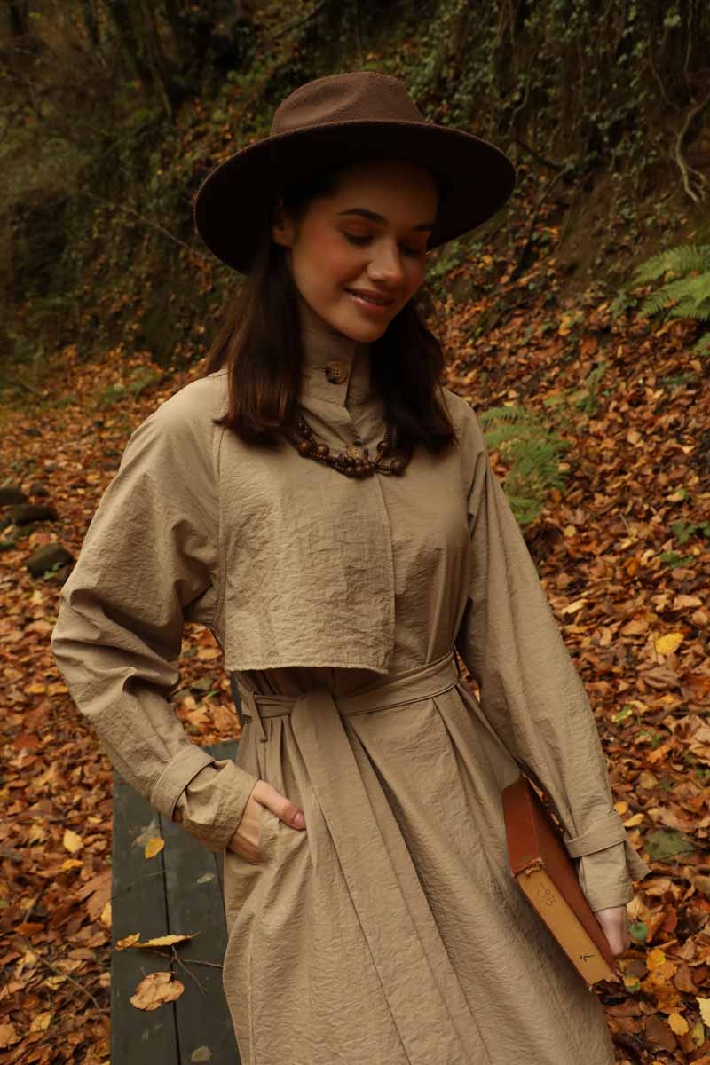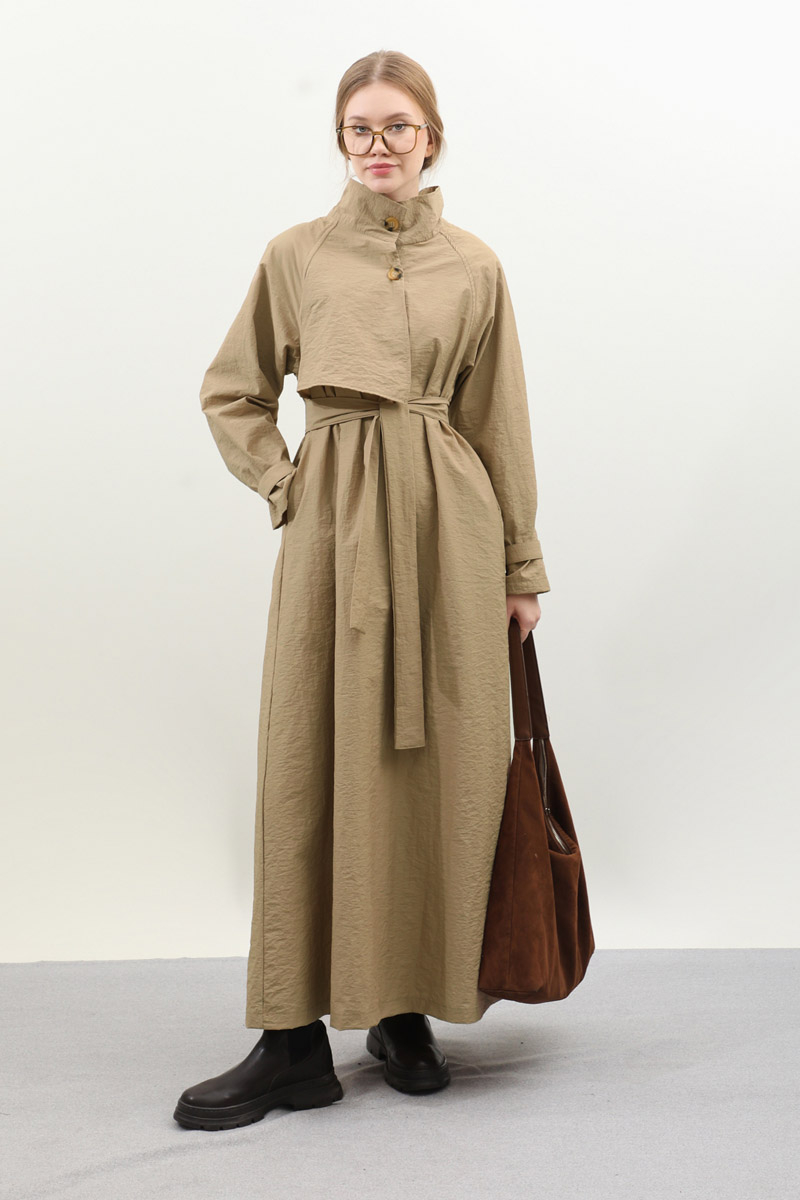 Yarım Rüzgarlıklı Paraşüt Elbise Camel. Balıkçı yakadır, önden düğmelidir, reglan kolludur, hareketli rüzgarlık detaylıdır, manşetleri ayarlanabilir kemerlidir, astarlıdır, yandan ceplidir, kuşaklıdır, Günlük kullanım ve özel günlerinizde tercih edebilirsiniz.